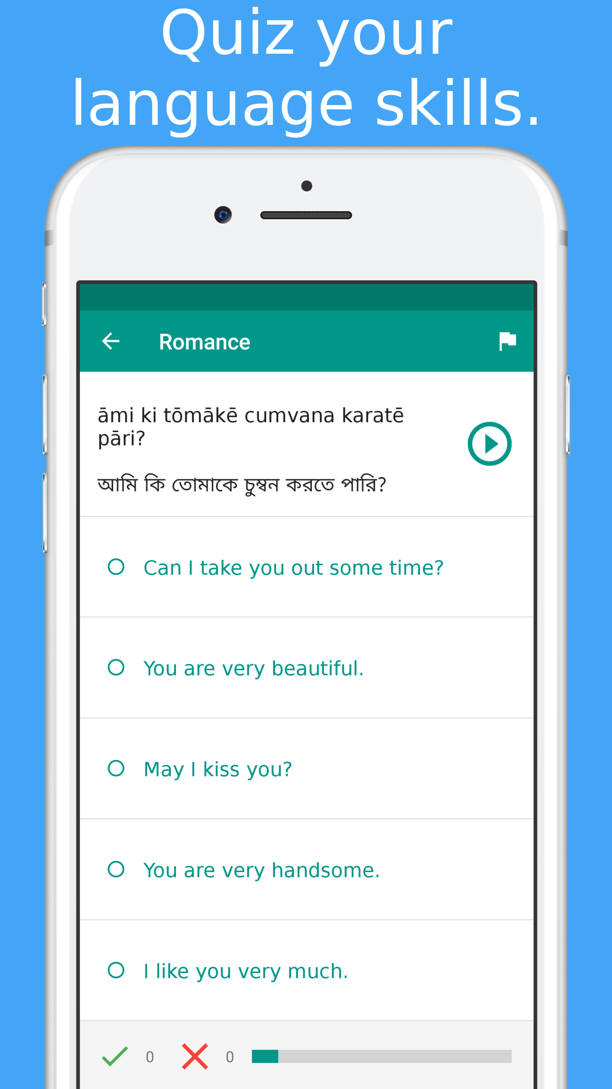 native speaker from Bangladesh.Save your favorite phrases and words to review them without fuss.Study your vocabulary with flashcards using the spaced repetition technique.Test your knowledge with fun Bengali language quiz and review your score.
