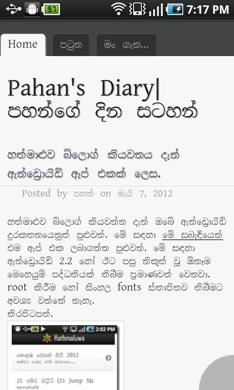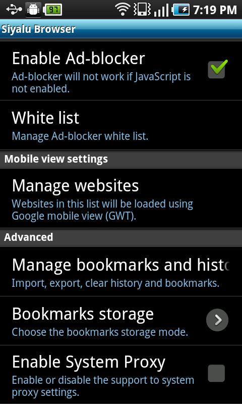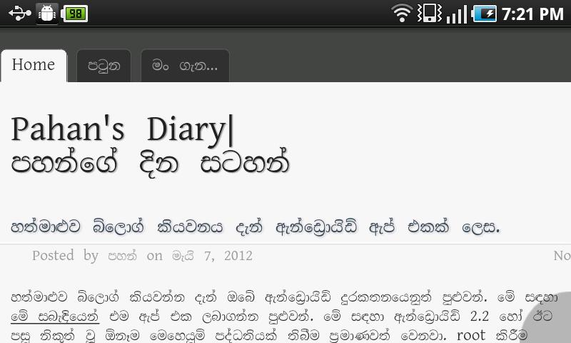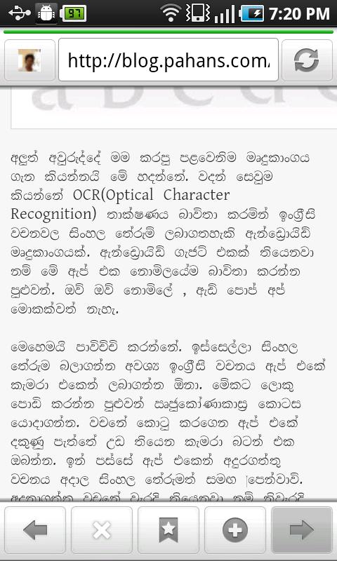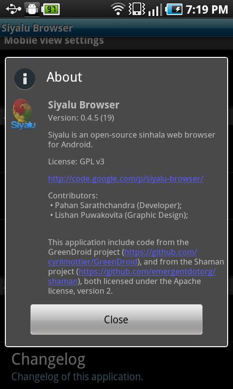 Browse sinhala web sites,blogs from your android device. it is free and it is open source. NO advertisements at all. *Perfect Sinhala text rendering without having to install fonts. *Basic browser features (bookmarks, history, downloads...) *Unlimited tabs *Easy bookmarks access *Easy tabs opening and closing *Bookmarks import from legacy Android browser *Can be set as default browser *Ad-blocker Found a bug? ---------------------------------- click "Email Developer" tell us what went wrong. want to support siyalu browser ? ------------------------------- *submit a review , share it among your friends on facebook, twitter and G+. Based on open source web browser zirco for siyalu browser's source code please visit http://code.google.com/p/siyalu-browser/