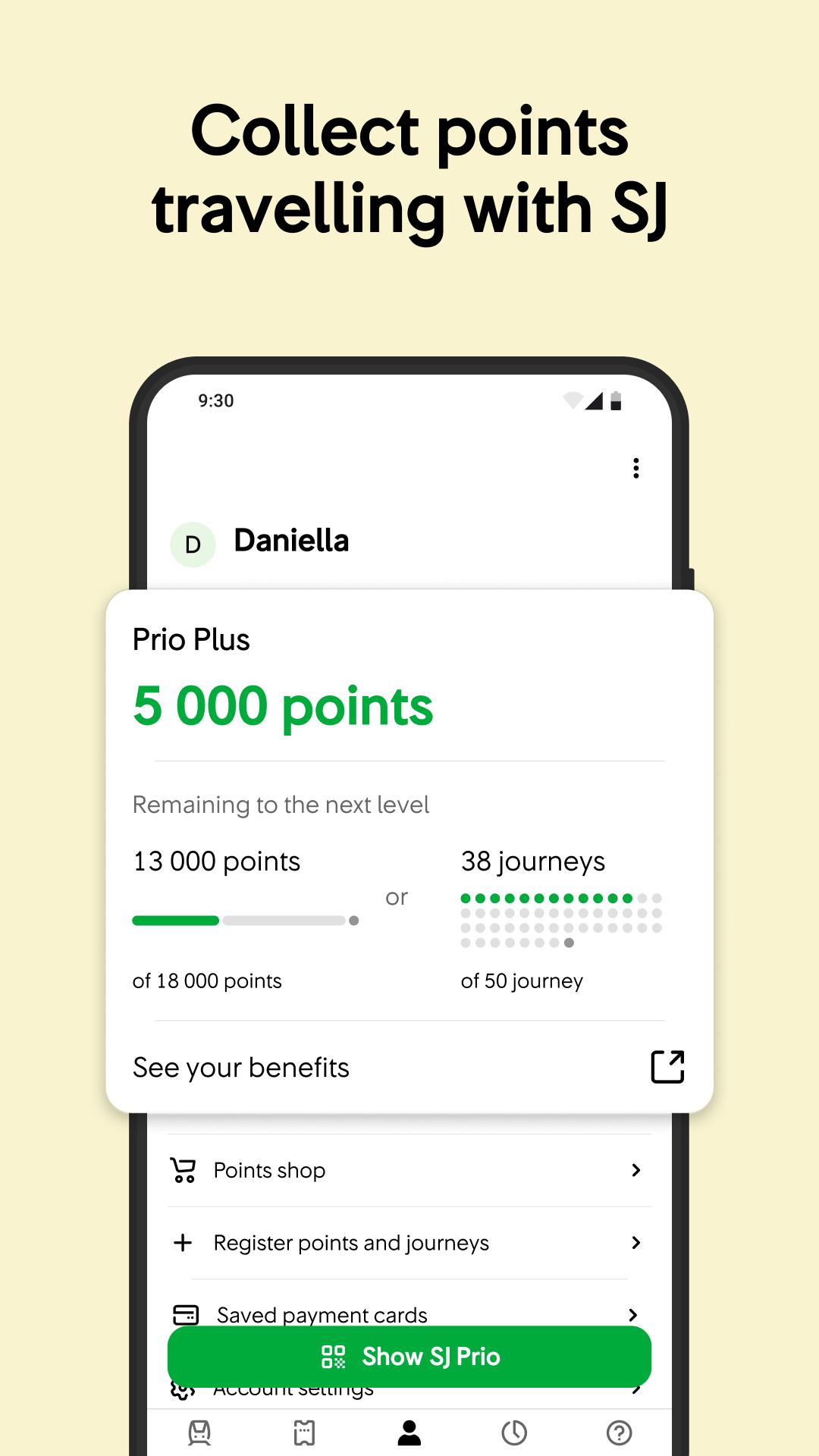 Buy train tickets, keep track of your journey and collect points when travelling with SJ. • See timetables and buy tickets for SJ trains and other Swedish train operators • Buy and re-new your commuter ticket • Keep track of your journey or commute in the travel mode • Receive notifications with traffic information affecting your journey or commute You can also: • Rebook or cancel your ticket • Make multiple seat reservations at the same time for your commute • Buy tickets for the local traffic to go to or from the train station • Become a member of SJ Prio • Collect points when travelling with SJ • See your points balance and points transactions • Register points • Receive unique member offers and discounts • Use your points for new SJ tickets • Rebook to an earlier or later departure, if your ticker is refundable or if you have reached the Black membership level • Pre-order food for you journey whilst you buy your ticket SJ (Swedish Railways) is a Swedish travel partner that offers sustainable train travel, both independently and in collaboration with others. As the market-leading train operating company, SJ links Sweden together, and opens the doors to Scandinavia's capitals. Every day, 140,000 people choose to travel on one of SJ's 1,200 departures from 284 stations.