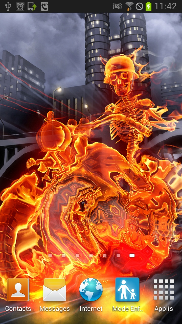 Download without delay "Skeleton Rider In Fire MagicFX" and try it quickly on your phone. "Skeleton Rider In Fire MagicFX" is an original and surprising Live Wallpaper with Animations and Special Effects. Animation : WATER RIPPLES EFFECTS Your screen becomes water simply passing the finger over. Touch or tap the screen for it becomes a water or a wave movement appears on the screen. More you touch the screen, the greater water ripple effect is important. After download: press long on the phone screen, choose the live wallpaper section and then choose your great new live wallpaper to set it on your screen :) Or you can to follow theses instructions : Home -> Menu -> Parameters -> Wallpapers -> Live Wallpapers Settings: - Activate or desactivate the water ripple effect in automatic mode. - Activate or desactivate the special effect on background, the flames with smoke. Features: - Live Wallpaper, - water ripples effects, particles, animation, - multi-touch effect, - support most resolutions including Android tablet, - support landscape and portrait screen mode, - use 3D hardware to render images, save battery Warning: This free application has a system of no intrusive ads. Our live wallpapers contain no icon ads and no notifications. Your phone will not be subject to any virus. All the permissions are required only for the ads and are handled by trusted providers. This live wallpaper has been tested on latest devices such as Samsung Galaxy S3, S4, Note, Nexus 7, HTC Desire S, Sony Xperia Z, Motorola Droid and Asus Prime Transformer. Don't hesitate to contact us by Email, if your phone is not supported or if you encounter any problems. We will respond to your request as quickly as possible.