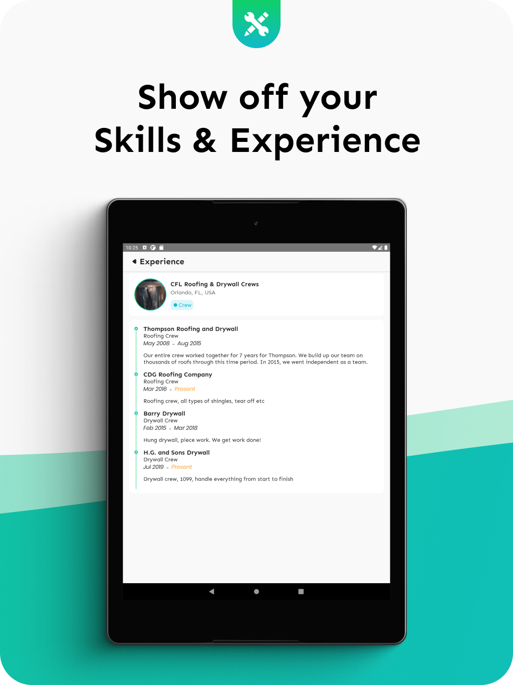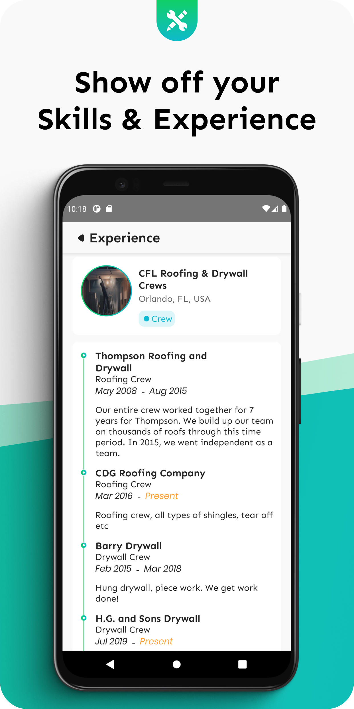 SkillSpace connects independent construction crews and individuals to companies looking to hire them. Keeping steady work can be difficult and scary. You’re qualified and professional, yet it still seems like you're always battling to get paid what you deserve. This is exactly why we've built SkillSpace. We want to give great contractors the ability to take control of their careers. Simply set up an account displaying your credentials, search local jobs, become immediately searchable by companies looking for what you have to offer, and even reach out to companies directly to offer your services. FEATURES: - Search: search through jobs and companies in your area. - Connect: Once you find a great company, connect with them directly. - Chat: Speak directly through the app using our English to Spanish translation features. - Share and discover: Share your work with the world by posting images and being found via our Discover feed. - Business networking: Connect with other businesses in your area to build local relationships and forge new opportunities. Why we’re different: We don’t believe that the fundamental way in which we go about finding work in construction is correct. We differ from apps like Indeed, Craigslist and ZipRecruiter because we aren’t based solely on job posts. While we do help you find open positions, we highly encourage reaching out directly to companies in your area to build real relationships. Even if the company you’re interested in isn’t necessarily looking to hire. Now this isn’t exactly a revolutionary idea. LinkedIn has proven this model for over 20 years now. The issues is, LinkedIn is built for engineers, marketers, lawyers, accountants, and salespeople. Not people who get their hands dirty. We’re bringing the luxuries of a platform like LinkedIn to the other half of the world. Creating a SkillSpace account is completely free To review our "Terms of Use", please follow the link below: https://app.termly.io/document/terms-of-use-for-website/e64162da-431a-4ac6-83c7-2cdda99cf6f4