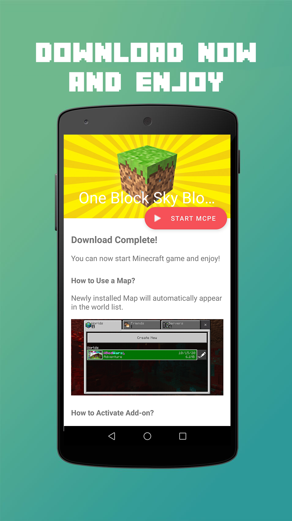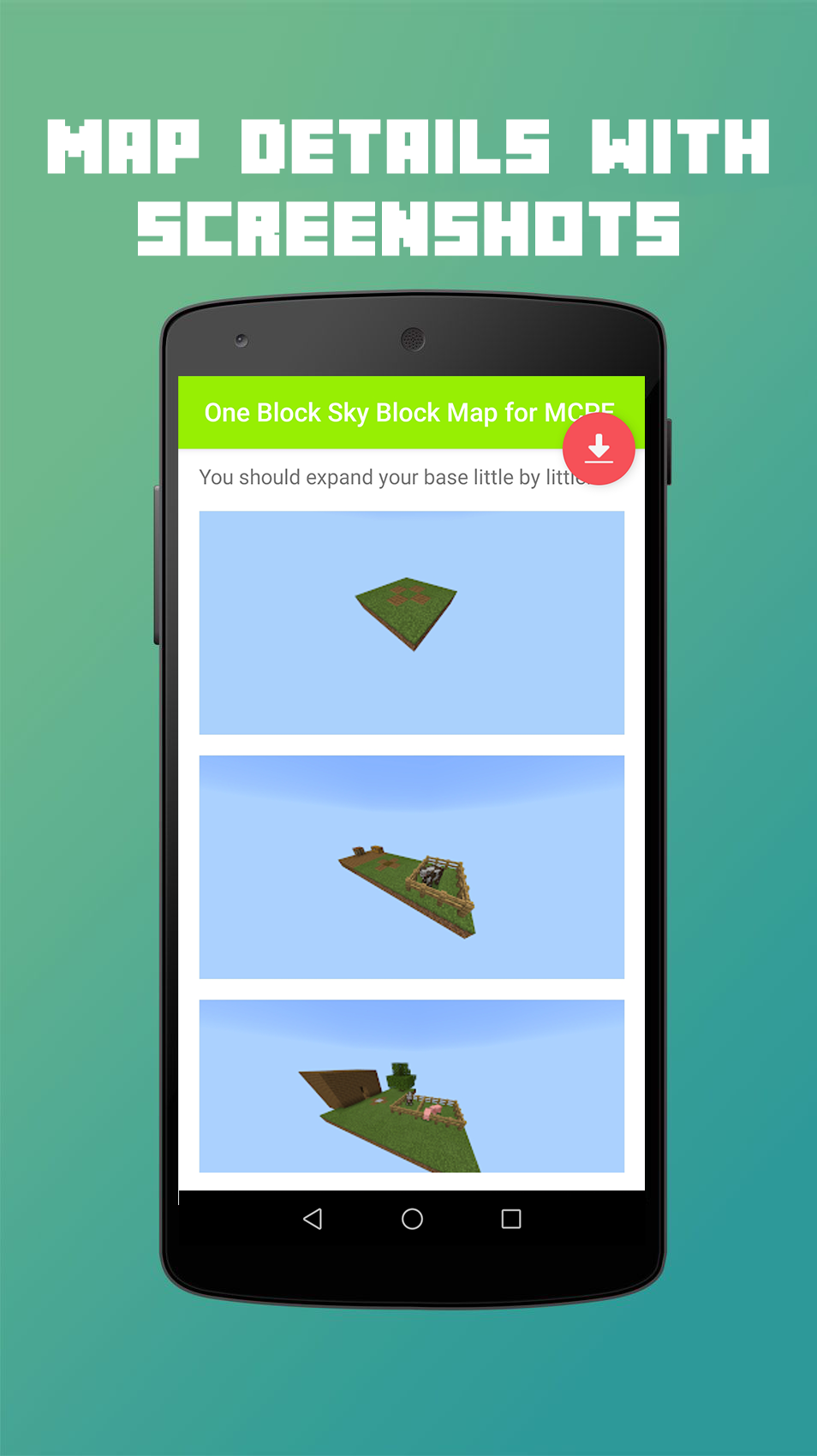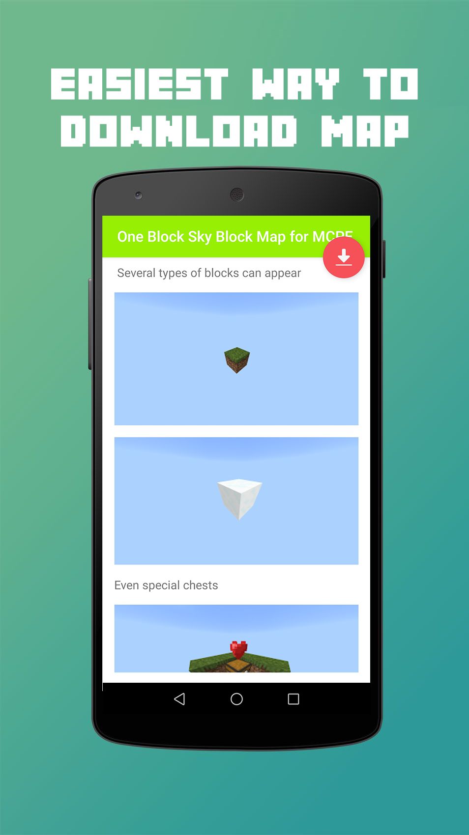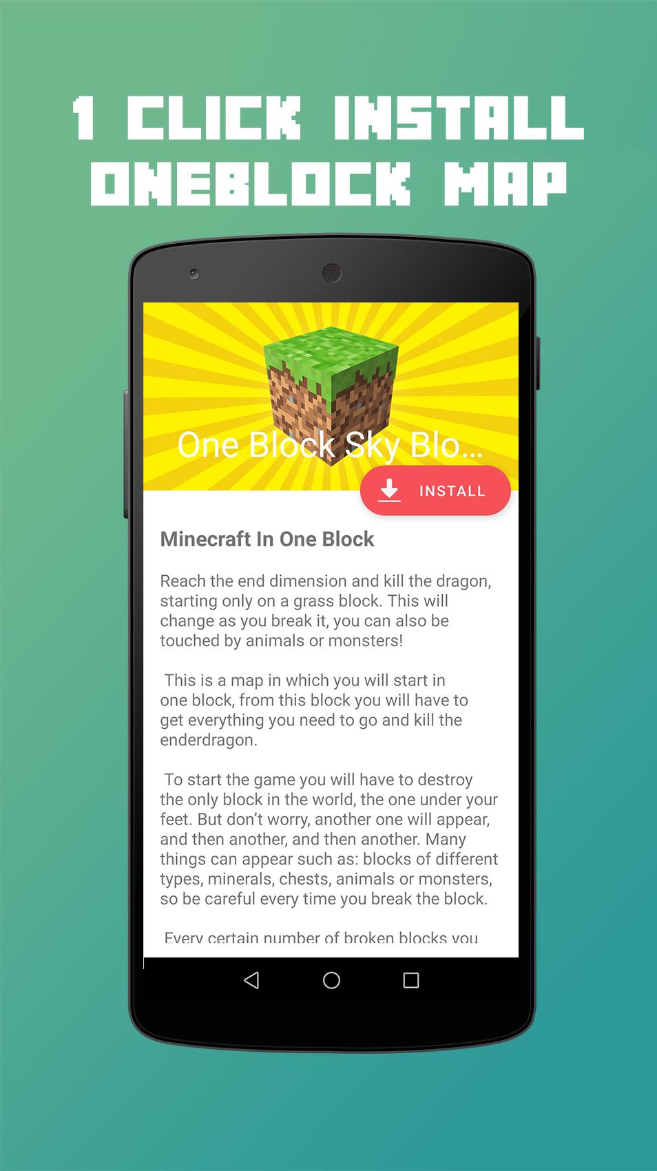 Are you looking for easiest way to install One Block map for Minecraft PE game? You sure are lucky, because this App is what you're looking for! One Block Sky Block Map for MCPE is an application that allowed you to download and install a fully functional One Block map for Minecraft Pocket Edition in just few easy step! With our 1-Click installer, you can easily get Minecraft Maps, Addons, Mods, Skins, and Texture Packs to your smartphone or tablet in only 1 single tap! Features on the app include: * Download & install MCPE One Block map in 1 single tap! * Map descriptions, screenshots, and how to play. * Map and Add-on activation guide. * Friendly user interface. * Always free! About One Block Map: In this Minecraft In One Block map you will start in one block, from this block you'll have to get everything you need to go and kill the enderdragon. You will have to destroy the only block under your feet! But don’t worry, another one will appear, and then another. At certain number of broken blocks you'll move to the next stage included Forest, Cave, Snowy, Desert, Jungle, Oceano, Nether, Mansion, Stronghold, Miscellaneous, and more. NOTE: * A full version of Minecraft game is required. * If you like our App, please rate us 5 stars and leave some reviews to support our team. DISCLAIMER: * This One Block Sky Block Map for Minecraft PE application is not an official Minecraft product, not approved by or associated with Mojang.