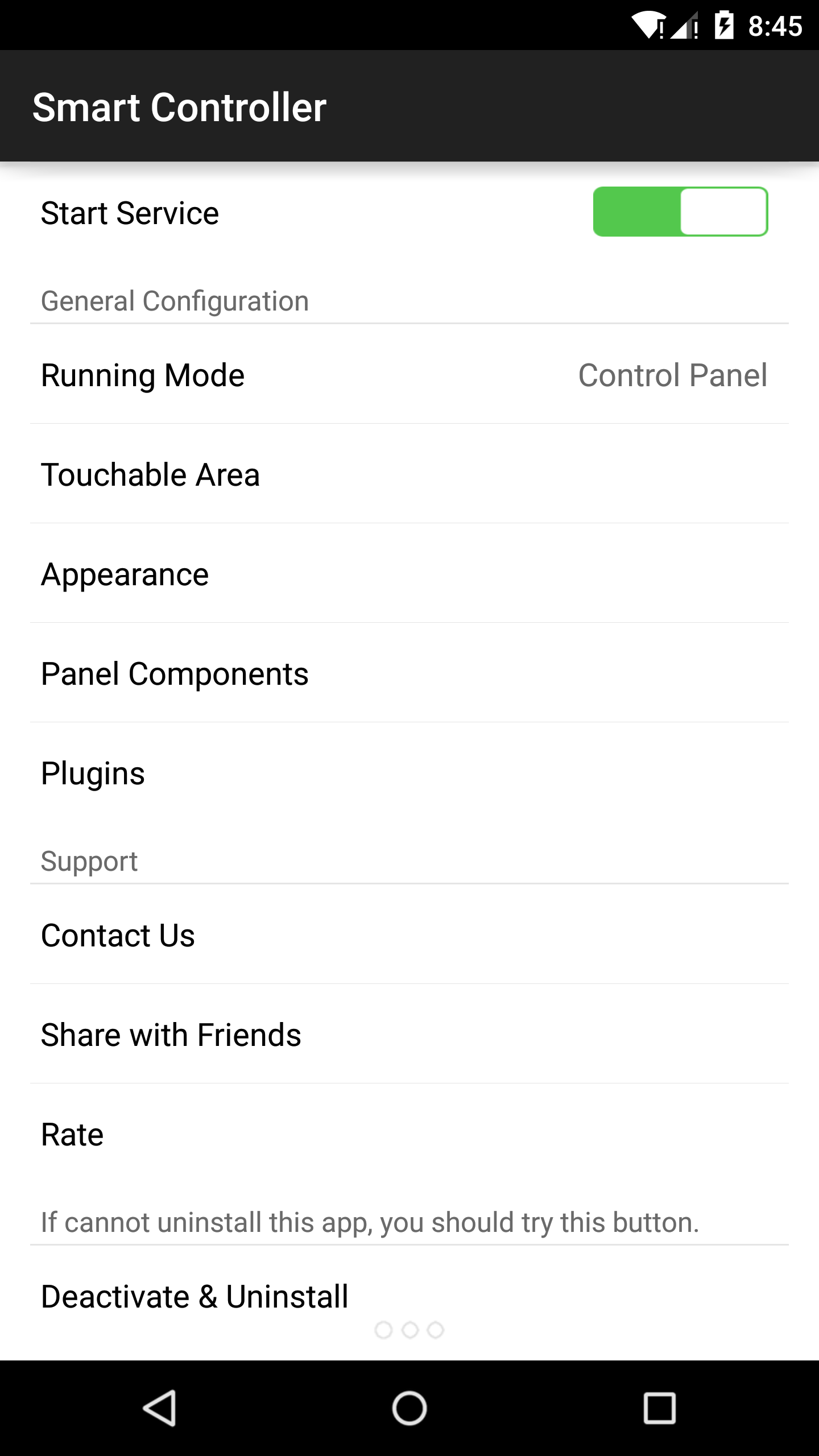 Note: If you meet any issue, pls don't just rate one star. We hope your email the issue to me, we will definitely feedback and resolve your issue ASAP. This is a powerful and easy-to-use assitive system tool, which supports to configure most of the Android functions. You can call it out at anytime during use of your phone just by one click or gesture slide; Especially, it provides so many running modes including Control Center, Assitive touch, PATH menu and RAYS menu that you should found the ONE you like. Feature List: - Supports toggles for most of the Android configurations, including WIFI, ringer mode, Bluetooth, VPN, vibration, GPS, brightness, data connection, automatic synchronization, rotation, volume, airplane mode, WIFI hotspot and etc. - Supports simulate HOME button, lock screen trigger, expand status bar, recent tasks, etc.; - Flashlight; - One click to clean memory, game boost; - Music controller, which supports most of the popular music players; - Shortcuts to launch the specified application or function; - System status monitor: memory info, SD card info, system load info, battery info, unread SMS and missed call, etc.; - Sleep mode, which can block the disturb during your rest and will not miss the important calls; - Multiple running mode: Control Centrer, assitive touch, Path menu and rays menu; - Customization of shortcuts, toggles, operation style and also, many icons and themes. FAQ: If you met uninstall problems, please try to uninstall it in settings of this app.