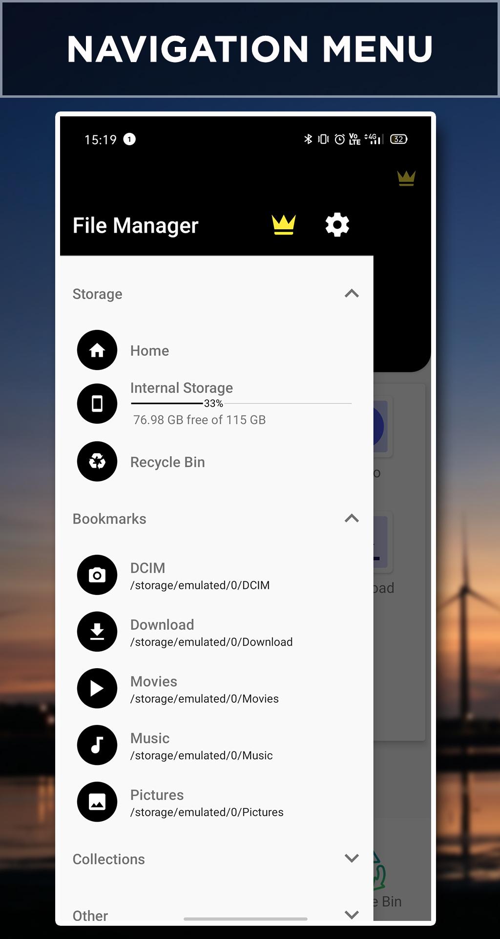 ThemeThe file manager/ file browser app provides a light and dark-colored in-app background. Also, users can change primary colors, accent colors, and color of status and navigation bar.