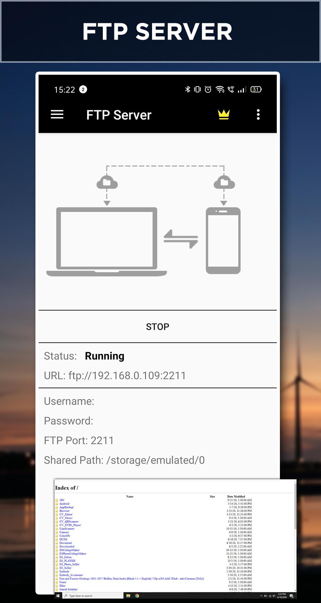 FTP ServerIn this file explorer app, you can access your android device storage from a PC and manage all your files through File Transfer Protocol (FTP) in this File Browser App.