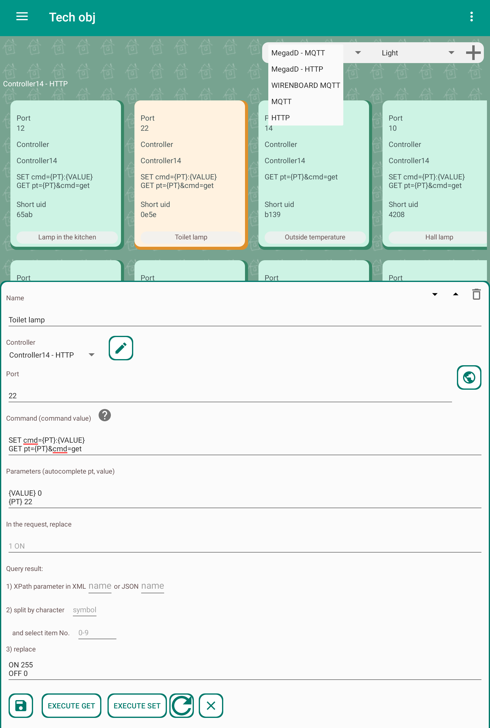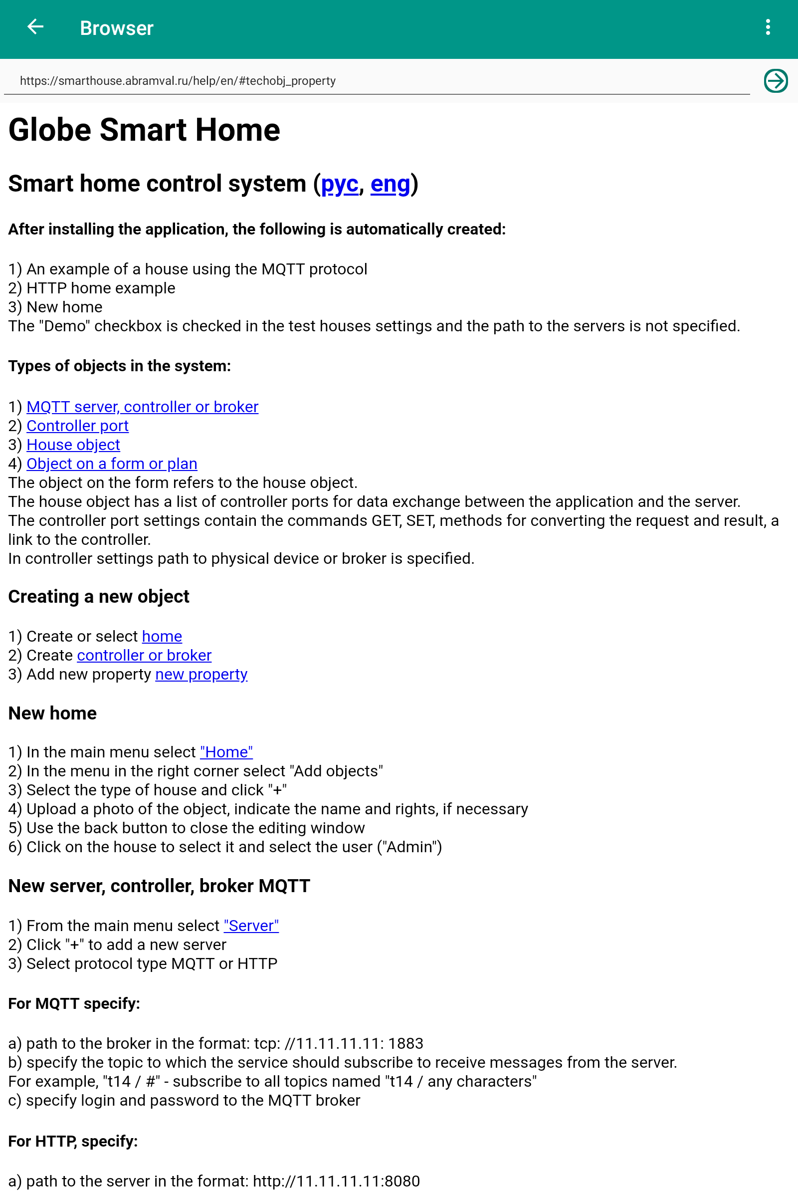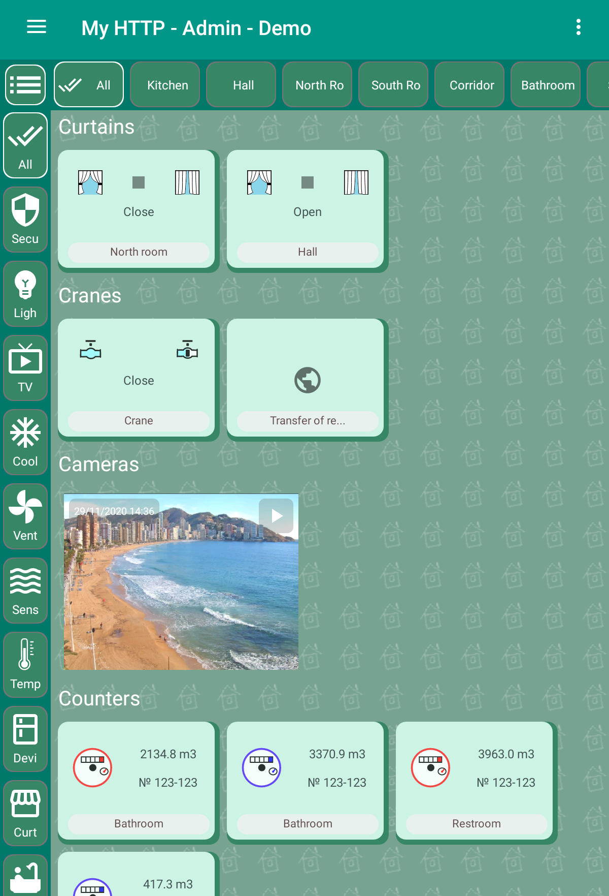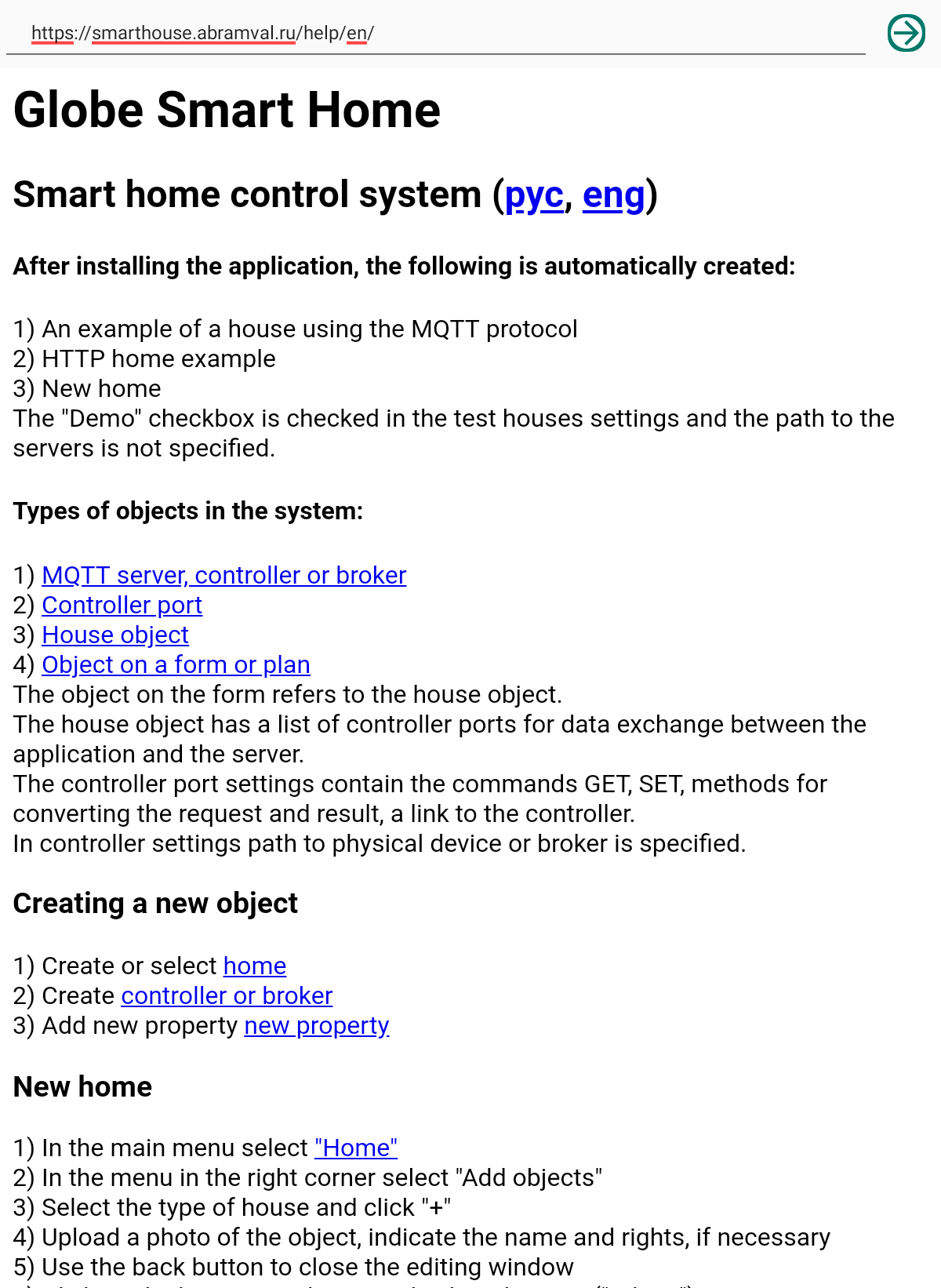 Smart home "Globus" - control of any devices via MQTT and HTTP protocols: 1) Control of light, curtains, cranes 2) Macros, programs, schedules 3) Schedule according to the position of the sun, for example, closing curtains 4) Cameras using the MGPG protocol 5) Charts 6) Voice control The server runs in the background even if the application is stopped. It executes macros and programs, stores values for displaying on graphs. Device support: lamp, dimming lamp, LED strip, TV, air conditioner, fan, lock, guard, siren, curtain, blinds, faucet, water meter, gas meter, kettle and other devices. Supports sensors: temperature, humidity, pressure, leakage, current, CO2, PM2.5, PM10, smoke, fire, motion, opening a window or door, lighting. The user can create programs: "Left", "Arrived", "Night" and others. Motion sensor macros. Objects can be displayed on house plans or as a list. An unlimited number of HTTP servers and MQTT brokers can be configured. Password authorization for the MQTT protocol is supported. In the program, you can create several houses and for each set up the rights and roles of users: "Admin", "User", "View only". Any object can be hidden for a specific user. You can set the time for updating the state of objects. Data is updated instantly via the MQTT protocol. If the value exceeds the allowed interval, a message is issued. For example, when the "Leak" sensor is triggered. Templates have been created for MegaD controller objects. The user only needs to specify the port number and the device works! Convenient controller setting is built in. There is a template for Wiren Board devices. After flashing, you can connect Sonoff (not tested yet). In the next version: 1) Cameras via RTSP protocol 2) Video intercom 3) Underfloor heating control 4) Templates for other controllers