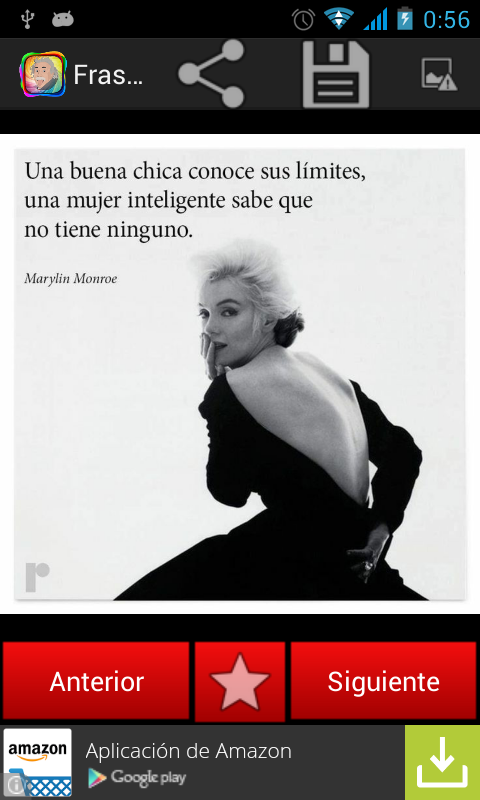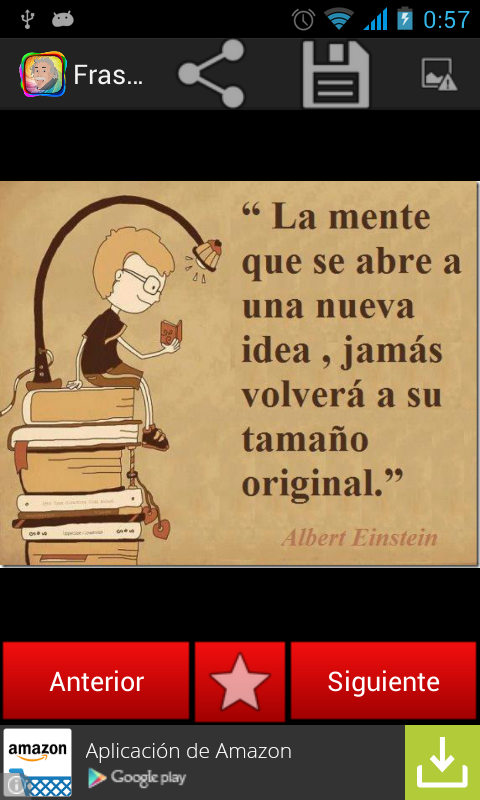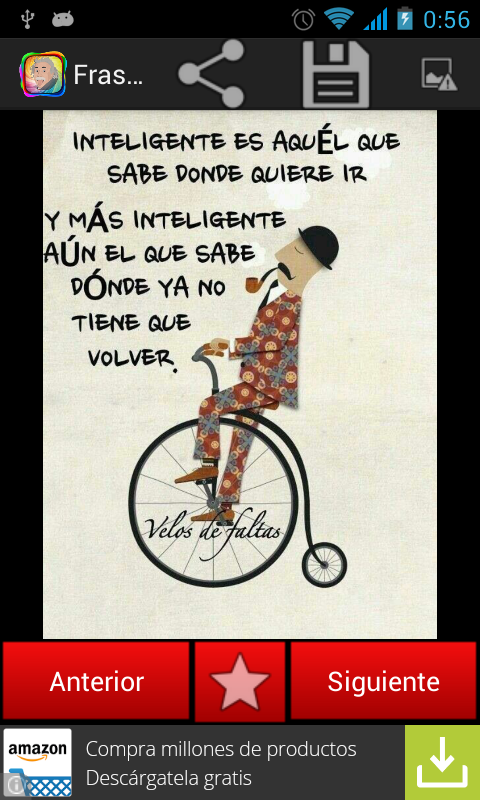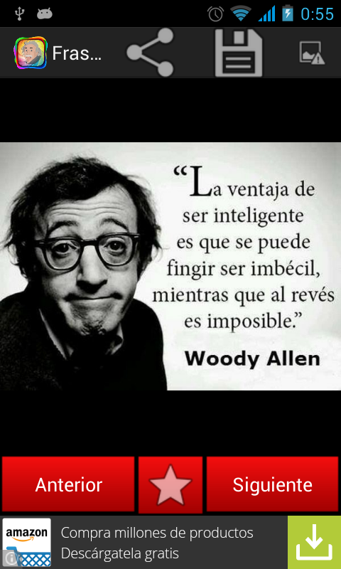 In this app you will find smart quotes, phrases and famous quotes from hundreds of leading personalities in science, arts, politics and philosophy. Make everyone see how much smart you are with these clever phrases about life, using this simple app. The famous quotes and smart quotes can serve to brighten, surprising or even flirt with anyone you want. You can share quotes and quotes by Whatsapp, Myspace, Facebook Messenger, Telegram, SMS or any program you have on your mobile. If you want to surprise your boyfriend or girlfriend, the boy or girl you like, to your partner on your anniversary, at any specified date or valentines, download this free app with hundreds of smart quotes from great personalities. A personalized and original way to get along with anyone, or even want to tell you differently. Any occasion is good to share a clever phrase and to show others you know use your brain :) We are sure you will love, best of all, you do not have to think about which words to use, as you will find more quotes and more famous phrases of reflection about life, human beings, love and many other issues, everything so you just have to send them and look great. Key features of "Smart Phrases" application * Share Intelligent phrases with whom you want most using Whatsapp, Facebook, Myspace, Twitter or any program installed on your phone. * Super easy to use, very intuitive. * Add any image you like as wallpaper for your mobile. * Save any image to your phone, so you'll have it forever! * Completely Free, no records of any kind If you liked it, please let this app will value a good score and typing this comment. Every vote helps us improve each day to keep adding new content!