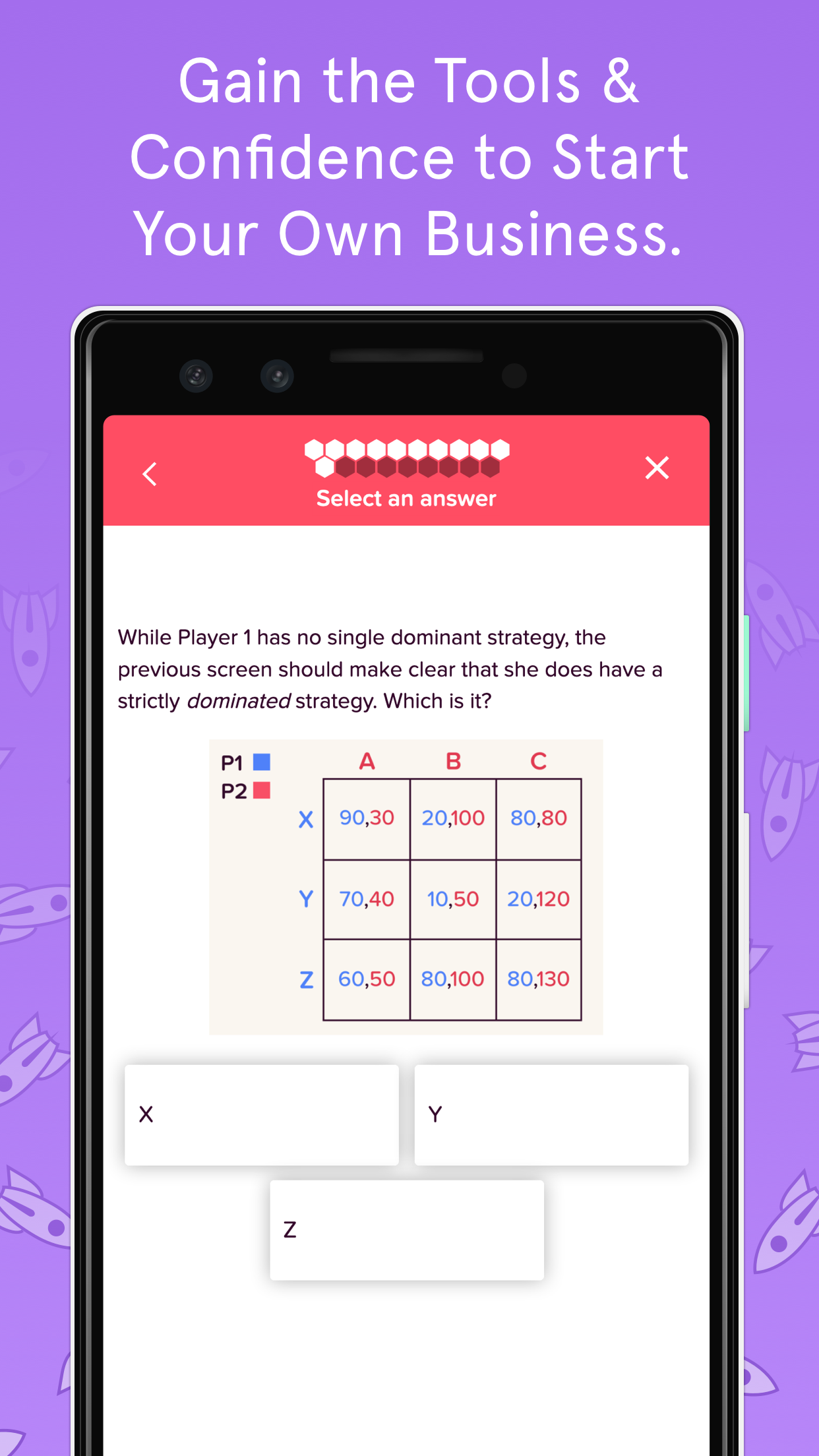 Smartly offers a highly selective MBA degree with courses in Finance, Marketing, Management, and Entrepreneurship that is completely free for admitted students. Each course is delivered in the Smartly app on your mobile device or computer.