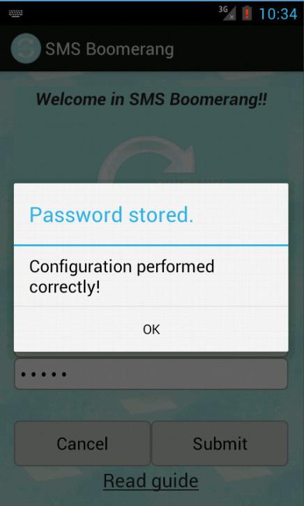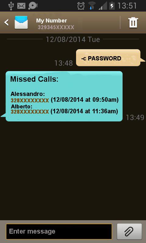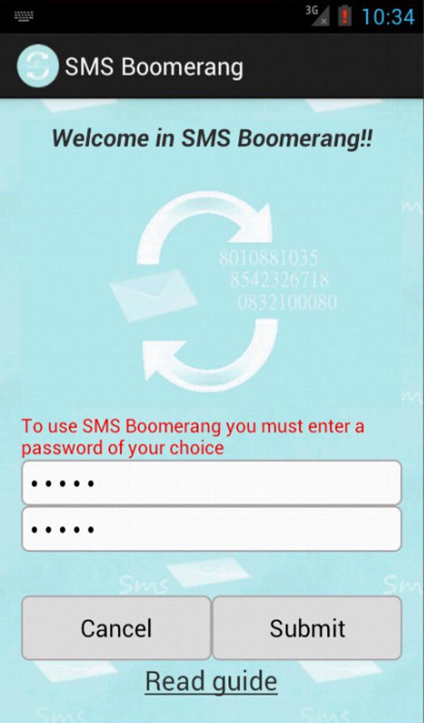 SMS Boomerang is a fabulous app that gives you the ability to control your phone from any other phone by sending an SMS. You left your phone at home? You've lost your phone? You do not have to worry about! How do I configure? Install Boomerang SMS on your phone and set a password at least 5 characters. Got it !! Note:Don't need to install it on the other phone List of commands (given by another phone): 1) name_to_find password Sends you the number of a contact in the address book (The research will also work with a part of the name) 2) -c password We'll send the list of missed calls 3) -m password Send you of unread SMS 4) -v password Turn off the vibration and turn up the volume to maximum (Useful when you do not find the phone) 5) -b password Informs you of the status of the battery 6) -w password Turn on the WIFI 7) -h password Turn off the WIFI 8) -g password Finds Your Phone (with GPS and Network) 9) -d password Enable Data Connection 10) -e password Disable Data Connection 11) help password (Function GUIDE) will be a list of commands NB: you always put a space before the password There is still no clear ?? We do a few examples: Ex.1: I have to look up the number of Andrea and the password is saved misticus SMS to send: Andrea misticus Ex.2: I have to look up the number of Marco Rossi and the password is saved misticus SMS to be sent: Marco Rossi misticus Ex.3: I need to find the last missed call on your phone and your password is saved misticus: SMS to be sent: c misticus Ex.4: I have to find him on the phone last unread messages and the password is saved misticus SMS to send: -m misticus Ex.5: I can not find the phone in the house because the ringtone is low SMS to send: -v misticus Ex.6:I've lost my phone. SMS to send: -g misticus