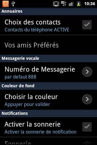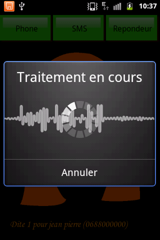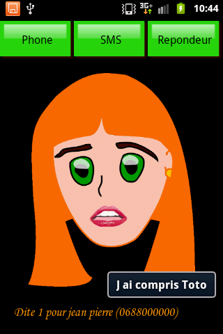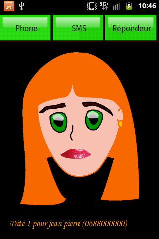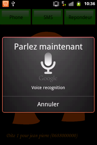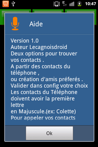 l application a plusieurs utilisations : - appeler ses amis par la voix - dicter des SMS - consulter sa messagerie vocale . L'outil utilise l'annuaire du téléphone ou un annuaire d'amis privés. Le paramétrage doit être fait dans le menu configuration NOTA : Les contacts du Téléphone doivent avoir la première lettre en Majuscule.(ex: Colette). Pour appeler vos amis préférés dite le chiffre correspondant.(ex: 1 pour le premier). Possibilités de modifier les couleurs du fond , et de paramétrer votre messagerie vocale Le moteur Pico TTS doit être installé , et le service de reconnaissance vocale actif. sinon les boutons seront inactifs.
