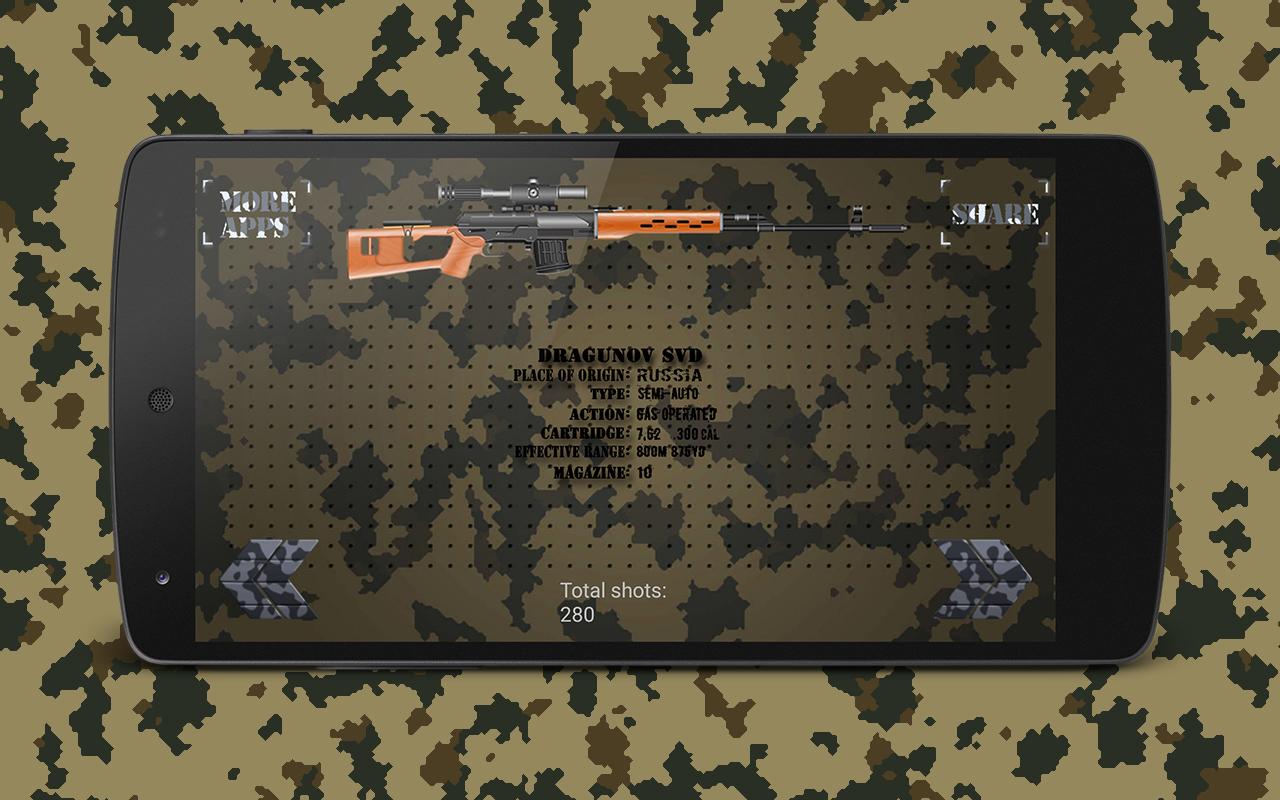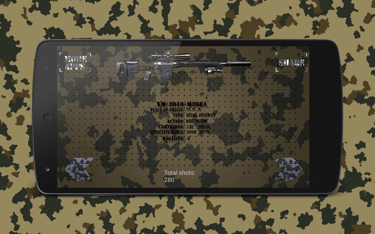 Looking for a sniper shooting simulator? Here is the collection of most powerful snipers in the world with their detail, information, sound and bullets! If you are interest in modern sniper rifles and you might also wanted to know which caliber, effective range, type, magazine size they have, this app is just for you! In this app you can find a lots of popular military and special forces snipers with different caliber, sound, power! The application contain the most effective sniper rifles in the world : Weapon Included; - M110 .300cal 7,62Nato semi-auto sniper (USA) - Barrett M82 .50cal beast 12,7mm anti-material rifle (USA) - L115a3 .300cal 7,62Nato bolt-recoil. (England) - Dragunov SVD 7,62mm (Russia) - AS50 .50cal 12,7mm (England) - M26 .300cal 7,62mm (USA) - XM2010 M26e1 .300cal 7,62Nato (USA) To play you only need to chose a rifle, pull the trigger and you'll hear different sounds of shots! If you run out of bullets just click on reload button and ammo will reload automatically. Shells will drop down realistically! The application is completely free and does not require the Internet connection! Download with friends , play in the war at home , in the car, in the yard and elsewhere. --Features-- * Sniper Information and detail * More then five most used Sniper in the world * Shell drop down realistically * Offline access to lots of guns * Realistic Sounds * Easy to use interface. About Sniper rifles: Sniper is the deadliest weapon on the battlefield. In military and law enforcement terminology, a sniper rifle is a precision-rifle used to ensure more accurate placement of bullets at longer ranges than other small arms. A sniper is a highly trained marksman who operates alone, in a pair, or with a sniper team to maintain close visual contact with the enemy and engage targets from concealed positions or distances exceeding the detection capabilities of enemy personnel. Snipers are especially effective when deployed within the terrain of urban warfare, or jungle warfare. Any content not owned by this developer belongs to their respective owners. If there is an issue with this app contact us via the email address.