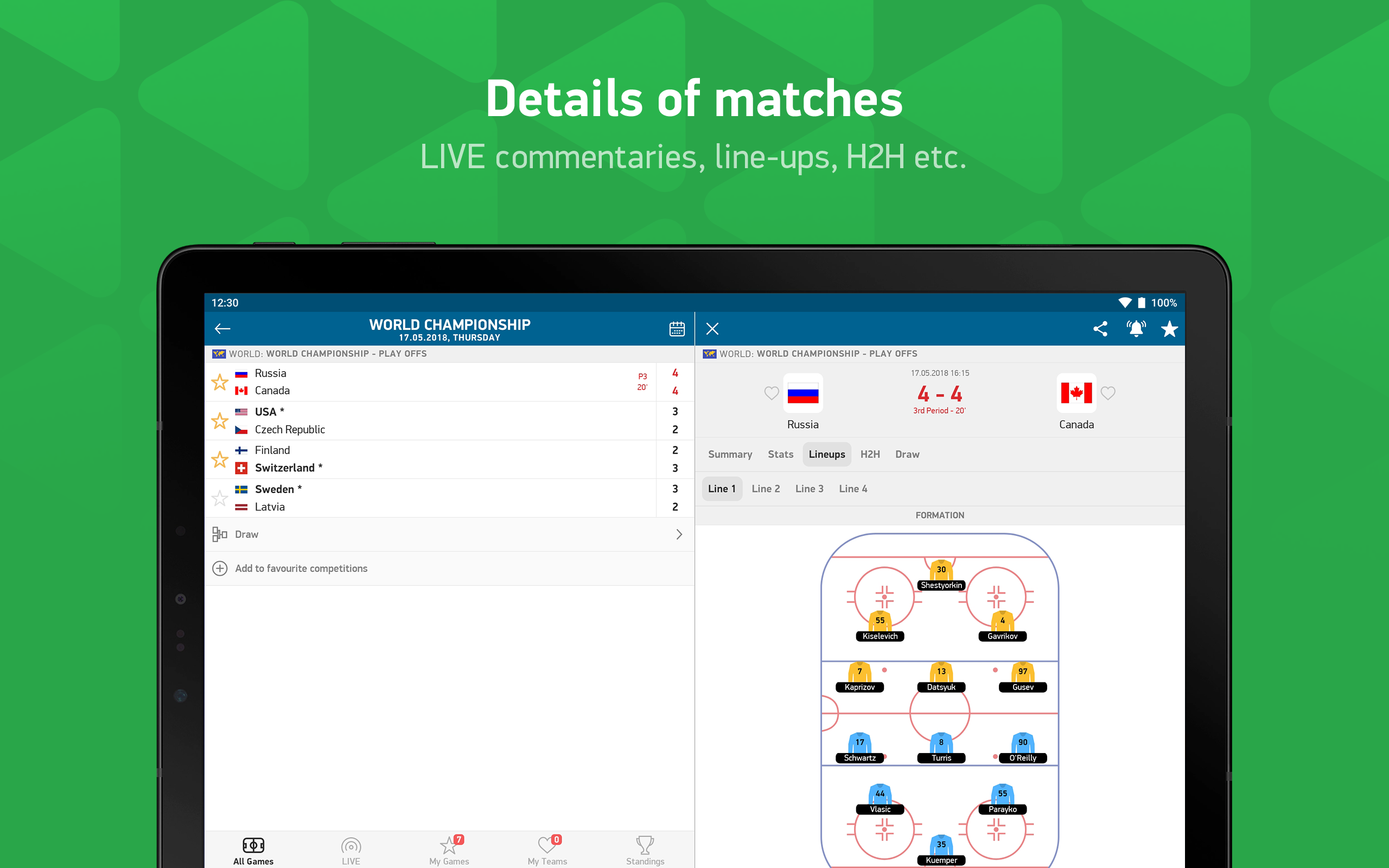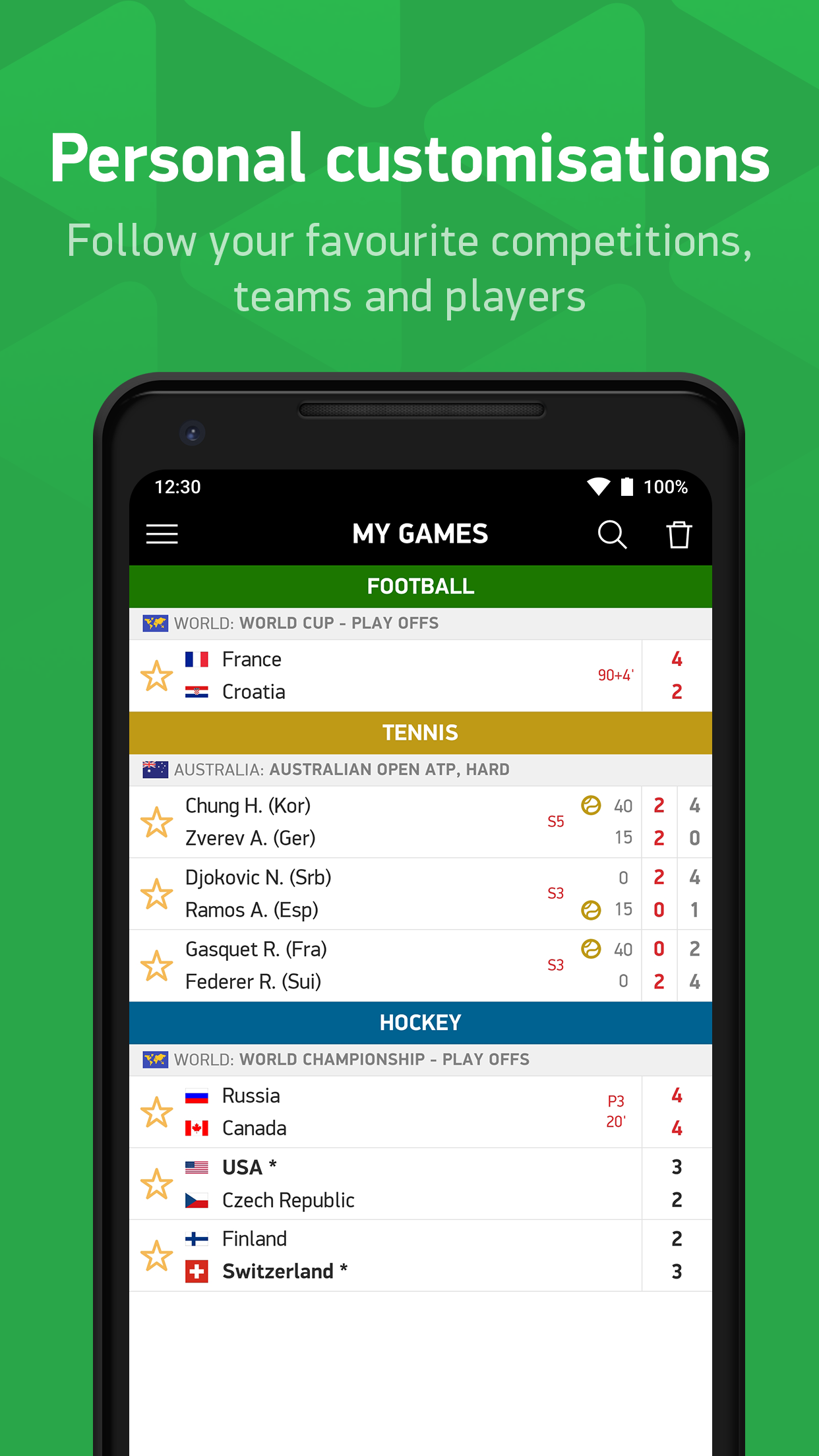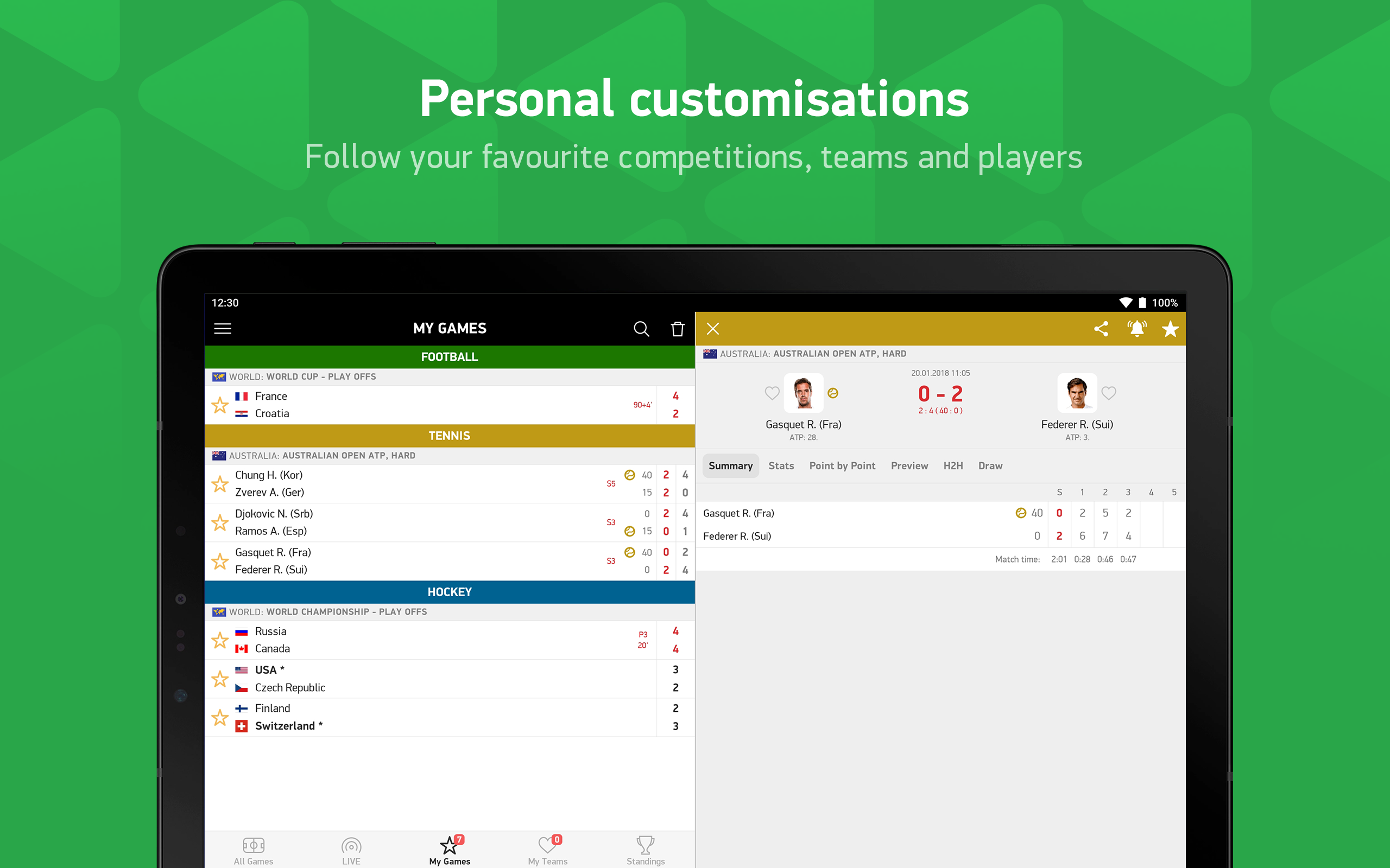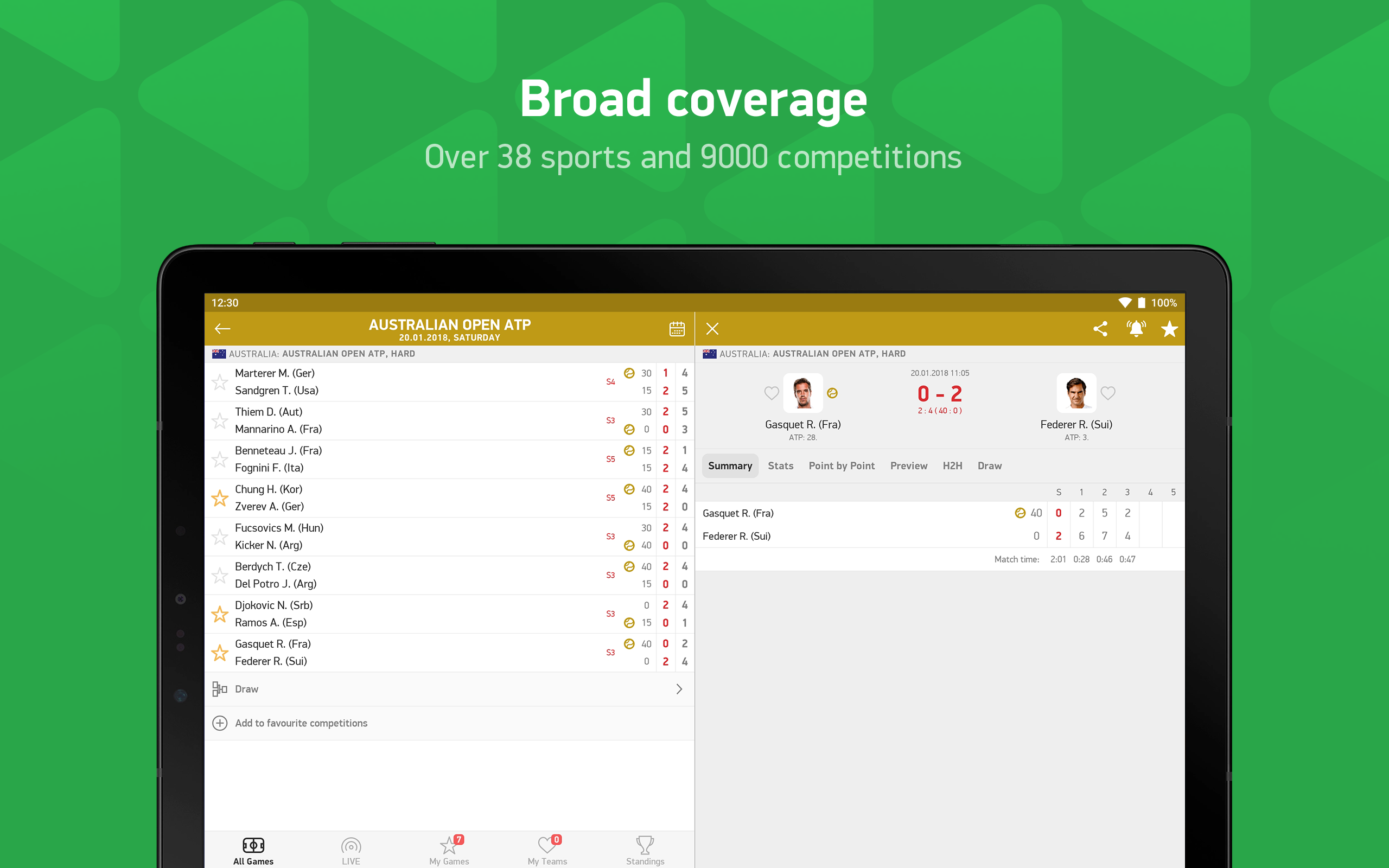 Stay in touch with everything you love about sport. With the Soccerstand app, you are always just one touch away from the fastest possible LIVE scores, stats, competition tables and draws from nearly 30 sports and 5.000+ competitions worldwide. FAST AND ACCURATE SCORES • GREAT COVERAGE: We cover nearly 30 sports and 5000+ competitions worldwide. You can follow 1000+ football competitions alone! • SPEED: Whether a goal is scored, red card issued, set or period is over, you will know at the same time as the live audience. NO MORE MISSED MATCHES • FAVOURITE TEAMS, MATCHES AND COMPETITIONS: Don’t waste your time, and follow only your favourite matches, teams and competitions. • NOTIFICATIONS AND ALERTS: Results, line-up info, red cards… You will not miss any of it. Just select your matches and wait for your mobile device to let you know. • STAYING IN SYNC: A: Do you like to switch between your computer, mobile and tablet? We are prepared for this: as a registered user you will see all of your personalized data across all your devices. TABLES AND MATCH DETAILS • MATCH COURSE AND LIVE COMMENTARY: Unable to watch the match on TV? No problem: follow it second by second and stay up-to-date with our LIVE text commentaries. • LINE-UPS AND HEAD-TO-HEAD: Do you need to know the line-ups before the match starts? We have them in advance. And also the head-to-head history so you can check how both teams have played against each other in the past. • LIVE TABLES: One goal can change a lot. Our live tables will show you if a scored goal has changed the league ranking, as well as the current top scorers table. SPORTS COVERAGE Soccer, tennis, basketball, hockey, rugby and 25 other sports. Do you miss your favourite sport here? It may change soon - we are continuously widening our sports portfolio!