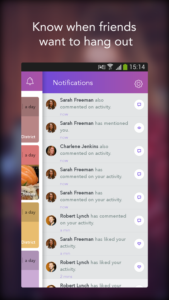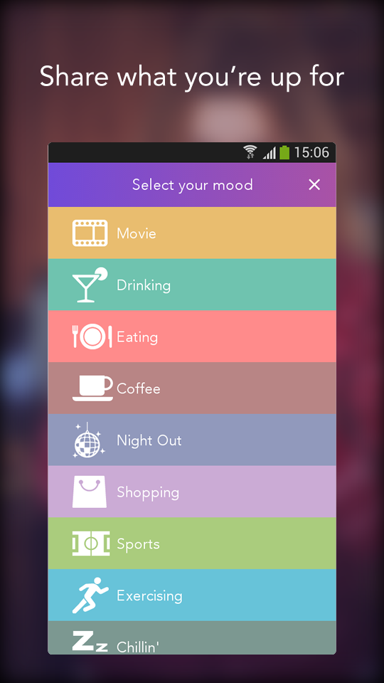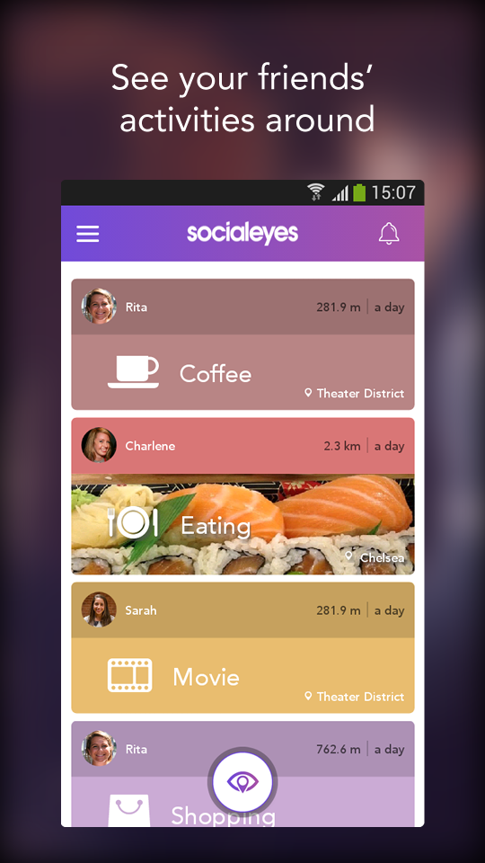 Everyone wants to meet new people around and chat to them as long as they are in the same mood! Socialeyes proudly enables you to do so. How? Share your mood and set a meeting with the people around. With only 3 taps, you let people around you know what activity you want to do and set a meet up spontaneously. Yes, this is a date! We also provide you the opportunity to chat through your devices and establish your meeting beforehand! Find each other, meet, chat and make new friends to join you! What can you do with Socialeyes: • Share your plans for an activity and find friends to join you on the go • Get notified when your friends are nearby or up for some activity • Discover new and interesting people nearby, establish a date • Find and meet those new people nearby, see their moods and chat to them • Earn social points and challenge your contacts on leaderboard Through this path, Socialize perfectly enables you to set up a meeting, find friends and go out for a date! We strongly recommend you to use Facebook login, because Socialeyes is way more fun and useful with friends and Facebook login is the best way to make sure you connect with your contacts. Your privacy matters to us more than anything, which is why we designed this app to respect your privacy concerns and needs. You are always in control of the sharing options and you are always asked to share your Socialeyes content in your other social networks. We need your location so that you can socialize with the people around. You can always turn off the location services inside the app. As long as the location services are on, your chances of running into a friend is much more. You can join your friends’ activities and earn great amount of points by being a social person. Whenever you feel like you are up for something simply create your mood and start a conversation below the activity or chat with your contacts directly in the app. If you feel you are not in the mood to be creator of an activity, simply observe your friends: if they are in the mood for grabbing a cup of coffee, you'll receive a notification so that you can join them. Socialeyes is also a great way to find new people to hang out with. Check your newsfeed and you might spontaneously run into someone who is up for an activity that you’d be interested in. So, what are you waiting for? Go out there, meet new people, see your friends and enjoy your spontaneous meeting!