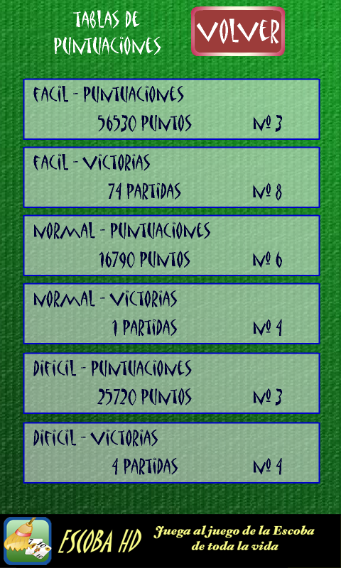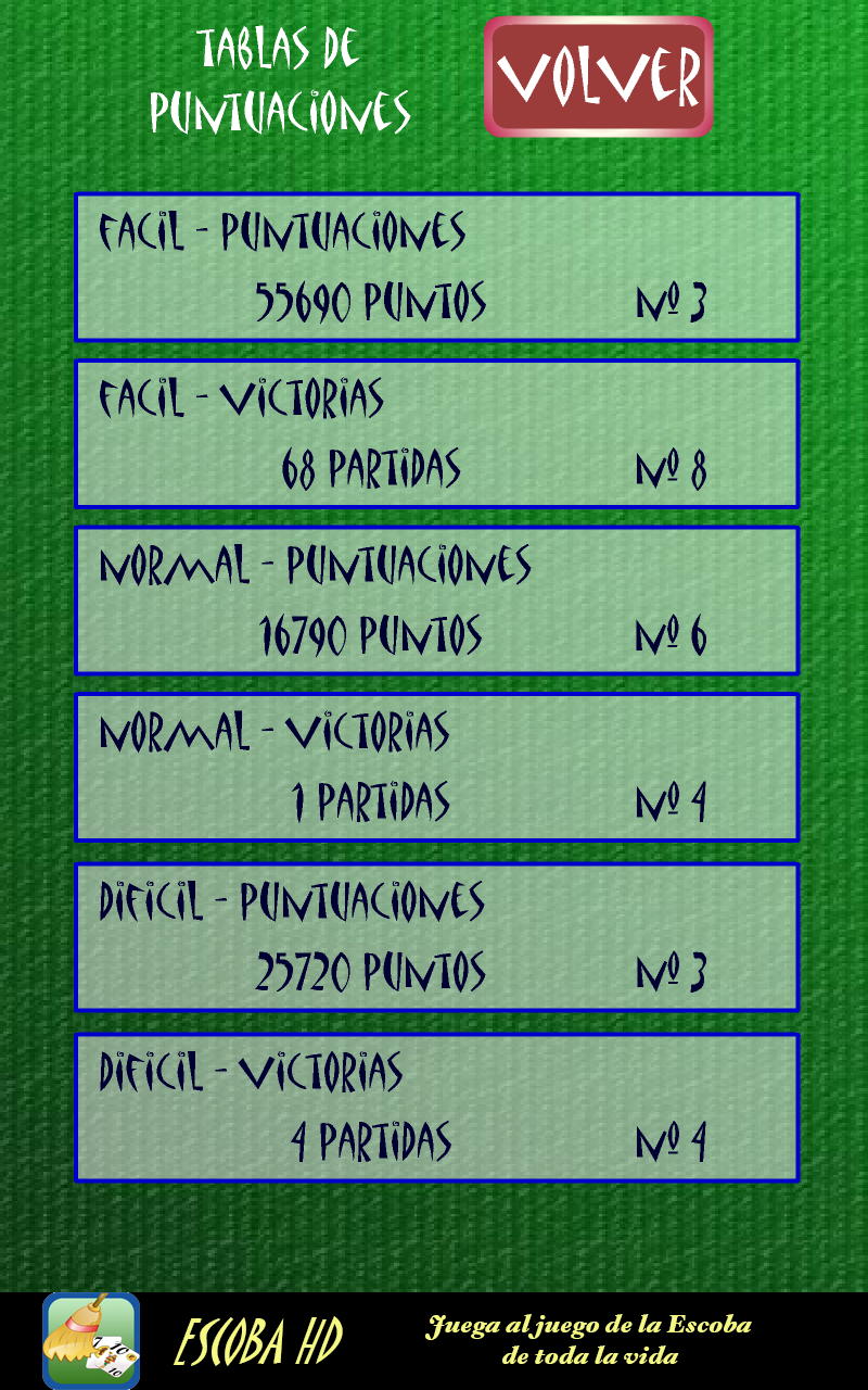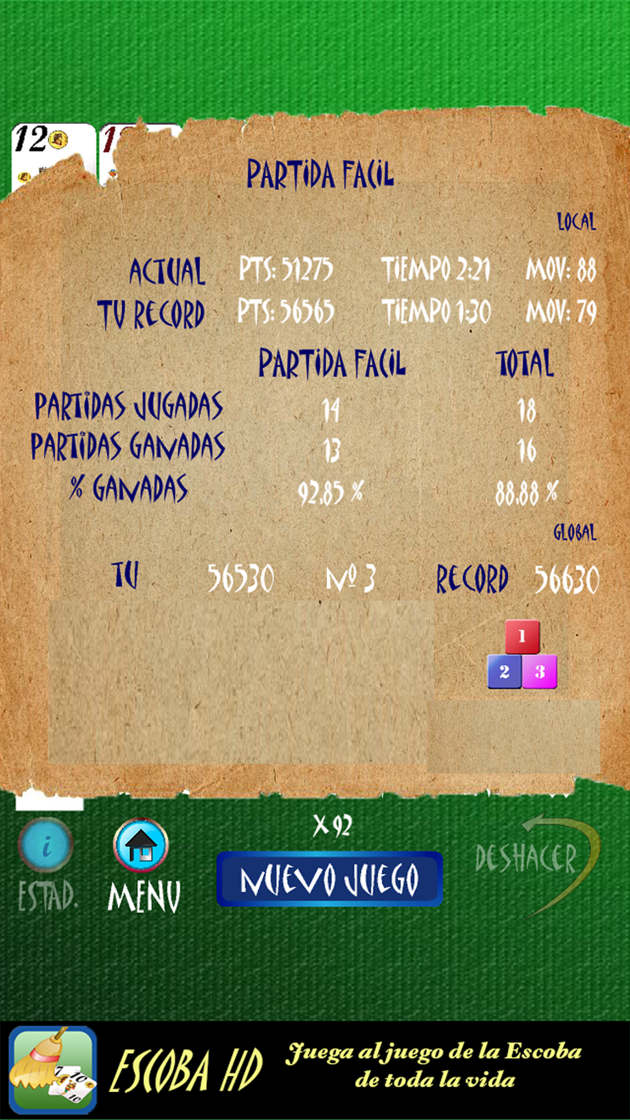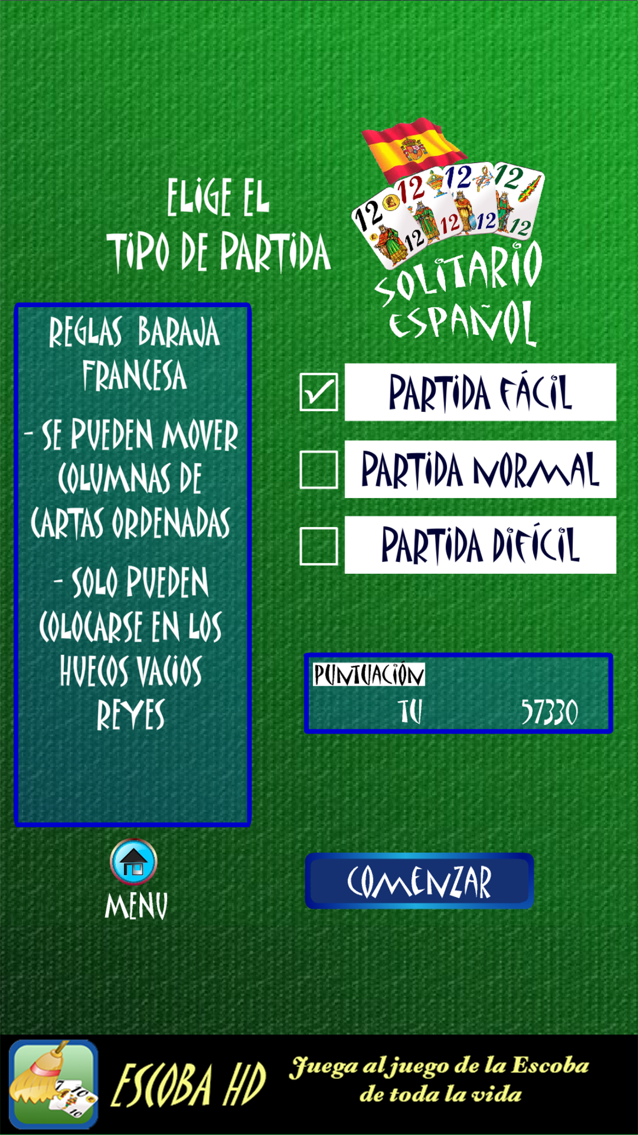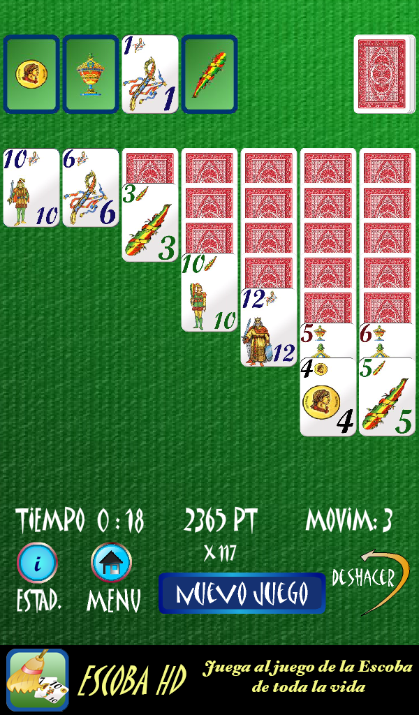 At last a solo Spanish deck for Android. The lone Spanish uses the Spanish deck of 40 cards. The goal is the same as the lone French deck, discover all the letters and move them to their bases to complete the four decks of the same suit from one to the king. You lose the game when you can not move more letters to one basis. When playing with Spanish deck, the cards may be placed in piles on a different letter post (no colors as the French deck), always sorted from highest to lowest. Three types of games with three different game rules propose: -Partida Easy: Played with the normal rules of lone French deck, with the only exception that as mentioned in this case colors but sticks alternate. Therefore we can move or a letter or group of letters arranged in a stack, and the empty holes we can only place the kings. - Normal game: True lone Spanish. In this we can only move the last card of each pile, but instead can be placed in any voids any card without it a king. Difficult -Partida: A Spanish solitaire variation with the same rules of it, but we can only put in the empty holes kings, thus making this more complicated. At any time you can undo any move to "undo" button. With the "new game" button starts a new game for the selected level, and with the menu button will return to the initial menu. At the moment there are no cards in the deck and all the cards placed in piles are raised, autofill button appears at this time stopping time. Pressing it all the cards in their corresponding bases are collected. The game takes full estaíistica of Games Played and won by level and total and by type record times and starting movements. During the game we can see them by clicking on the "i" button. We have implemented the possibility of continuing a game started earlier. When the app is closed or exit the main menu from an already started game, you can continue with the game already started or starting a new one. We have implemented the ability to connect via facebook account, so that access to: - Table of records for the three levels of play - Rating friends to the level you are playing - Ability to invite your friends to play Solitaire. - Ability to share your score with your friends on Facebook. We have implemented a scoring system, with the following rules: Movements generate some points, which in turn is multiplied by the multiplier or FactorX for punctuation. For example, move a card to discover another, from one pile to another generates +5 points. These points will become +250 points if the multiplier is X50. If the multiplier is X20, the same movement will give you +100 points. The movements that generate points are: Based discard pile: +10 Points. Stack Base: +10 Points Graveyard Graveyard: +5 Points Letter discovered in Battery: +5 Points Pile Base: -15 Points X multiplier, located in the lower area of the screen, decreases with time. Used to compute the points of each movement. The higher the multiplier will receive more points for movement. Therefore the initial movements are worth more points than the end. Hope you have fun a lot.