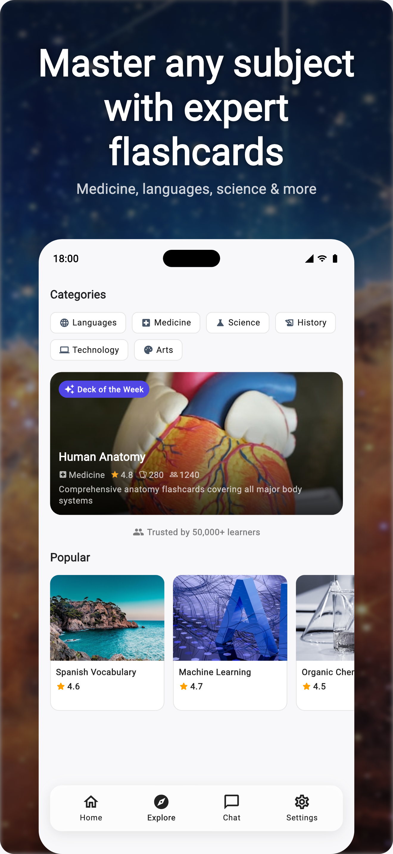 Spaced repetition shows you cards right before you forget them. Study less, remember more. The same science used by top medical students worldwide.
