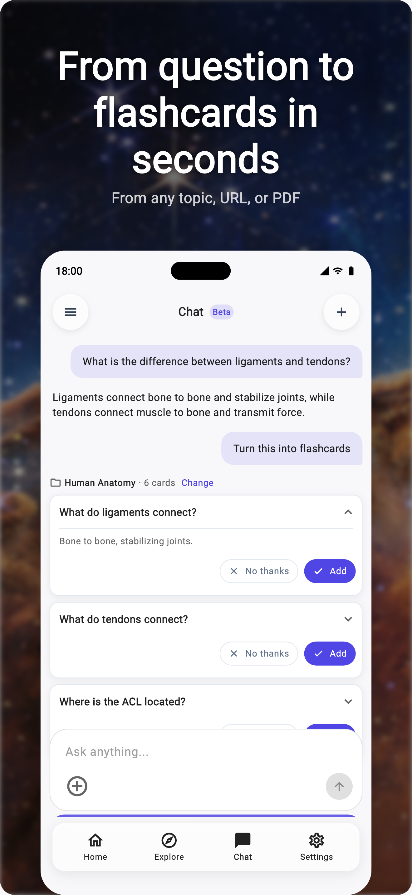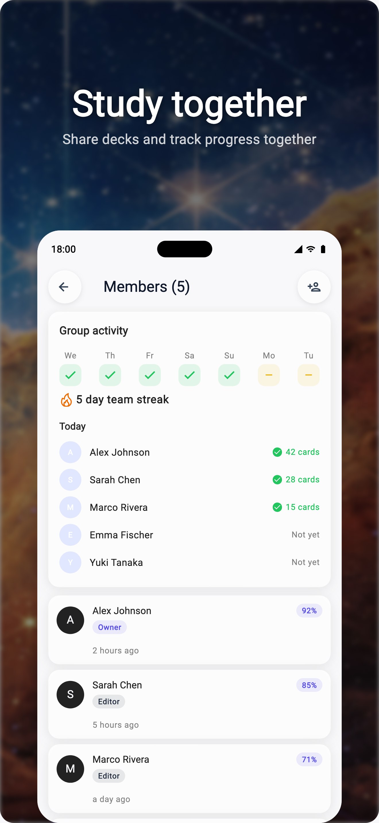 Space gives you the power of spaced repetition flashcards with none of the complexity. No manual scheduling. No confusing add-ons. Import your Anki decks and start studying with a beautiful, modern flashcard app.