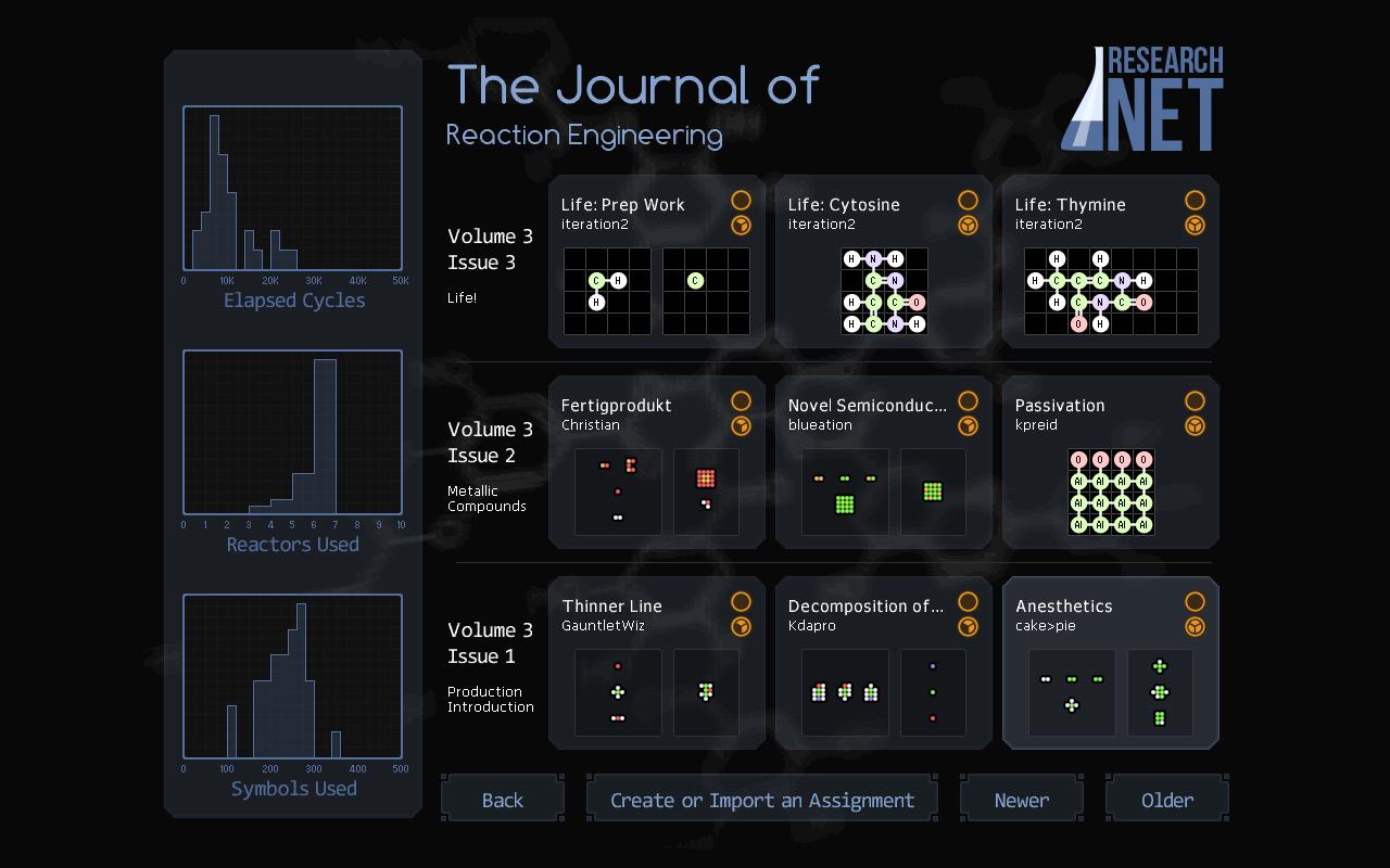 Take on the role of a Reactor Engineer working for SpaceChem, the leading chemical synthesizer for frontier colonies. Construct elaborate factories to transform raw materials into valuable chemical products! Streamline your designs to meet production quotas and outperform other engineers!