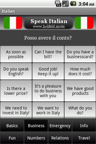 Speak Italian Free (Package Name: com.benjaminholfeld.speakitalianfree) is developed by Holfeld.com and the latest version of Speak Italian Free 1.3 was updated on October 18, 2013. Speak Italian Free is in the category of Business. You can check all apps from the developer of Speak Italian Free. Currently this app is for free. This app can be downloaded on Android 1.6+ on APKFab or Google Play. All APK/XAPK files on APKFab.com are original and 100% safe with fast download.