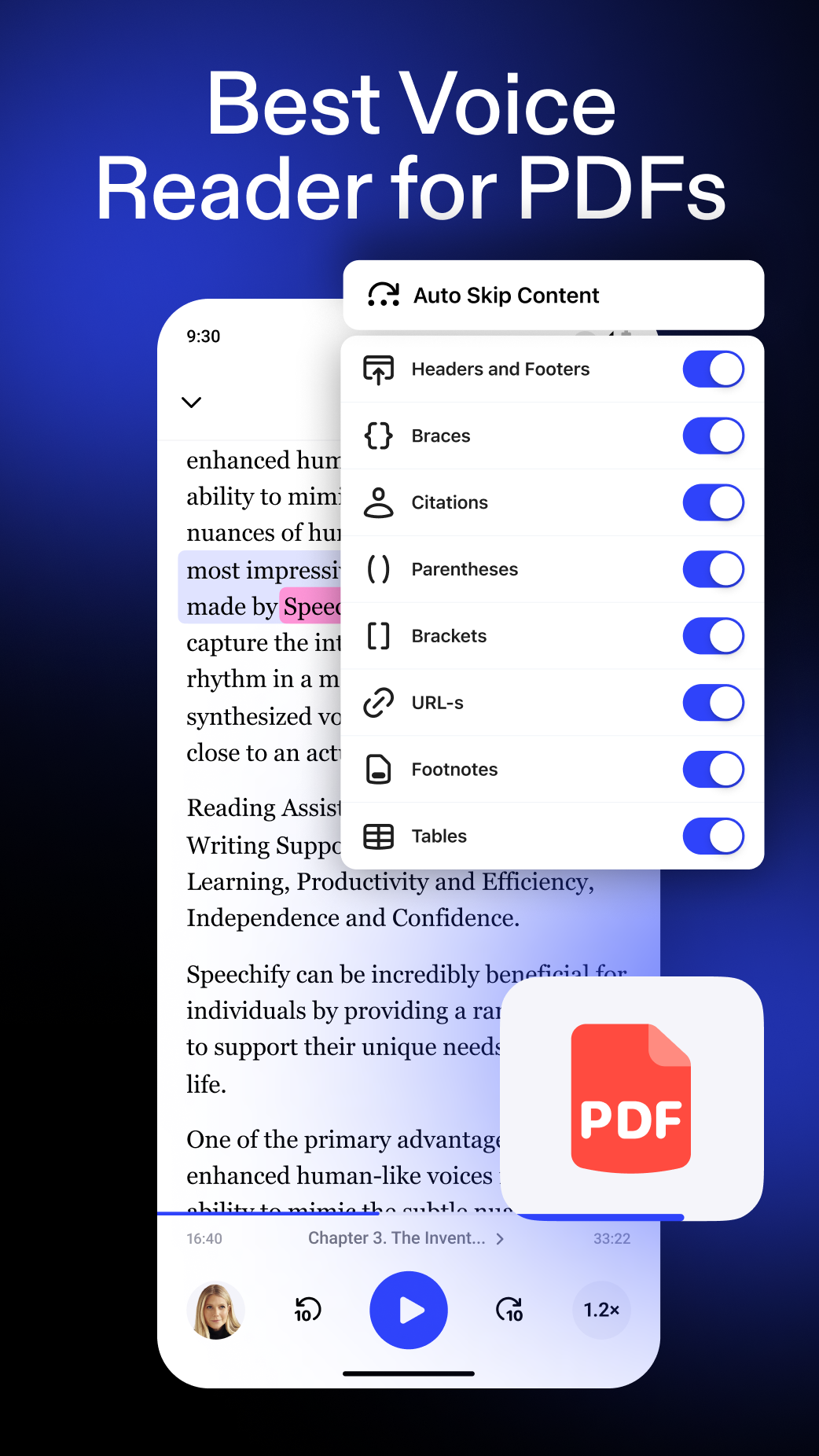 Hear anything up to 4.5× faster (900 wpm). Learn more in less time with voices that sound natural even at high speed.