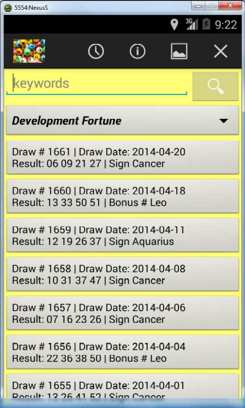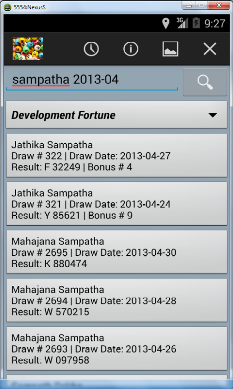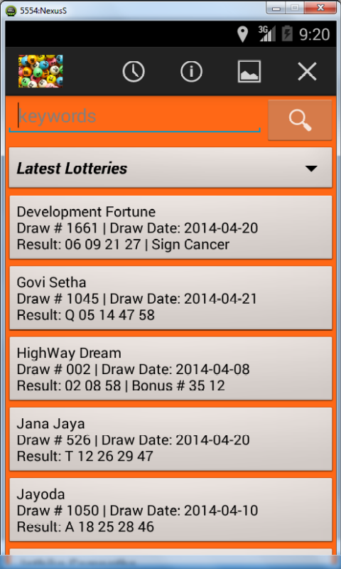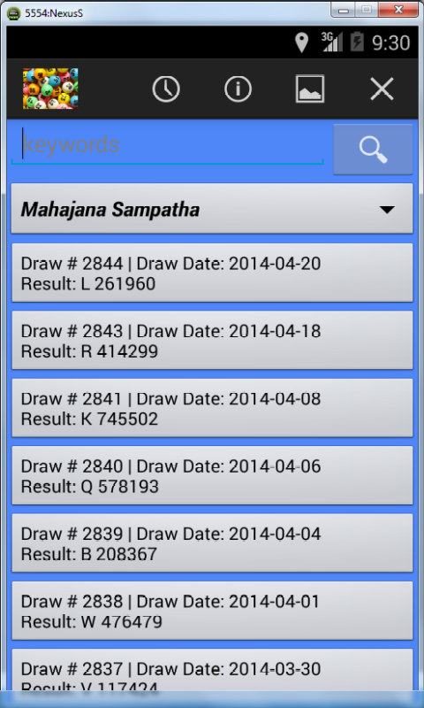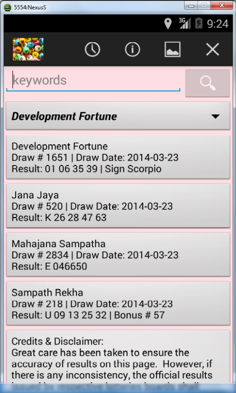 Sri Lankan Sweep/Lottery Results is a dynamic mobile application to provide users with the latest results of major lotteries available in Sri Lanka. It also provides the option of viewing the Sri Lankan lottery results for the last several years for major lotteries. Special Features: * Select results by sweep title. * Select results by date. * Search results by any field such as sweep code, title, draw number, draw date, result, bonus sign, bonus number. * Change background color scheme. * Continuous updates to new lottery types and results. Credits & Disclaimer: Great care has been taken to ensure the accuracy of results on this page. However, if there is any inconsistency, the official results issued by respective lotteries boards shall apply. National Lotteries Board (NLB) - http://www.nlb.lk Development Lotteries Board (DLB) - http://www.dlb.lk Oceanic Games - http://www.oceanicgames.com The data is provided 'as is' without warranty or any representation of accuracy, timeliness or completeness based on the published results of original lotteries boards. You are always welcome to contact the award winning developer for any suggestions and queries.