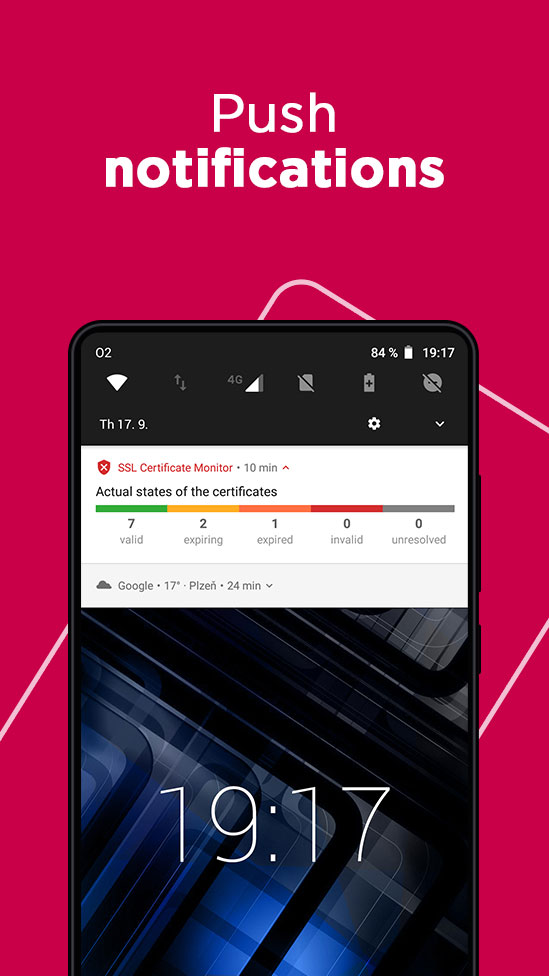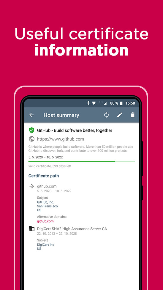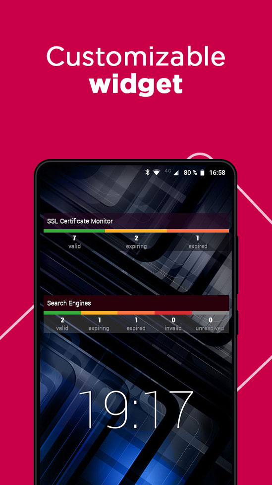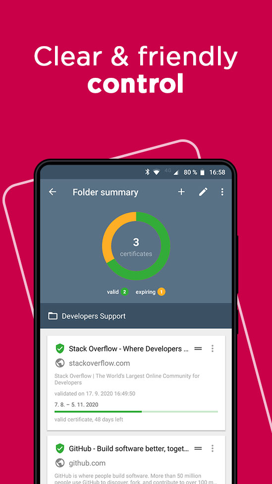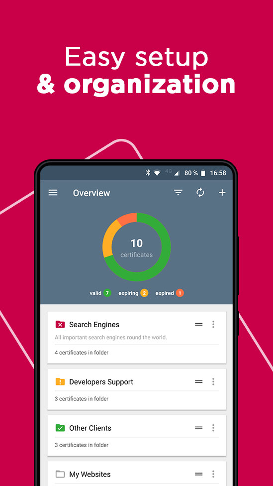 SSL Certificate Monitor Powerful tool for monitoring validity of SSL certificates. Easy setup and organization of all wanted certificates and certificate folders. Backup of all SSL Monitor settings for recovery. Push notifications with certificate summaries, unique customizable widget. Free usage for one folder with one certificate host! Application is monitoring web certificates, not ftp and mail certificates.