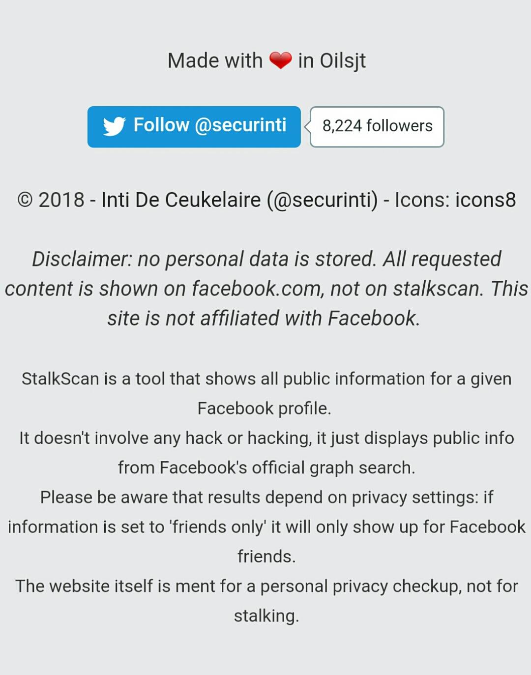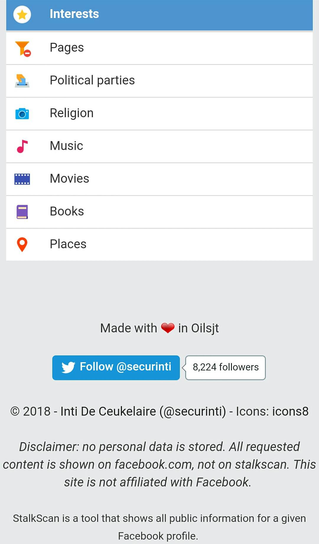 StalkScan is a tool that shows all public information for a given Facebook profile. It doesn't involve any hack or hacking, it just displays public info from Facebook's official graph search. Please be aware that results depend on privacy settings: if information is set to 'friends only' it will only show up for Facebook friends. The application itself is ment for a personal privacy checkup, not for stalking.