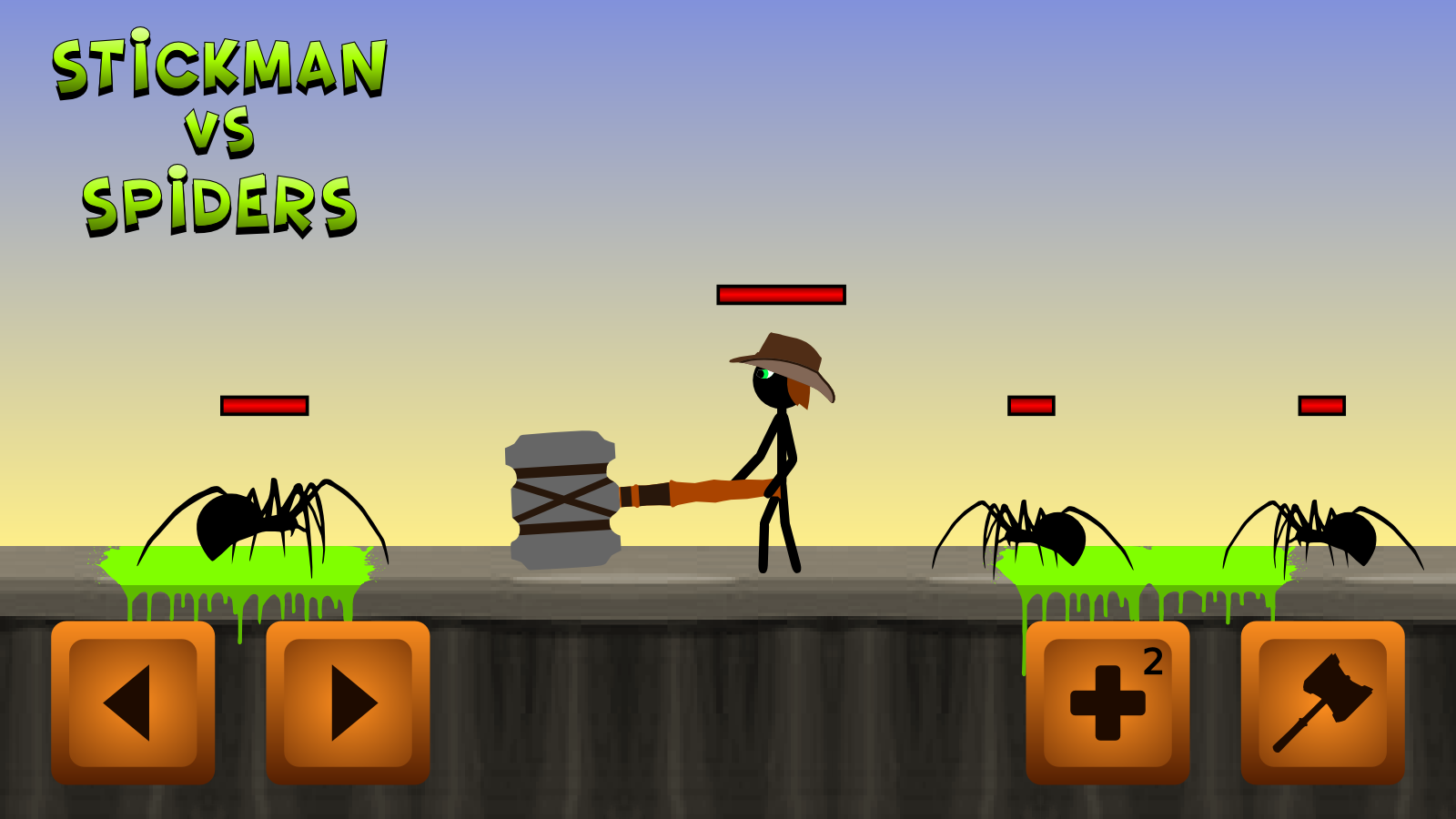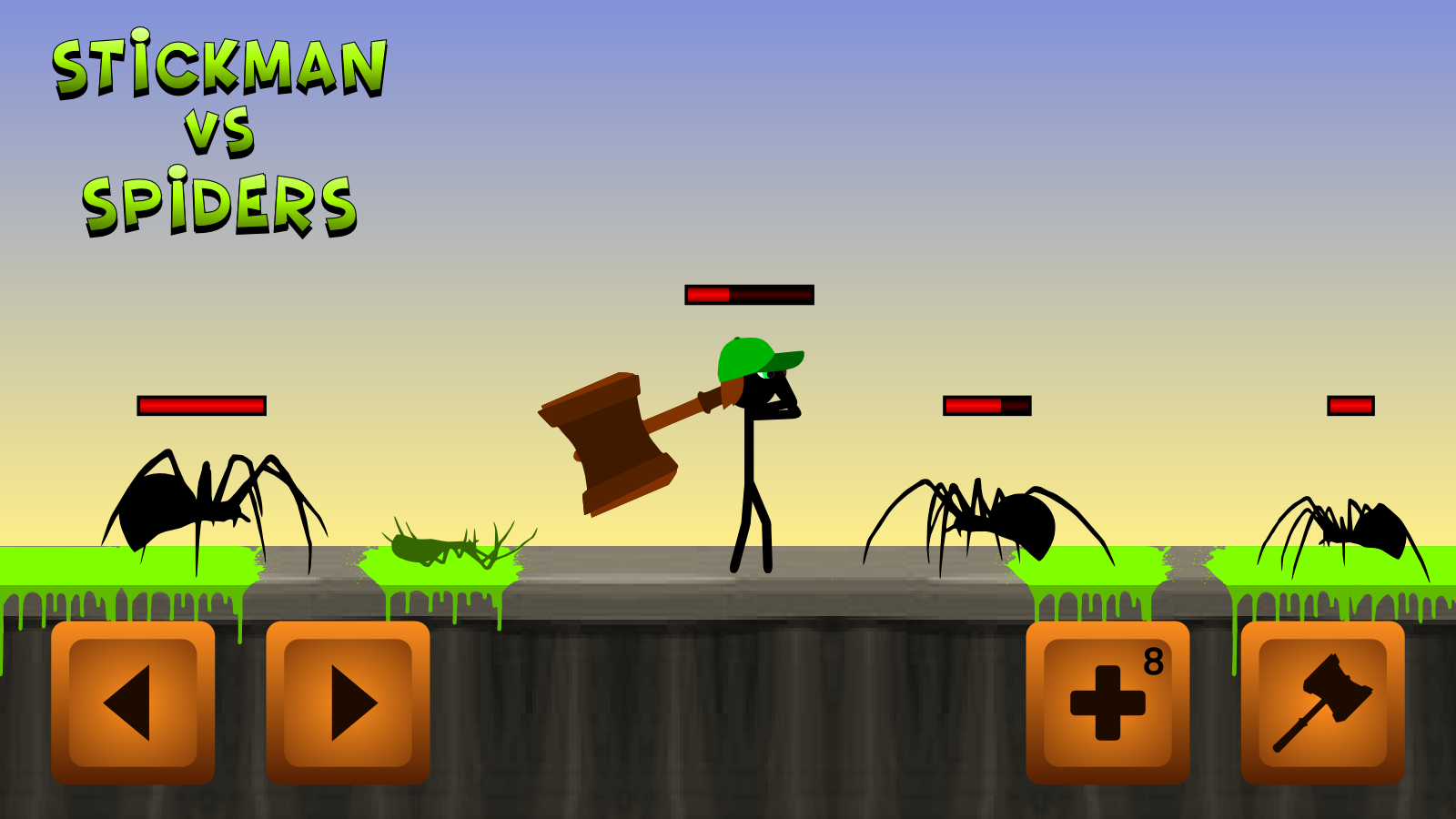Stickman vs Spiders is a fast paced adventure game made by/for stickman fans! Use your hammer to crush the spiders that come from both sides and earn coins. In the shop you can use the coins to buy items, upgrades and customize your stickman and hammer. Upgrade your life bar and remember to always have first aid kits to protect stickman from the poisonous attacks. In this first version the game has only one mode: survival. We will update the game soon and add new game modes, hammers and items! Please rate us and send your suggestions to support our work! Have fun smashing the spiders! =]