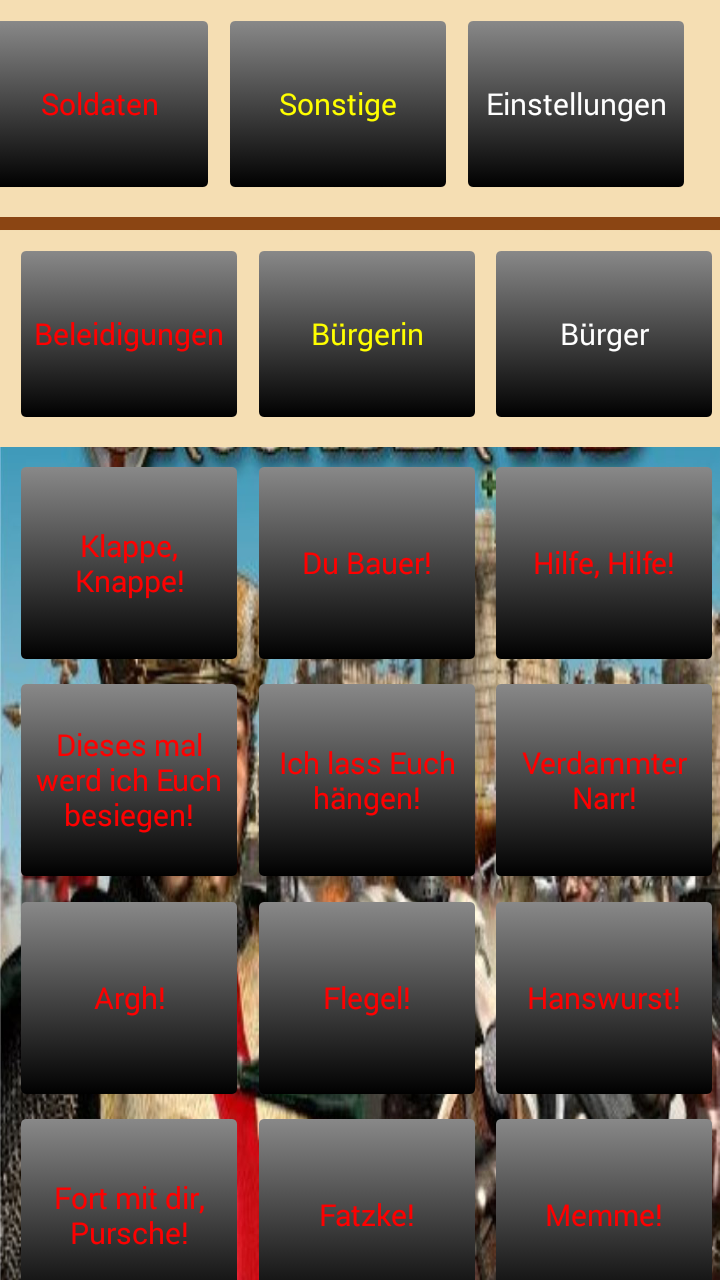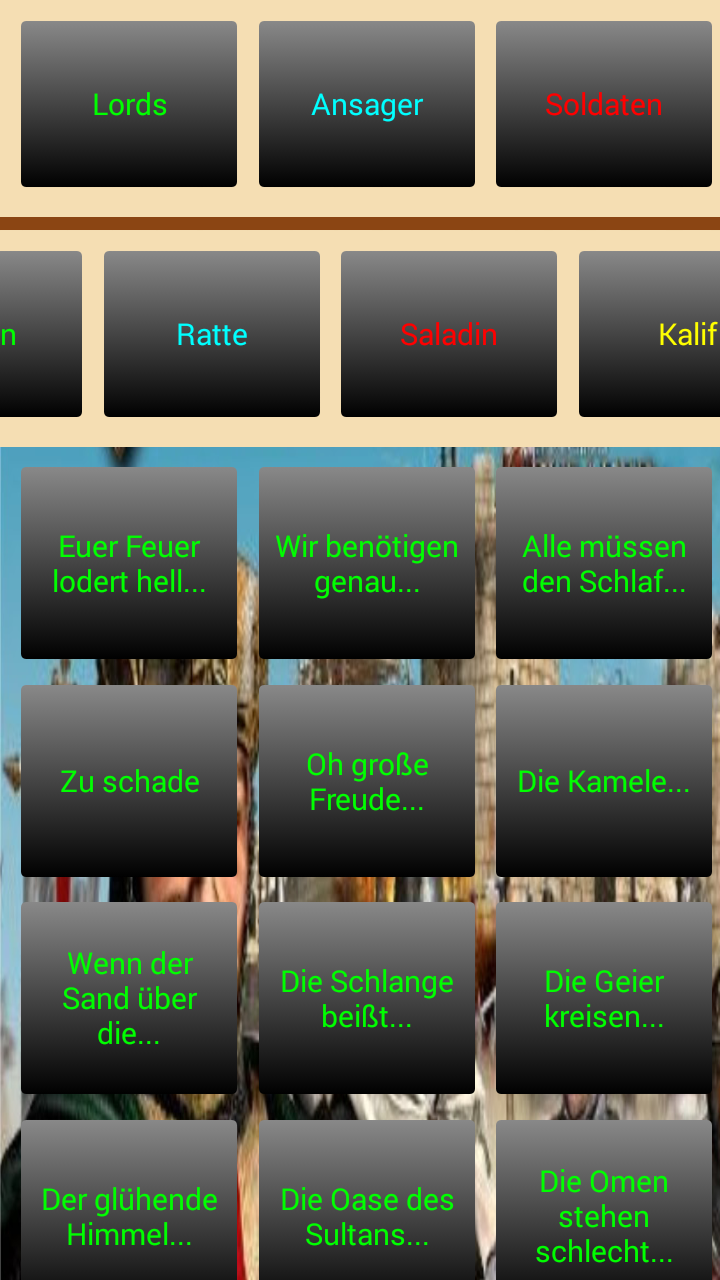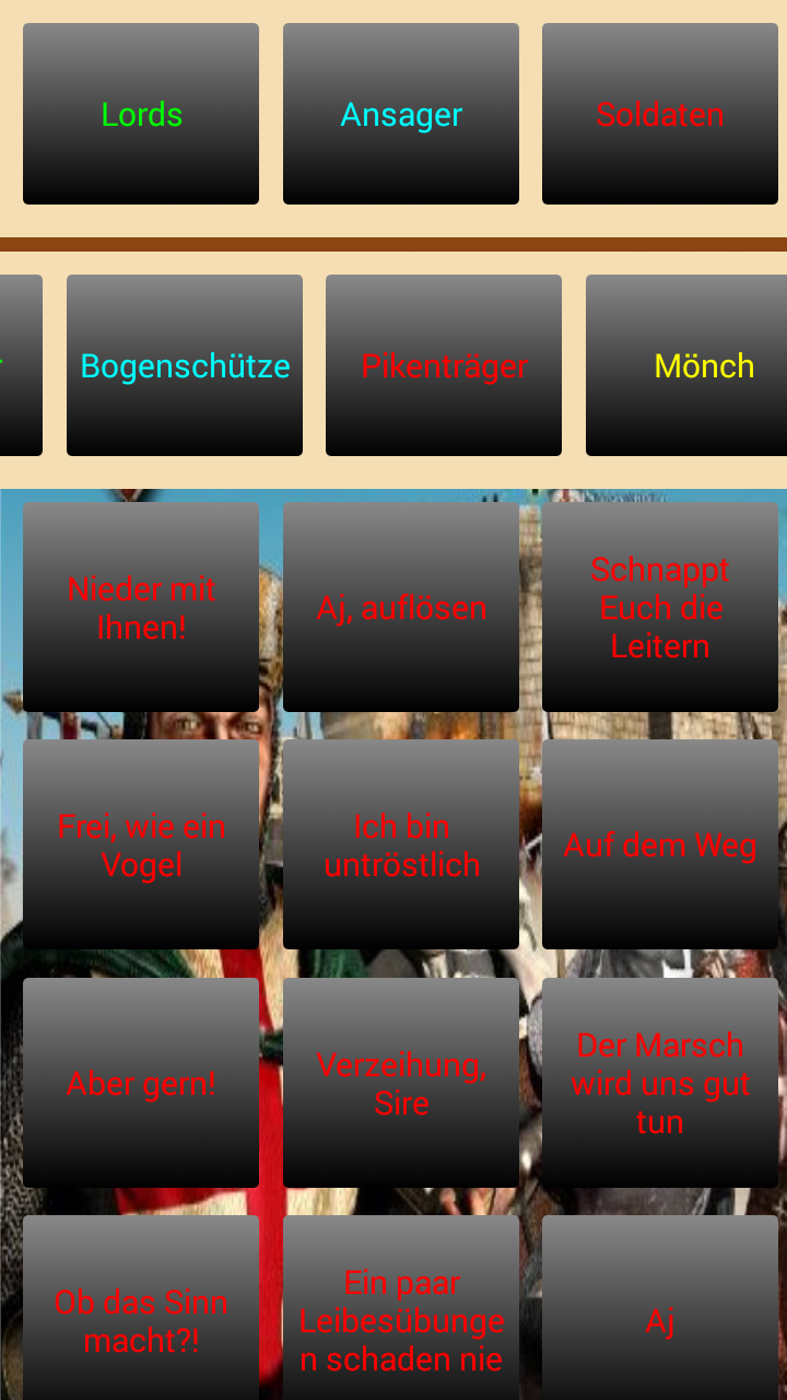 Dieses Soundboard enthält alle legendären Sprüche und Kommentare der verschiedenen Gegner, der Soldaten, des Ansagers und einiger weiterer aus dem Kult-Spiel "Stronghold-Crusader" von den Firefly-Studios. Ist eine Kategorie und ein Charakter ausgewählt, ertönt nach einem Druck auf einen Button der ausgewählte Spruch. Bei längerem gedrückt-Halten eines Buttons wird der gerade abgespielte Sound unterbrochen. Bei Fragen, Anregungen, Verbesserungsvorschlägen, oder Aufträgen für andere Apps wenden Sie sich bitte an [email protected] . Besonders möchten wir auch noch den Firefly-Studios danken, die nicht nur mit ihrem Spiel "Stronghold-Crusader" die Vorlage für diese App gegeben haben, sondern auch noch das Veröffentlichen dieser ermöglicht haben. Viel Spaß mit der App wünscht Ihnen Ihr LMLC-Team!