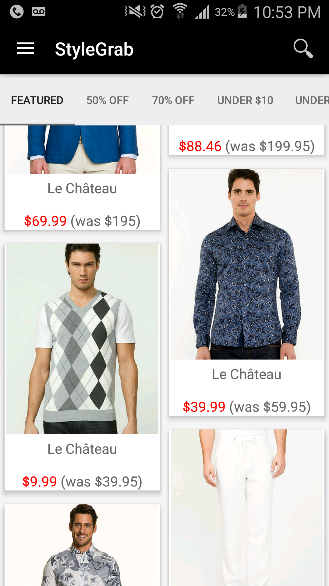 StyleGrab (Package Name: com.fabu.stylegrab) is developed by Predrag Simonovski and the latest version of StyleGrab - Shop Fashion Deals 1.5 was updated on June 9, 2016. StyleGrab - Shop Fashion Deals is in the category of Shopping. You can check all apps from the developer of StyleGrab - Shop Fashion Deals and find 25 alternative apps to StyleGrab - Shop Fashion Deals on Android. Currently this app is for free. This app can be downloaded on Android 4.1+ on APKFab or Google Play. All APK/XAPK files on APKFab.com are original and 100% safe with fast download.