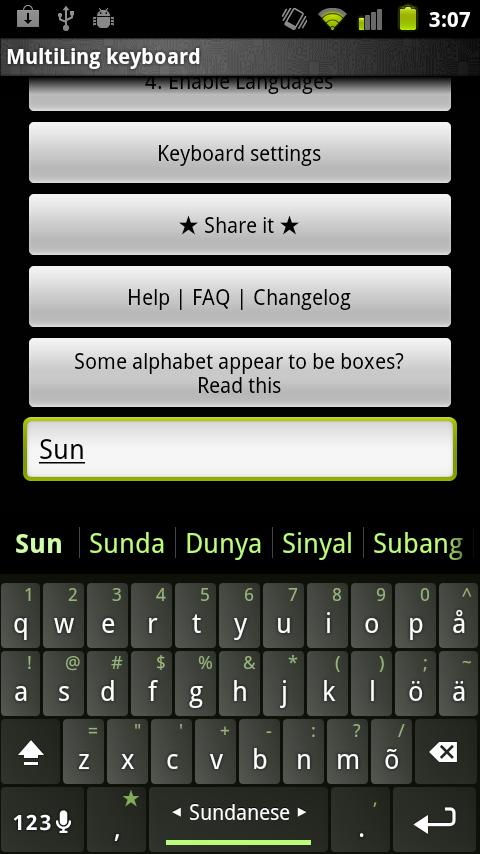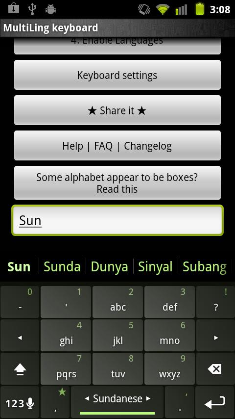 Sundanese Dictionary plugin for Multiling O Keyboard autocorrect and word prediction Instruction: ⑴ Install this plugin and Multiling O Keyboard. https://play.google.com/store/apps/details?id=kl.ime.oh ⑵ Run O Keyboard and follow its setup guide. ⑶ Slide space bar to switch languages. If you have font issue, read this: http://honsoapps.appspot.com/1/ma.html Wikipedia: Sundanese /sʌndəˈniːz/[4] (Basa Sunda /basa sʊnda/, in Sundanese script ᮘᮞ ᮞᮥᮔ᮪ᮓ, literally "language of Sunda") is the language of about 39 million people from the western third of Java or about 15% of the Indonesian population Dialects Sundanese appears to be most closely related to Madurese and Malay, and more distantly related to Javanese. It has several dialects, conventionally described according to the locations of the people: Western dialect, spoken in the provinces of Banten & some parts of Lampung, Northern dialect, spoken in Bogor & northern coastal area of West Java, Southern or Priangan dialect (Bandung & its surroundings), Mid-east dialect, spoken in Majalengka & Indramayu, Northeast dialect, spoken in Kuningan, Cirebon & Brebes (Central Java), Southeast dialect, spoken in Ciamis, Banjar & Cilacap (Central Java). Priangan, which covers the largest area of Sunda (Tatar Pasundan in Sundanese), is the most widely spoken type of Sundanese language, taught in elementary till senior-high schools (equivalent to twelfth-year school grade) in West Java and Banten Province. Writing Main article: Sundanese alphabet Sundanese can be written in different writing systems, the Old Sundanese script (Aksara Sunda Kuno) and Pegon in historical times, and in modern times the Latin script and the modern Sundanese script.