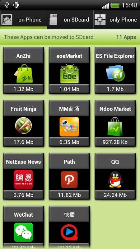 SD App Manager is a very convenient mobile phone app.It will search all the apps installed in your mobile phone when it finish,then it will list all kinds of apps on the main screen.You can choose to remove the apps you want on the list to save memory of mobile phone or to install other softwares you may need in it.Of course you are able to move what you want to the memory of mobile phone so that nothing will affect your operation even if your SD card is ruined.The apps in the third list can not be moved and no ones in this screen could be operated.Apptool can also stop those apps on the backstage.You can certainly uninstall the apps you don't wanna installed in your mobile phone.Have a nice!