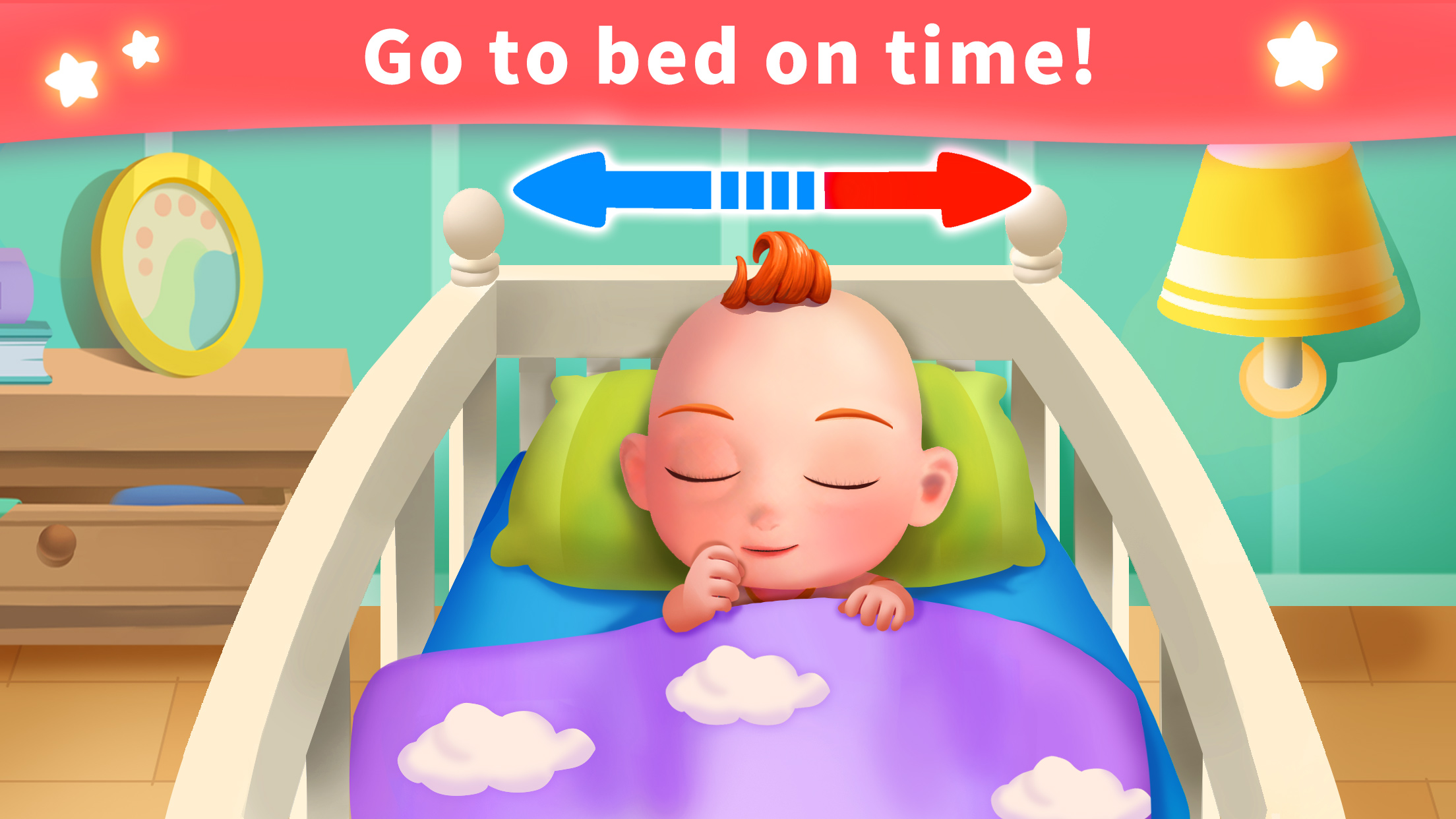It's bedtime! Swing the cradle and put JoJo to sleep! JoJo has kicked off the blanket. Let's tuck him in. Then draw the mosquito net, turn off the table lamp, and say good night to JoJo!
