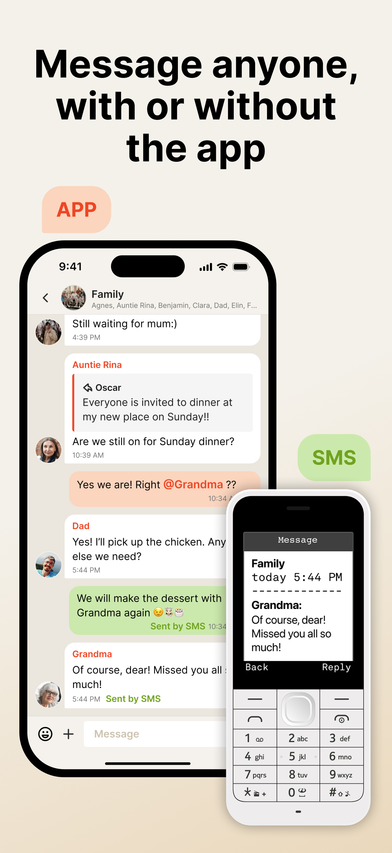 Invite anyone using their phone number. If they don’t have the app, we deliver via SMS so they can still read and reply.