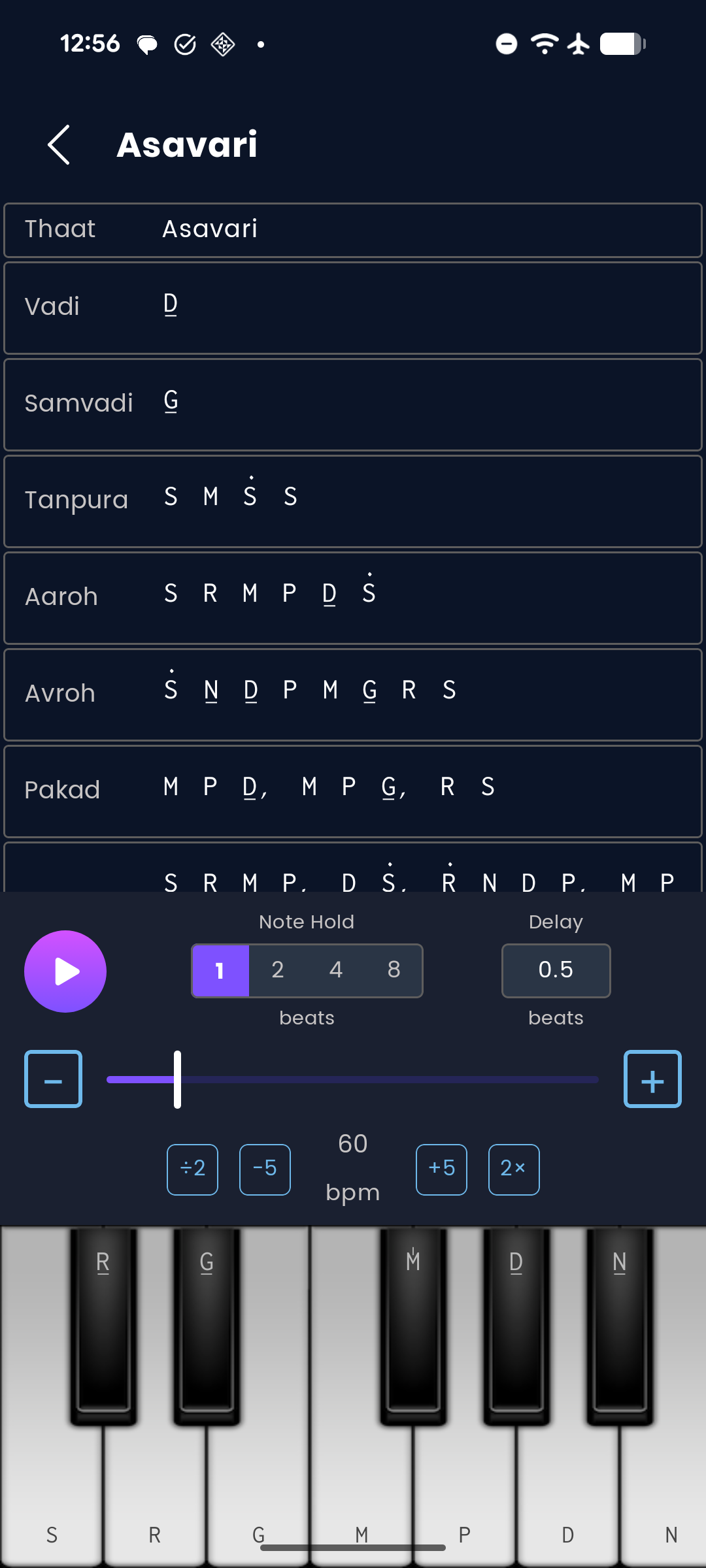 Play a 36-key keyboard spanning 3 octaves with authentic sound. Select from 100+ raags and practice interactively — auto-play aaroh, avroh, pakad, and alaap with note-by-note visual guidance. Enable raag-guided key highlighting and play smooth meend glides between notes.