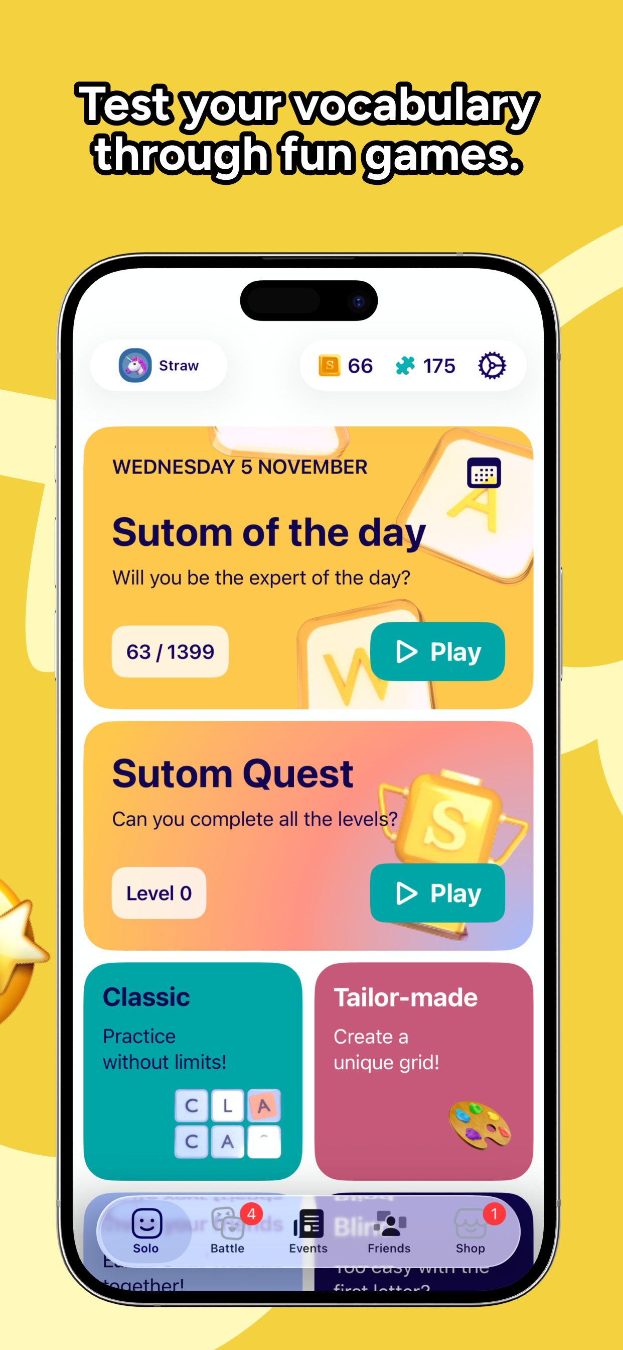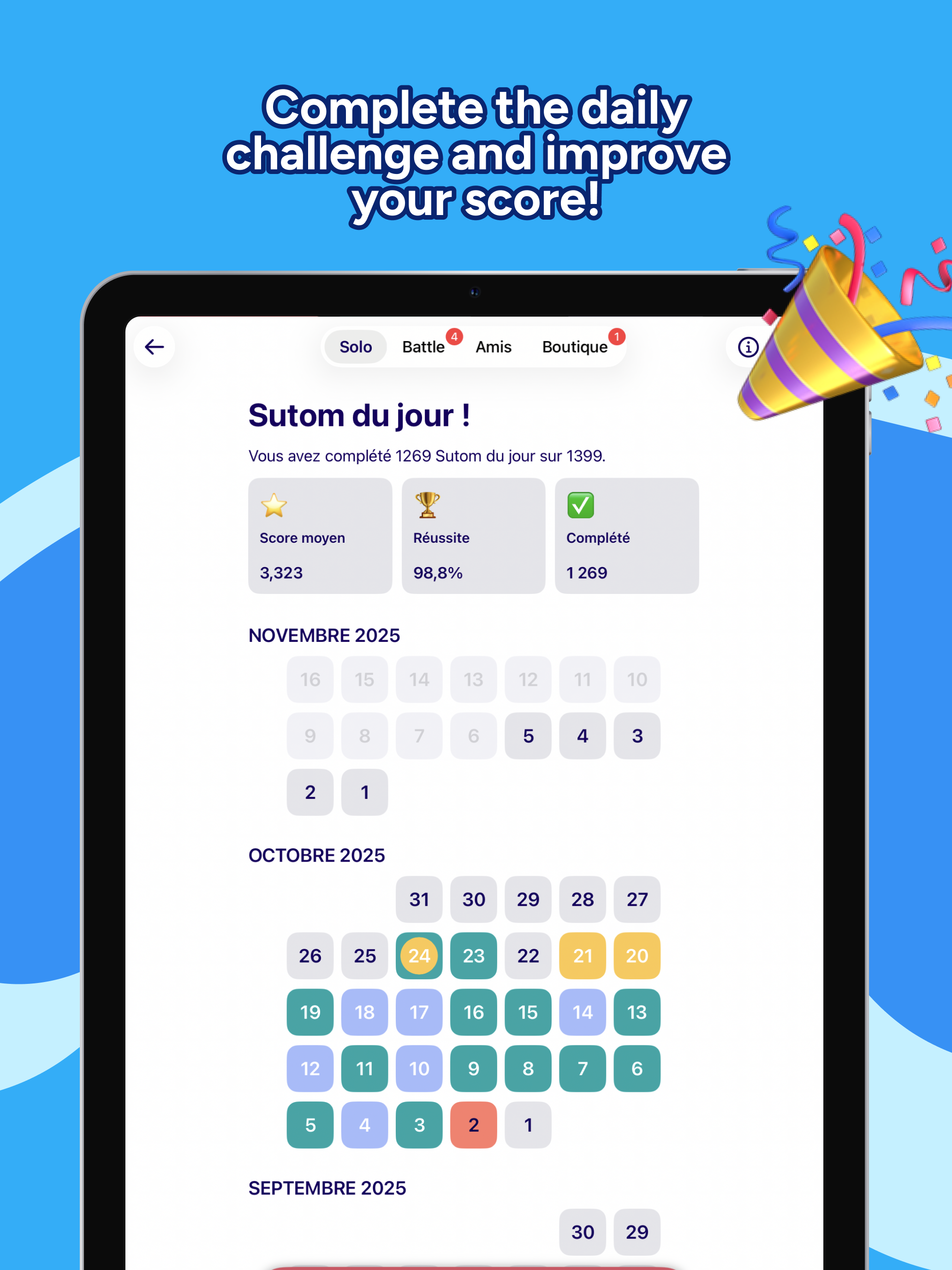 Sutom – Word Games, Puzzles & Daily Brain Teasers The perfect brain training game for the whole family! Sutom brings together Wordle-style word games, logic puzzles and mini sudoku. Play solo or with family, at home or on the go. Word of the Day – Guess the secret word Every day, a new word to guess in 6 attempts. Submit a word and watch the clues: red letters = correct position, yellow letters = present but wrong spot, blue letters = not in word. Expand your vocabulary while having fun! Same word for all players: compare scores and share your results with friends. Pazuru of the Day – Logic path puzzle Trace the perfect path through the grid! Connect all cells by passing through numbers in order: 1, 2, 3... Only one path exists, can you find it? This logic and strategy brain teaser will make you think. Great for exercising problem-solving skills. Mini Sudoku of the Day – Quick number grid Complete the 6x6 grid as fast as you can! Each row, column and region must contain digits 1 to 6. More accessible than classic 9x9 sudoku, perfect for a coffee break or commute. Unlimited game modes • Quest – Hundreds of themes: movies, sports, history, nature, geography... • Battle – Challenge friends in real-time, speed duel • Chrono – Find as many words as possible in 2 minutes, race against the clock • Blind – Without the first letter, reserved for vocabulary experts • Classic – Unlimited practice at your pace, no pressure • Events – Temporary challenges and exclusive tournaments Play anywhere, even offline Offline mode available: the perfect game for planes, trains, subway or vacation. No internet connection needed! Download your puzzles and play anywhere, anytime. Why choose Sutom? • 300,000+ words in French, English and Spanish • 3 free daily puzzles: word, path and sudoku • Detailed statistics and streaks to maintain • Global and friends leaderboards • Family-friendly game for all ages • Simple and intuitive interface • Customizable light/dark themes • AZERTY, QWERTY, QWERTZ keyboards • No account required to start The ultimate word puzzle app Sutom follows the tradition of great games: Wordle, Lingo, and more. Whether you're looking for a word game, logic puzzle, sudoku or brain teaser to pass the time, Sutom is the app for you. Train your brain, improve concentration and have fun with family and friends. Download for free and join the community!