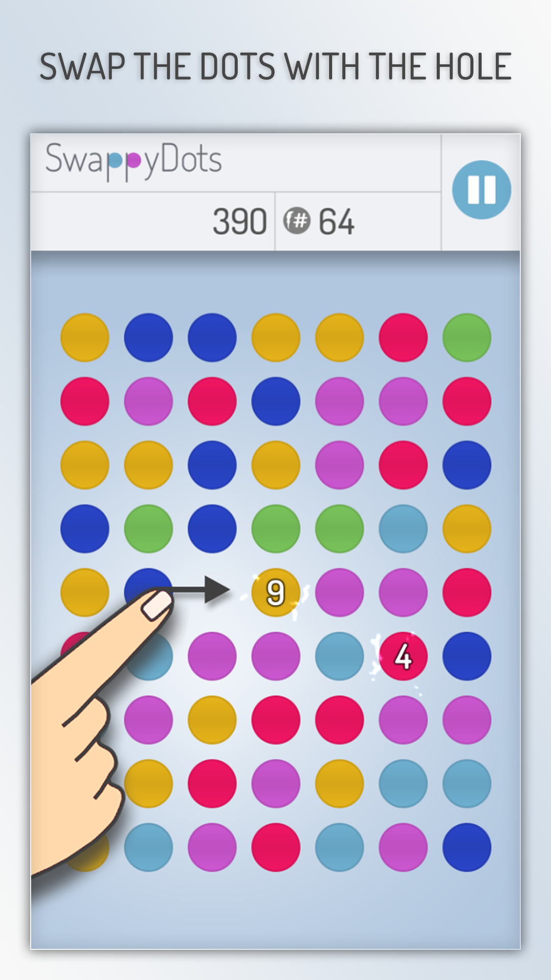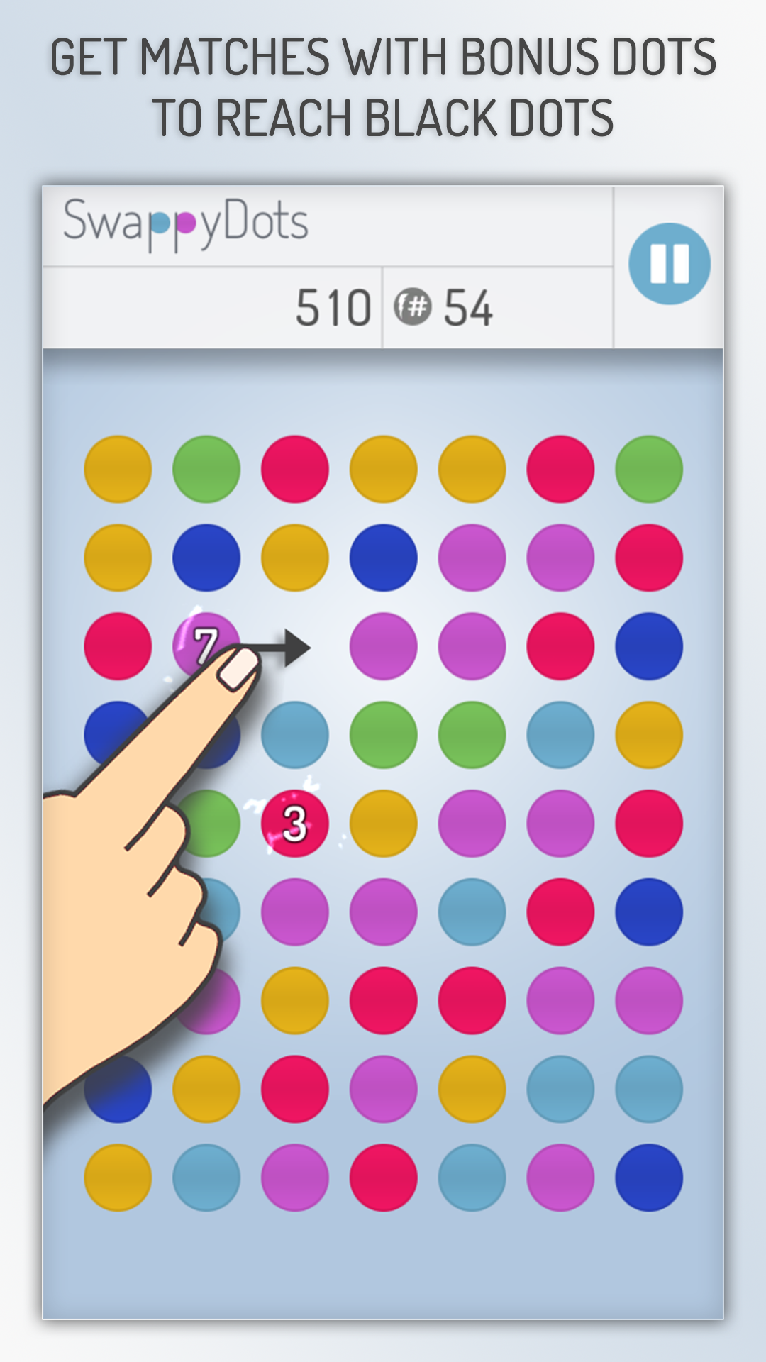 62 dots. 1 hole. Swap the dots with the hole to get 3 or more color matches. Get 4 or more matches to reach bonus dots. Get matches with bonus dots to get black dots and additional time or steps. And finally get matches with the black dots to get a score multiplier and bonus time or steps.