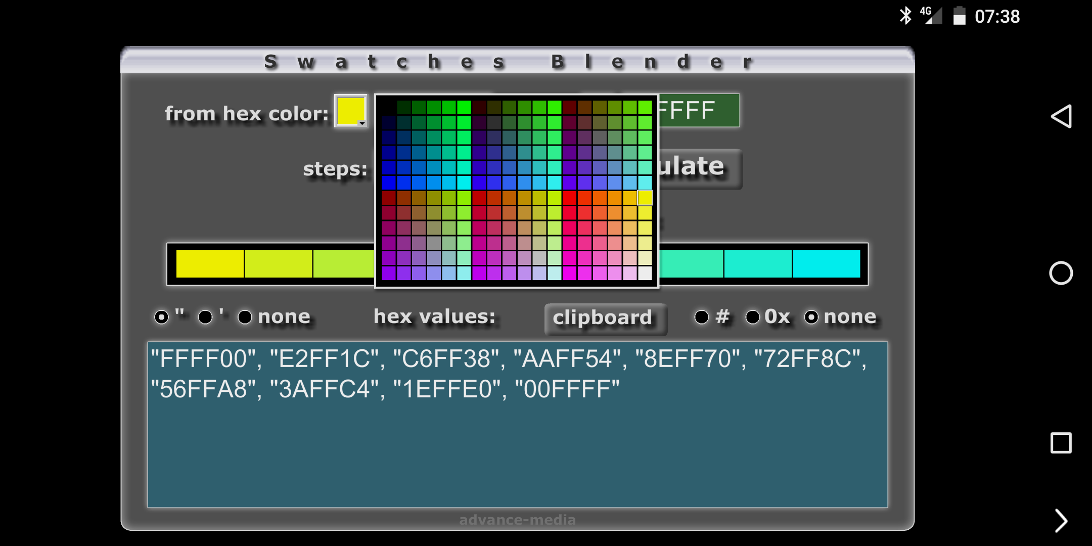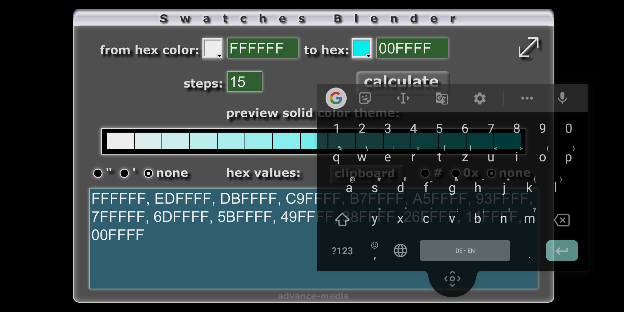The swatches blender tool makes it very easy for graphic designer and web illustrators to calculate a smoothly fading and blending solid hexadecimal color theme. Just input two color values as text or with the help of a color picker. These two colors will represent the first and last solid color of your theme. Next step is setting the step number specifying how many colors will be calculated for your theme. Then click that 'calculate' button or the return key of the soft keyboard, go! The calculated theme will be visually displayed and of course you get the helpful hexadecimal string of your desired theme which will look somewhat like this: "FFFF00", "E2FF1C", "C6FF38", "AAFF54", "8EFF70", "72FF8C", "56FFA8", "3AFFC4", "1EFFE0", "00FFFF" Long press on the string output window or use the clipboard button to copy your values. Paste the string again by long pressing into your E-mail or notes keeping app, wherever. Also you can set a few options to match HTML or Array requirements needed to satisfy developers and computer code programmers (e.g. # or 0x). Soon you will create most beautiful colored rows of buttons and list items with this designer tool. Very easy, very helpful. The creative result will look professional. Almost forgot to mention that the App is in landscape mode! The input fields are restricted to numbers or hex values respectively. Enjoy your day!