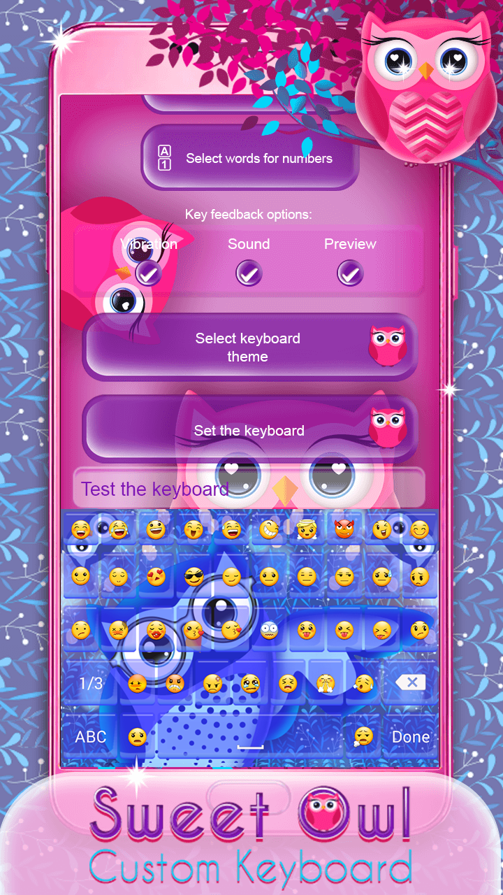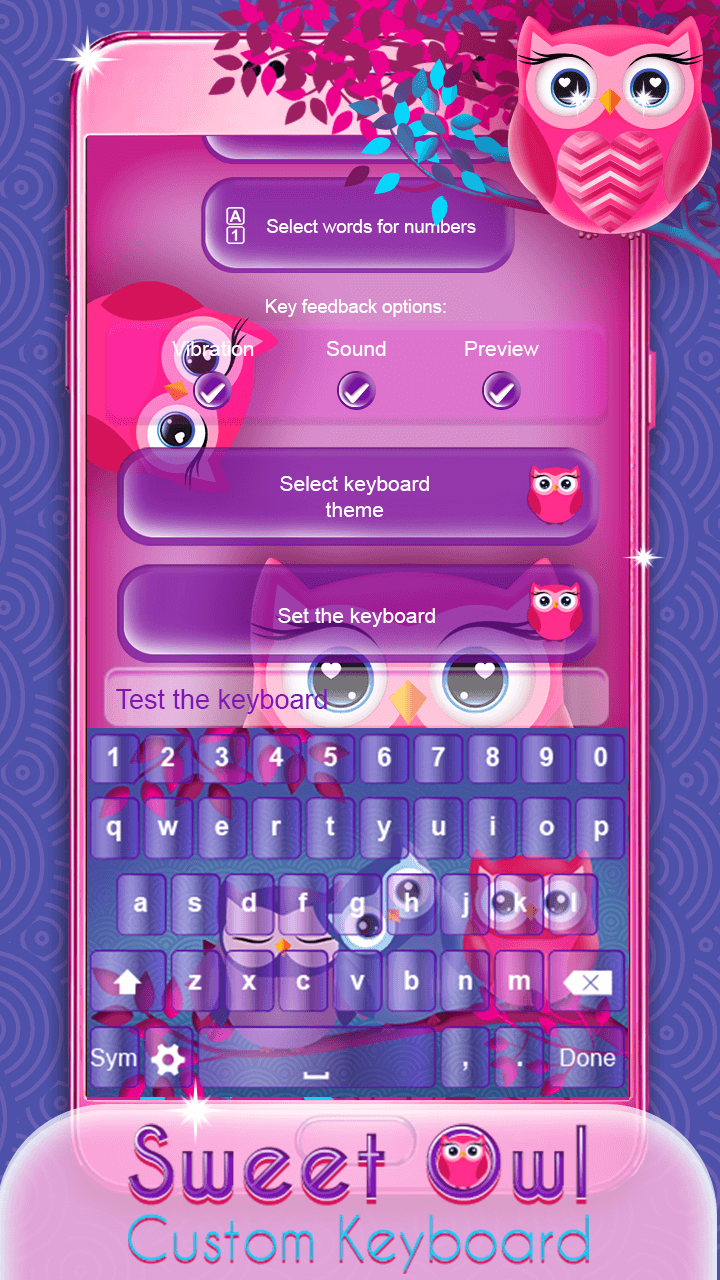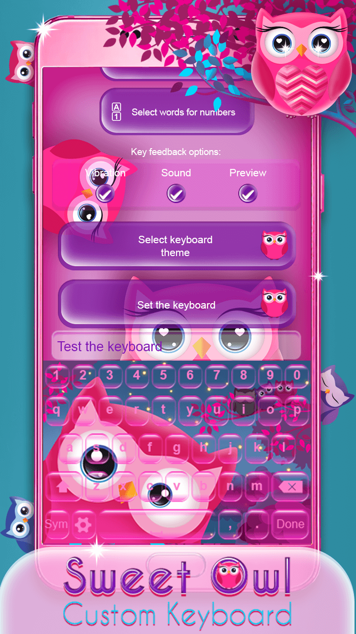 Sweet Owl Custom Keyboard (Package Name: com.Heather.Sweet.Owl.Custom.Keyboard) is developed by Heather Art and the latest version of Sweet Owl Custom Keyboard 1.1 was updated on September 27, 2017. Sweet Owl Custom Keyboard is in the category of Lifestyle. You can check all apps from the developer of Sweet Owl Custom Keyboard and find 4 alternative apps to Sweet Owl Custom Keyboard on Android. Currently this app is for free. This app can be downloaded on Android 4.1+ on APKFab or Google Play. All APK/XAPK files on APKFab.com are original and 100% safe with fast download.