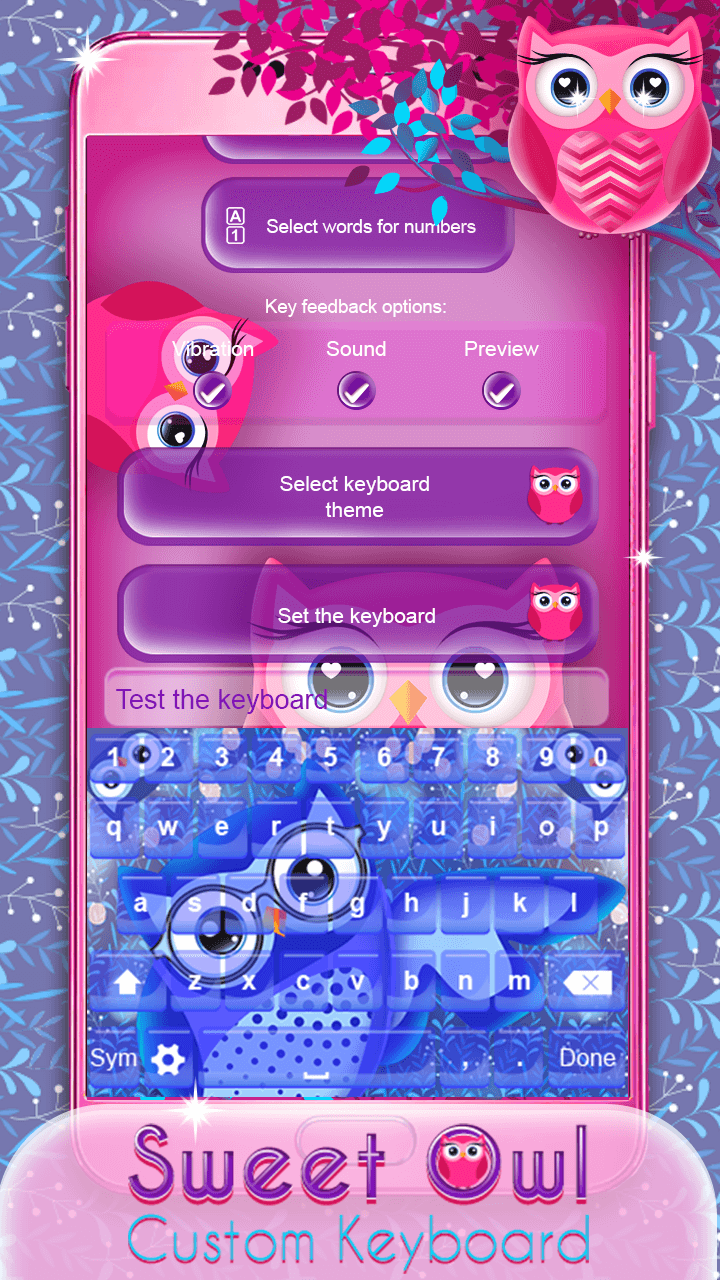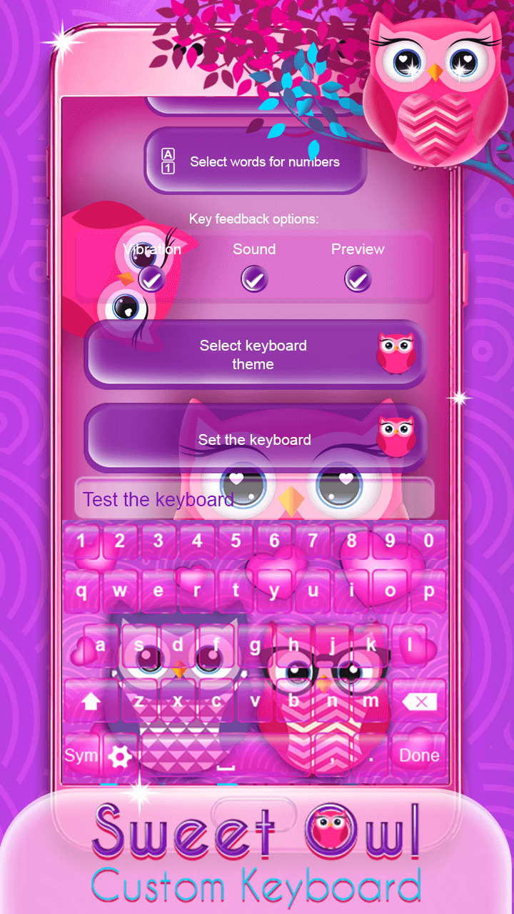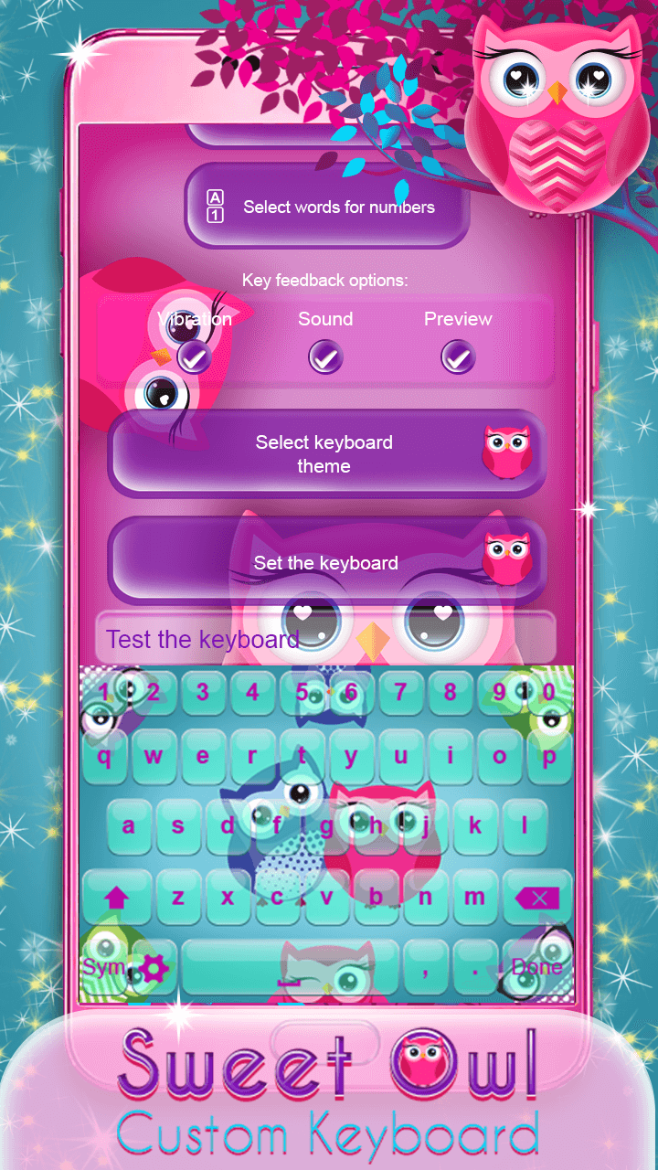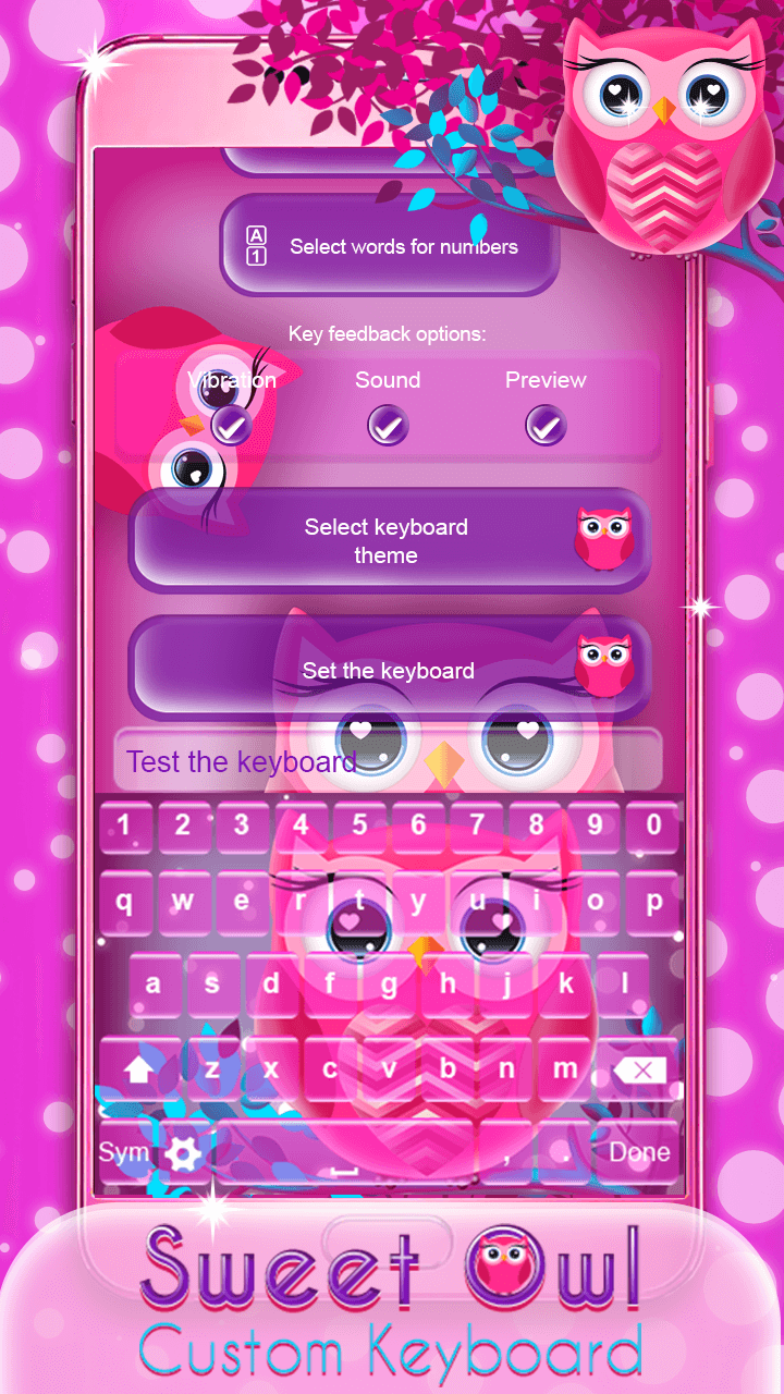 ♥ Want a fresh new look for your keyboard skin? In case you are looking for some cute designs to embellish your phone screen we have something perfect for you! ❥Sweet Owl Custom Keyboard❥ is finally here to help you to have the most elegant and gorgeous display. Check out a vast collection of “sweet owl” “keyboard themes” and enrich your phone screen in a beautiful manner. This awesome keyboard app offers you the cutest background photos that will make you never want to put your mobile or tablet down! Without further ado obtain this adorable “owl keyboard” free of charge, and style your device in a glamorous way. ✱✱✱✱✱✱✱✱✱✱✱✱✱✱✱✱✱✱✱✱✱✱✱✱✱✱✱✱✱✱✱✱✱✱✱ Instructions on how to set “owl keyboard theme”: Click on ‘Enable the Keyboard’, check the box-field next to ❥Sweet Owl Custom Keyboard❥, and then click on the OK button; Return to the application, select ‘Set the Keyboard to Default’ button and select ❥Sweet Owl Custom Keyboard❥; You can now customize your keyboard (choose themes, languages, and shortcuts); ✱✱✱✱✱✱✱✱✱✱✱✱✱✱✱✱✱✱✱✱✱✱✱✱✱✱✱✱✱✱✱✱✱✱✱ ♥ Pick your favorite “keyboard background”; ♥ An incredible array of “sweet themes” to prettify your keyboard layout; ♥ Select the desired language and start typing on a French keyboard or a Spanish keyboard; ♥ Options to turn on and off keyboard sounds and vibration; ♥ Select words for numbers and create shortcuts with one of the best keyboard apps for free; ♥ Personalize your keyboard with “pink owls”, cute owls and other embellishments; ♥ The best collection of calligraphy fonts to enhance your letters; ♥ ❥Sweet Owl Custom Keyboard❥ supports both landscape and portrait mode; ♥ Quick input in text messages, emails and chat with social apps; ♥ A variety of cute emojis, smiley faces, and cool keyboard symbols; ♥ Add some fun and excitement to your daily routine of typing text messages with a help of one of the most incredible keyboard apps; ✱✱✱✱✱✱✱✱✱✱✱✱✱✱✱✱✱✱✱✱✱✱✱✱✱✱✱✱✱✱✱✱✱✱✱ ♥ Prepare yourself to be blown away by these mesmerizing “keyboard designs”! Step inside our magic kingdom filled with awe-inspiring keyboard skins that will turn your device into the trendiest gadget in a blink of an eye! Browse our gallery and discover a bunch of mind-blowing pictures of “cute owls” that will give such a unique look to your phone screen. And that's not even all! This wonderful keypad app provides you the best collection of keyboard symbols, emoji stickers and all kinds of decorative letter fonts. Pick up your favorite keyboard owl background, spread some glitters and add a pop of pink color, and voila, you'll have the most girlish display among your friends! ♥ If you're tired of the same old themes for keyboard, enter our magic world of beautifully made keypad designs and choose the one you like the most! Thanks to this lavishing “custom keyboard” you will set the bar high, and everyone will be impressed by your excellent sense of style. If you are into girly stuff, this amazing ❥Sweet Owl Custom Keyboard❥ is a perfect choice! We have created cute themes in abundance, so feel free to try them out! ♥ If you are a true text maniac, this owl keyboard app will be your number one obsession! Along with being full of fluffy and cute backgrounds, it has tons of useful tools! Feel free to activate spell checker and auto-correction in order to type faster than ever before. You can even enable next word prediction or emoji prediction on words, and send a text message filled with smiley face symbols. Don't hesitate to put to the test this incredible “keyboard app with cute emojis” as soon as possible!