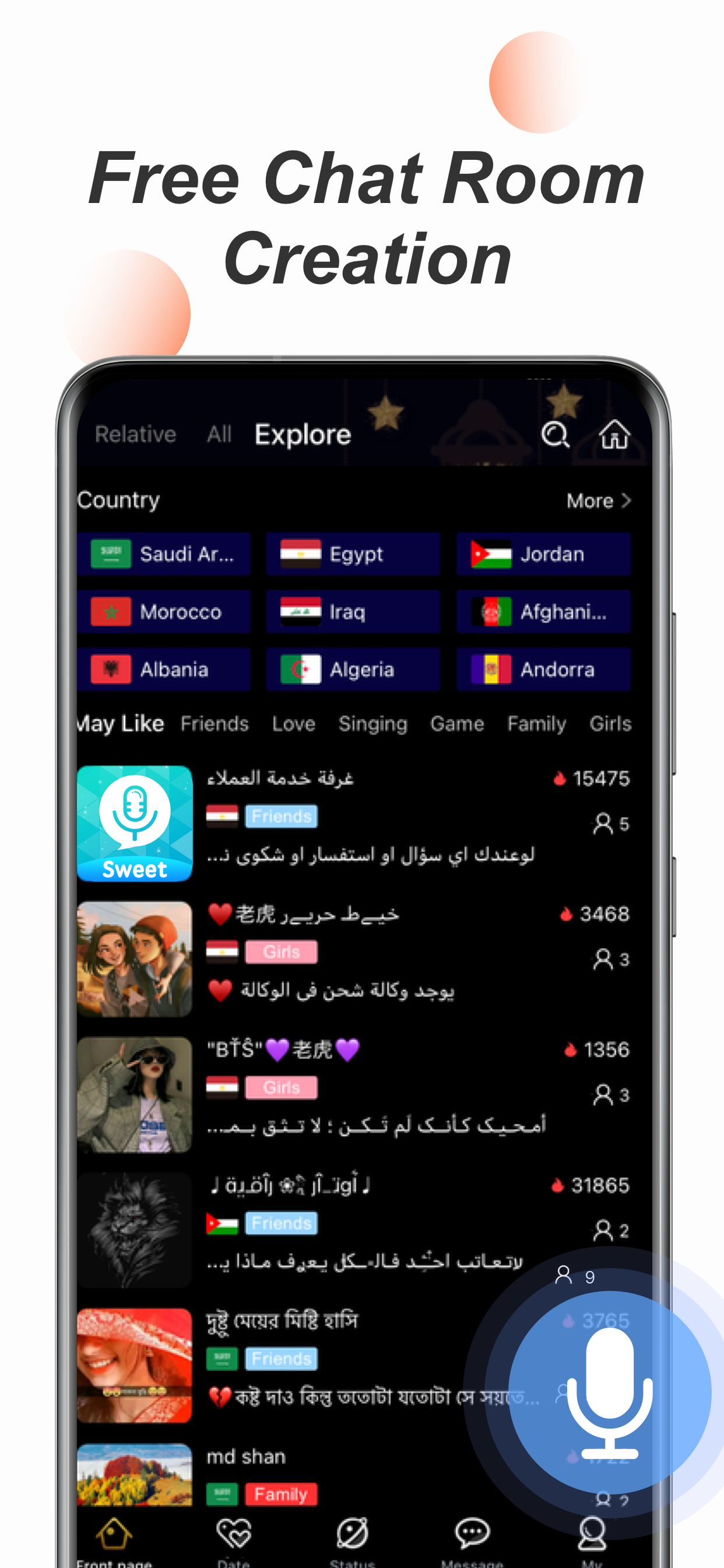 Sweet chat is the most popular voice chat room and private entertainment community, the coolest voice room created only for users in Saudi Arabia. Completely private voice chat room; In any case, you can quickly create an exclusive VIP room, you can invite new friends to chat together, or you can set up a private room to invite only your own friends. Individual theme, individual dress; Create an exclusive voice chat room style, show the most distinctive self, and let your friends exclaim for you. Make friends from all over the world; Quickly find public chat rooms nearby or around the world, quickly online meet new friends. Cool gifts, turn the audience Full-screen cool and exquisite gifts, special admission effects, become the most eye-catching person in the audience. Private conversation, speed make friends online; You can find the most friends in the shortest time, and conduct private text and voice conversations to each other Public post groups, share life and love; Publish posts, show your life, join topic chats, let more people know you, and have a friend follower list, and discover his new posts the first time. Open an online party to surprise the audience; A great place for online parties, birthdays, Eid al-Fitr, football, TV series, real-time comments on girl gossip, any topic is fine. Room game, new voice chat experience; Interesting game, you can play while chatting to see who is the best luck king! Dice, rock- paper-scissors, microphone position game, turntable, box opening are waiting for you to play with your friends, come and see who is the best luck king! Download SweetChat now! Create your own voice chat room and start an online party~