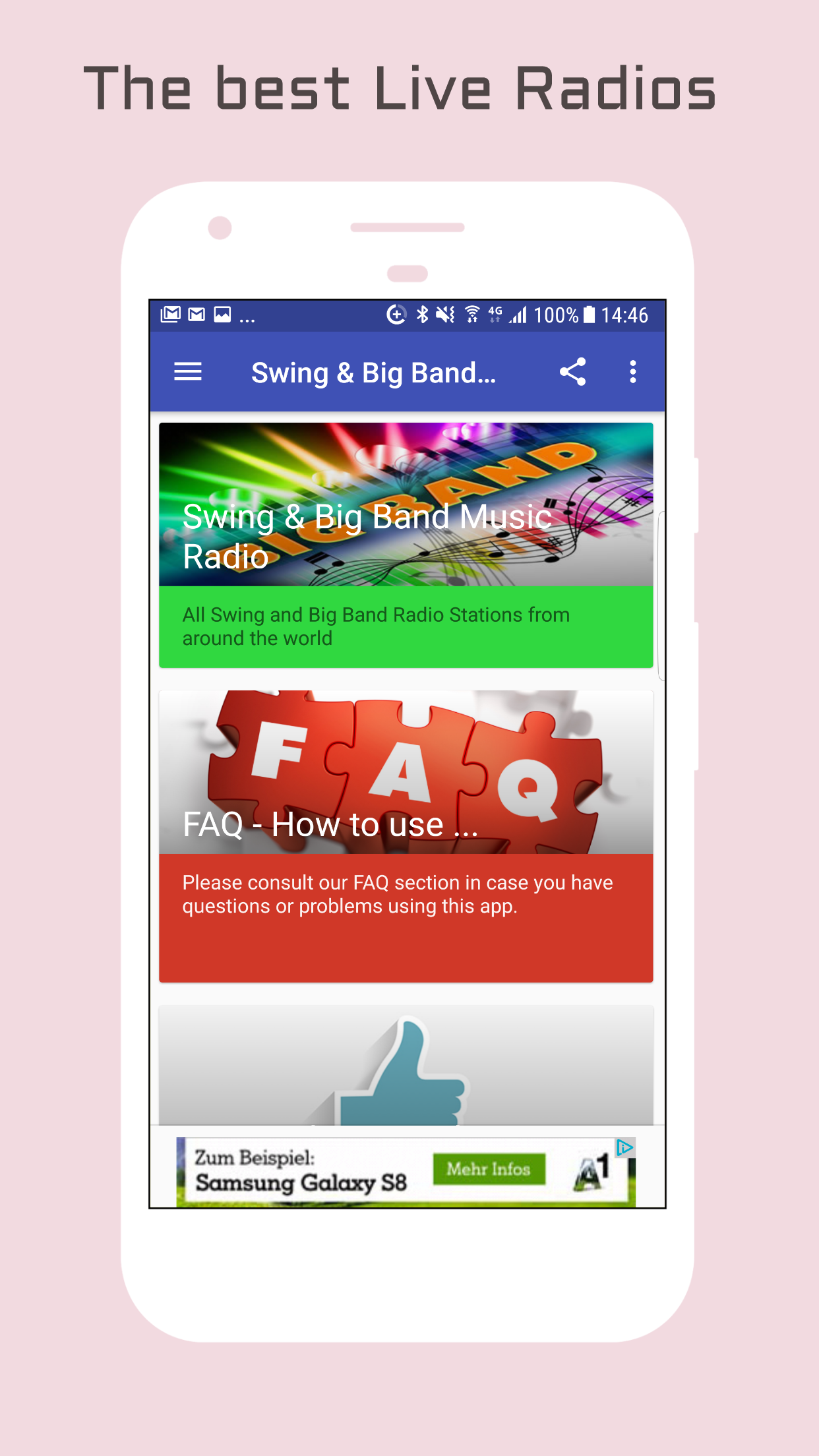 Get free access to the best Swing & Big Band Music Radio Stations. Wherever you are, the most Music from top Swing & Big Band radio stations from the 20s, to the 40s is with you! * Easy to use app! * Turns radio automatically off, when you receive a call! * This is one of the most complete App for Swing & Big Band Radio Stations. Some of the Swing & Big Band Radio Stations that are available in this app:. 101.ru: Swing 181.fm - Christmas Swing 1940s Radio 1jazz.ru SwingBigBand 90.9 Jazzy Radio AddictedToRadio - Big Band Cantina AddictedToRadio.com - Swingin Christmas' A-JAZZ-FM-WEB All Jazz Radio Big Band Classics Big Band Magic Big Blue Swing Bombshells Radio Calm Radio - Big Band Cladrite Radio Crystal Radio Beautiful Music Digital Impulse - Funk Swing Eure du blues Fred Hall's Swing Thing Global Swing Broadcast Sweden Inside Jazz The Mix Instrumentals Forever Jazz 20's Swinging 30's Jazz Radio Bcn Jazz Radio Electro Swing Jazz Swing Manouche Radio JazzKeyn Jradio laut.fm KBRD 680 AM KCEA 89.1 FM KDKI KISS Jazz K-JAZZY Linas Jazz Webradio Marches Radio Martini in the Morning MILED Music - Banda Moscow Boogie MR Jazz nofate PARADISO.jazz Planet Pootwaddle pulp-fm Radio Art - Big Bands Radio Art - Swing Radio Dismuke Radio Jazz Radio Nostalgia Amsterdam Radio Riel Dieselpunk Radio Sausalito Radio WCS - West Coast Swing RadioCrazy Jazz Schwany 4 Blasmusik Radio Sinatra 101 Sophisticated Easy Sounds Strict Tempo Dance Music Swing FM 101.2 Swing Street Radio Swinging Radio England Swinging Radio England 1 Swingsalon laut.fm Swingtime Radio Swissradio.ch Jazz Swing The 1920s Radio Network The Green Room The Original 1940s Radio Station The Penthouse Radio The UK 1940s Radio Station The Vine 92.3 VH Big Band Vintage Broadcast Wdbf.fm WKHR 91.5 FM WMKV 89.3 FM WRDV 89.3 FM WRIV 1390 AM