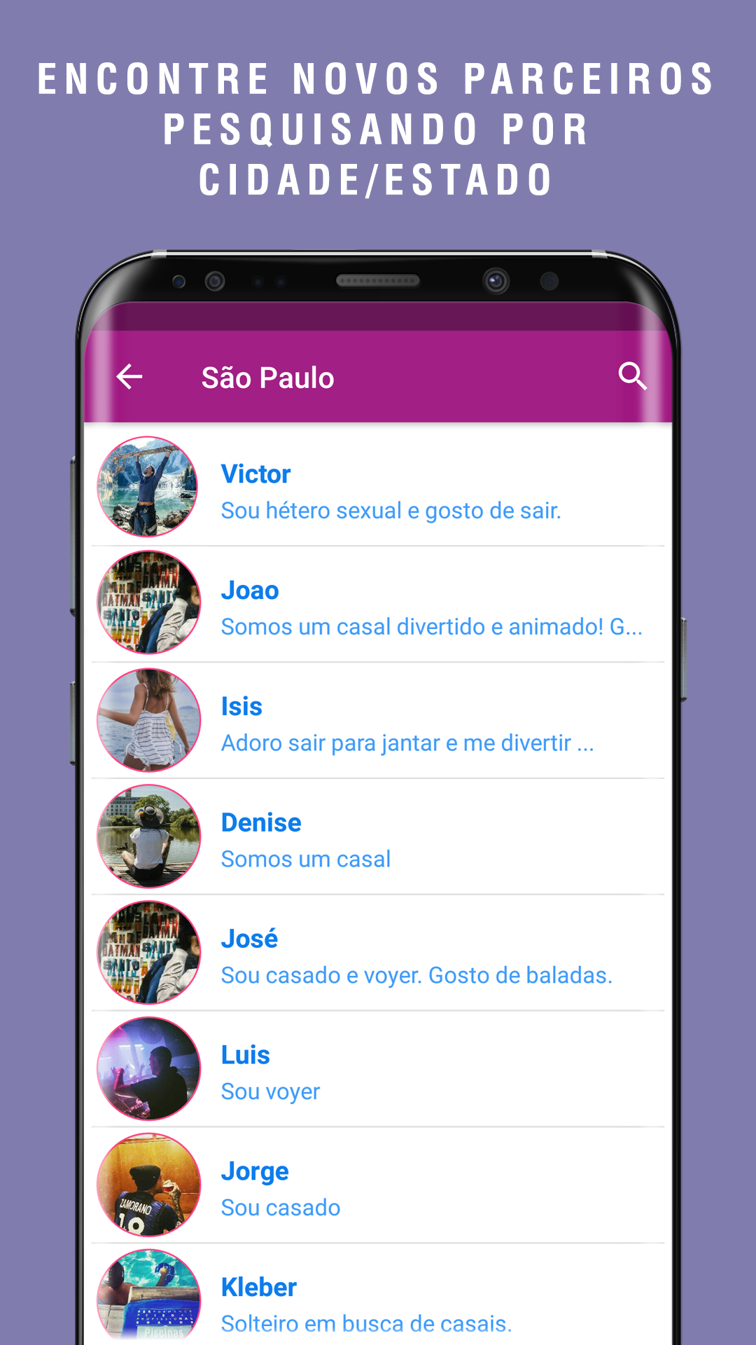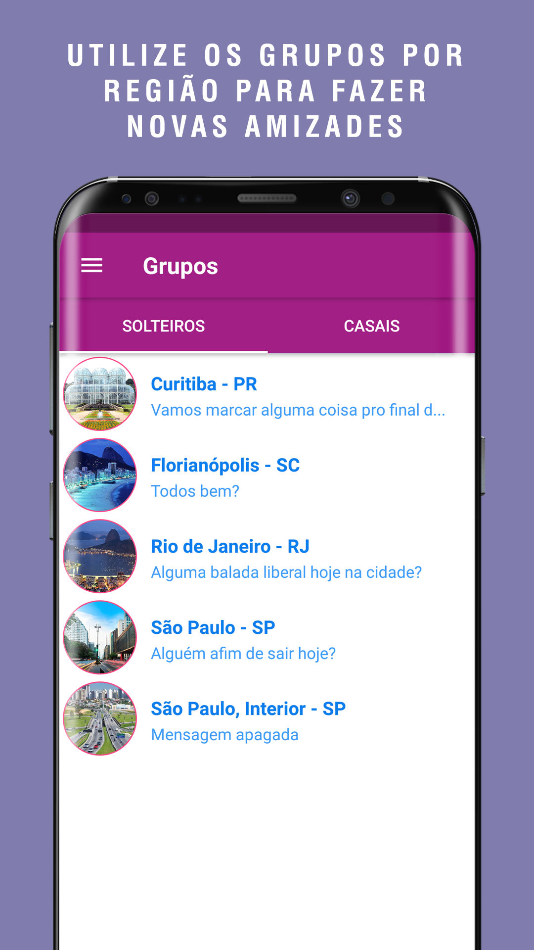 - Busque casais ou solteiros por distância num raio de 50KM (Plano Free) até 200KM (Plano Premium)