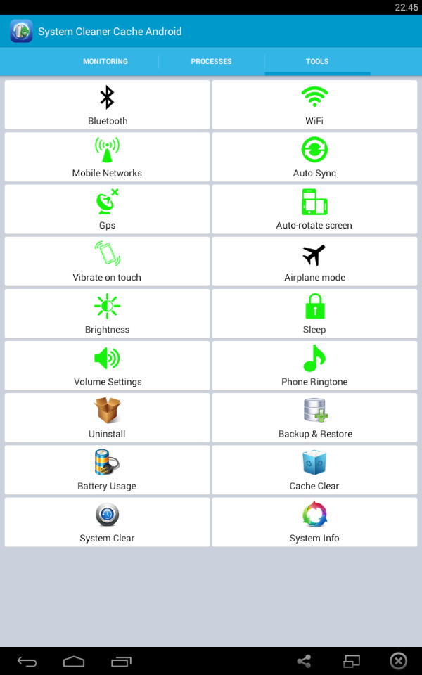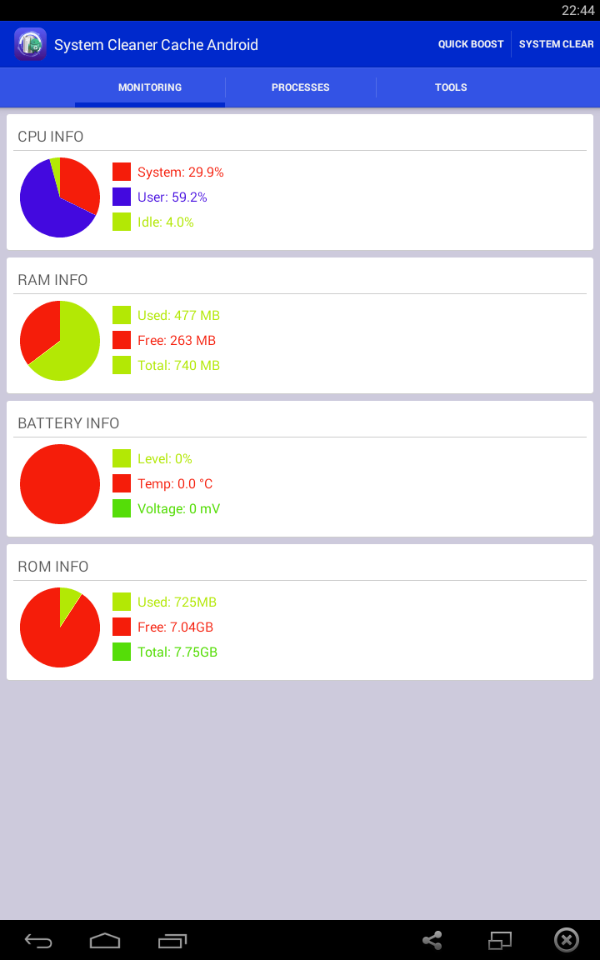 System Cleaner Cache Android is one of the system utility tool that improves your androids performance Cache Cleaner. Zinc heightens your phones performance and saves battery existence. Apparently which improve your system os and memory. Additionally, it has process manager which allow you to clean system running applications. It incorporated with Backup & Restore feature which help you backup applications as apk file and restore when you really need them.System Cleaner feature cleans Cache, Thumbnail Cache, Log File, Empty Folder, Browser History, Clipboard, Market History, Gmail History, Google Map History.Function: Monitor status (CPU, RAM, ROM, SD card, Battery) Process Manager (Clean Running Process) Cache Cleaner System Clean (Cache, Thumbnail Cache, Log File, Empty Folder, Browser History, Clipboard, Market History, Gmail History, Google Map History) Power Saver (bluetooth, wifi, gps, auto-sync, auto-rotate screen, screen brightness, timeout) Battery Usage Clear the cache for all applications Clear System process Clear browser history Clear up the clipboard data Clear call records Clear market search history Clear Gmail's search history clear Clear Google Maps search history Clear Google search history App Uninstall Volume Control, Phone Ringtone, Screen Brigthness, Sleep Time System Info APK Backup & Restore The most convenient system cleaning tool!