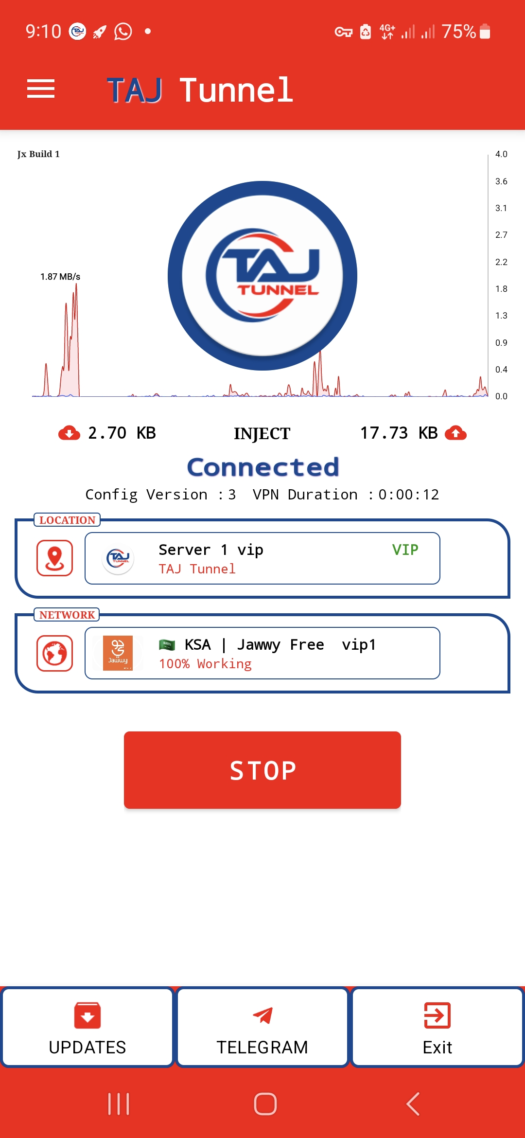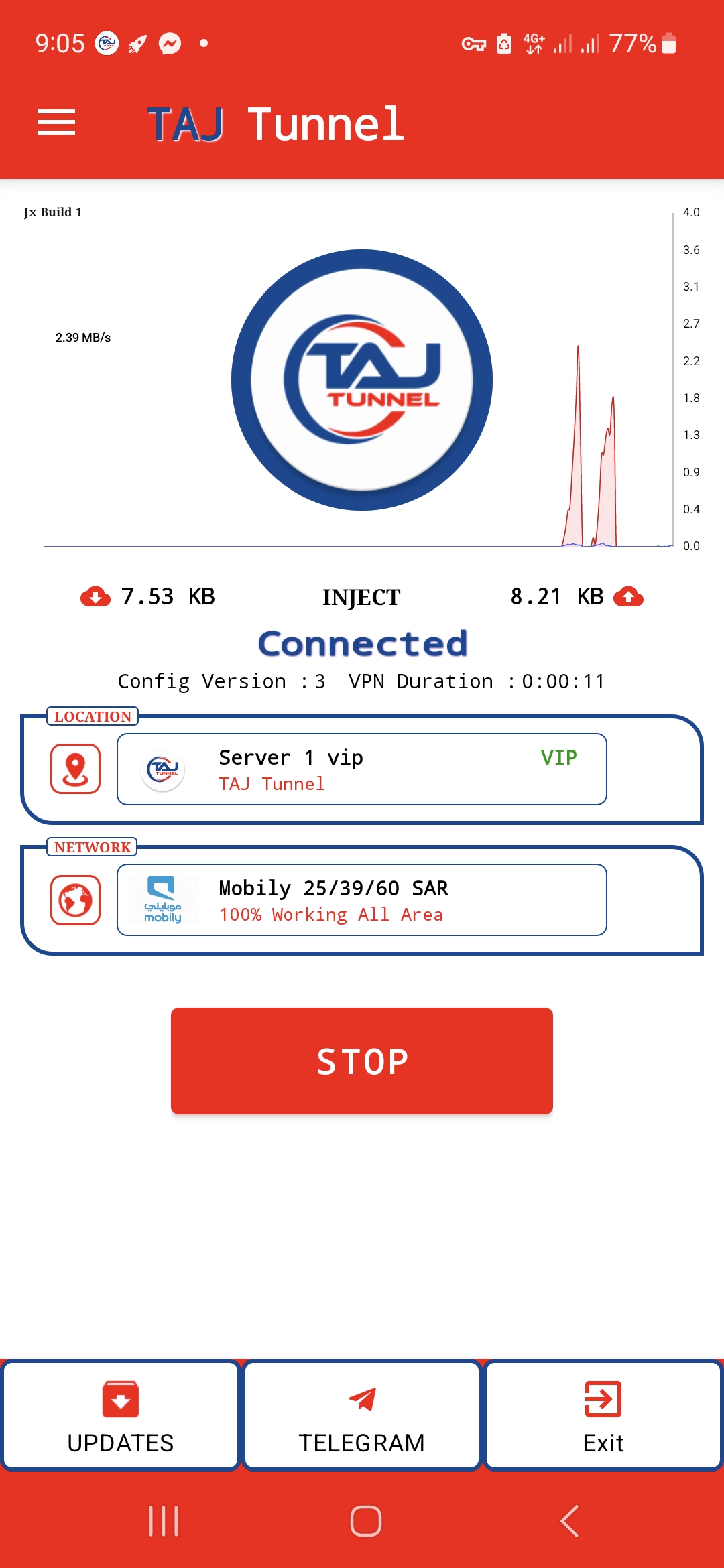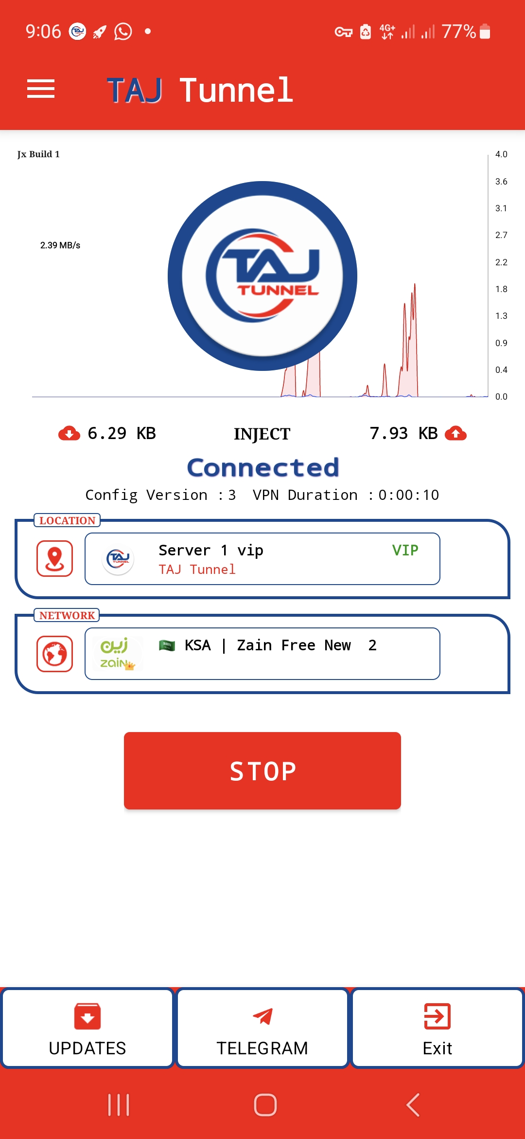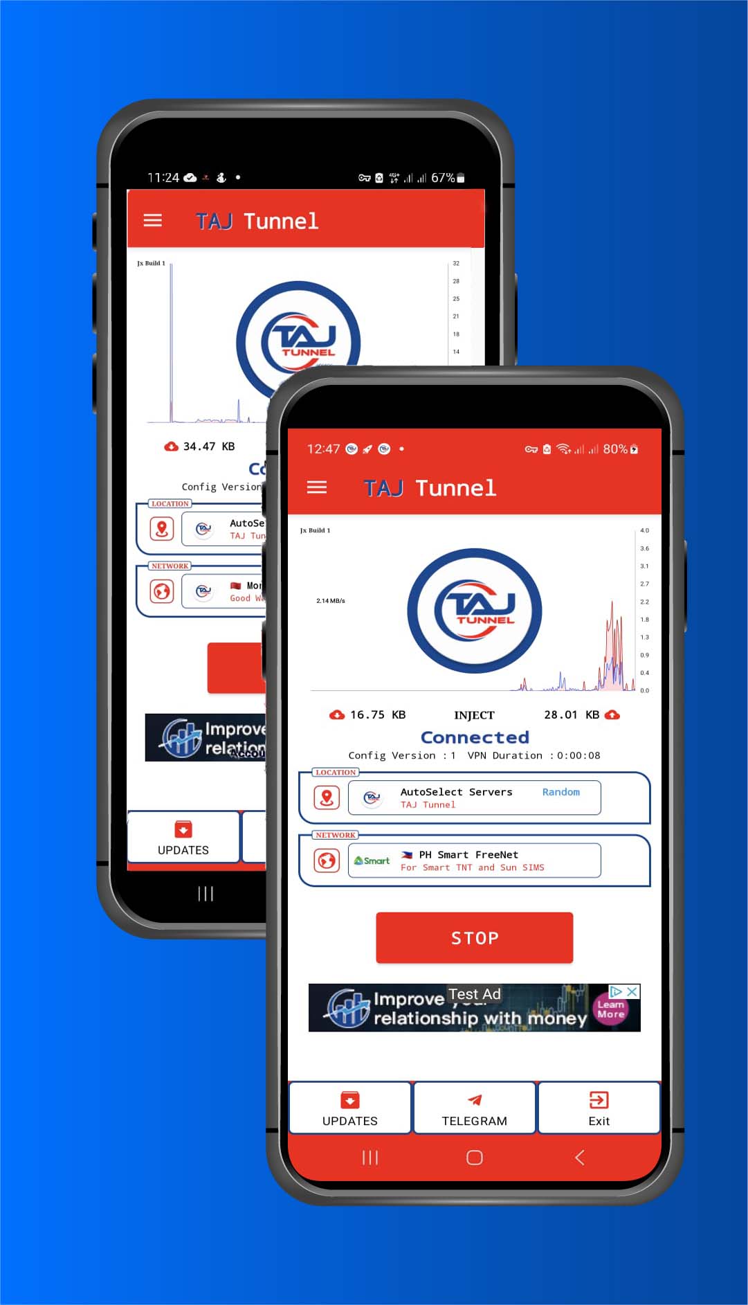 Taj Tunnel is a A Lightweight High Speed HTTP Tunnel for Android using HTTP CONNECT Method [ This Application is available many countries] Taj Tunnel Features A super fast HTTP Tunnel using HTTP CONNECT Method Low RAM , Battery consumption High Speed Works good in low speed mobile network Change your location ; Protect your privacy. Tunnel Server location in multiple countries. All Servers are deployed in 1 Gbps network. A simple and easy to use tunnel for your phone and tablet. This App needs a few permissions including: Access External Storage.( Optional ) Access CAMERA.( Optional ) Access Network.