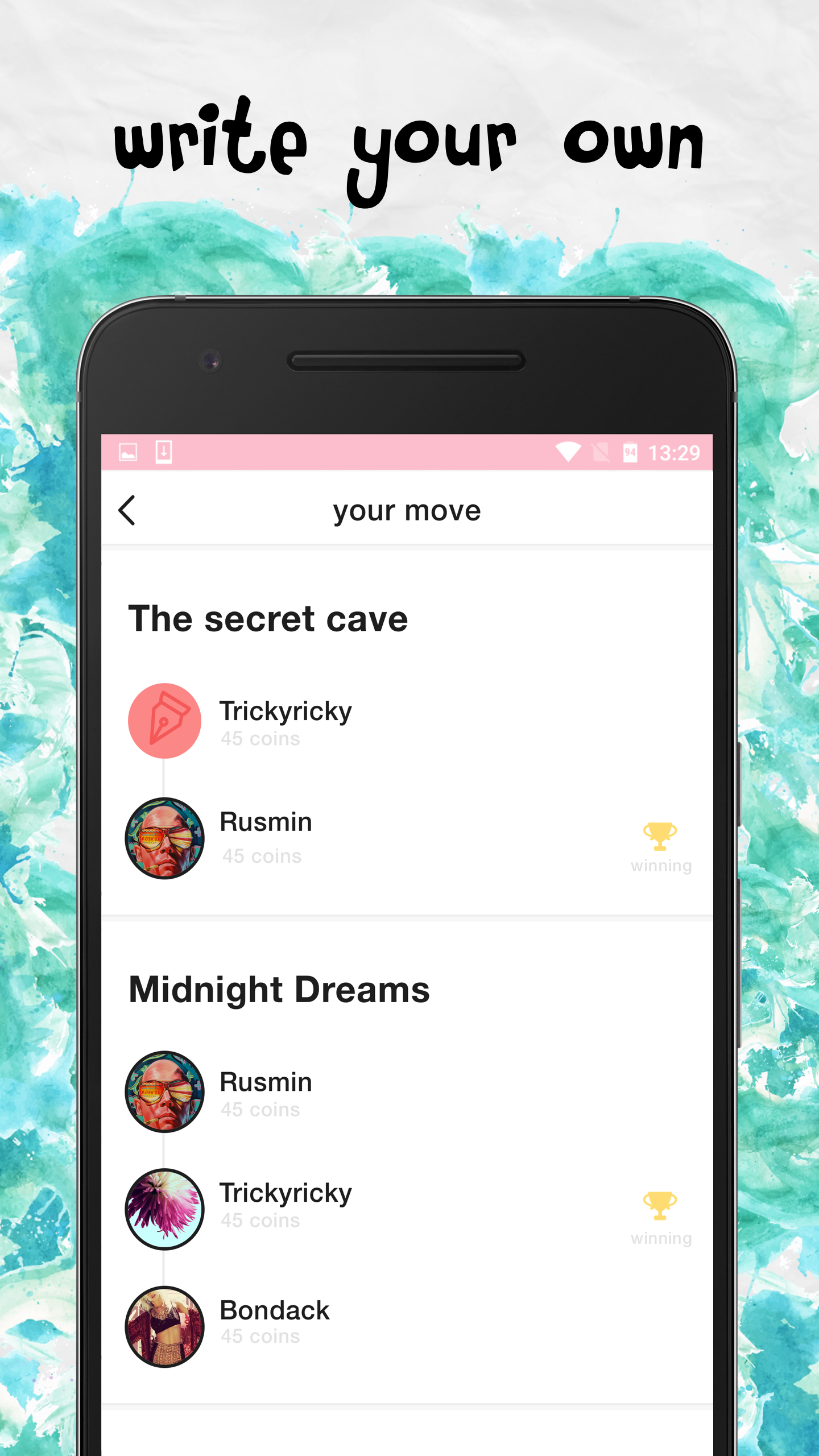 Every story on TaleAStory is created by having 2-10 authors write a story together. You take turns writing 260 characters per move. After 28 moves the story is finished and published for the whole world to read. Unless you set your story to private of course. Share your stories from your imagination or life. Use the messenger in stories to talk to your co-authors and make new friends. If you prefer writing stories alone, then thats also possible :)