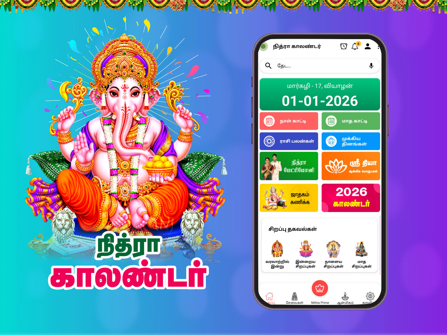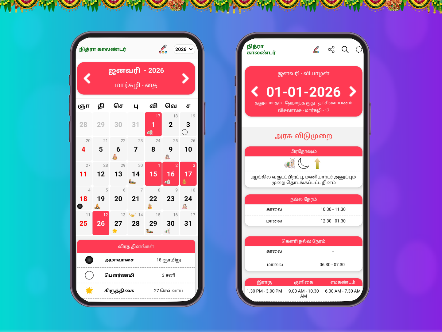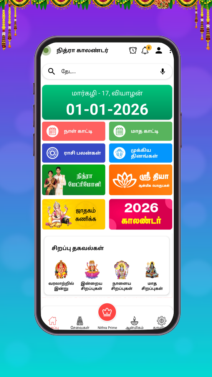 We are happy to release our Nithra Tamil Calendar 2026 offline App. 'Tamil Calendar 2026' has been entirely updated with all the information like 2026 Calendar, Rasipalan, Holidays, Festivals, Subha Muhurtham etc., '2026 Tamil Calendar' app is for Tamil people which is available in offline mode. Users can view the complete details of Daily Calendar as well as Monthly Calendar in Tamil.