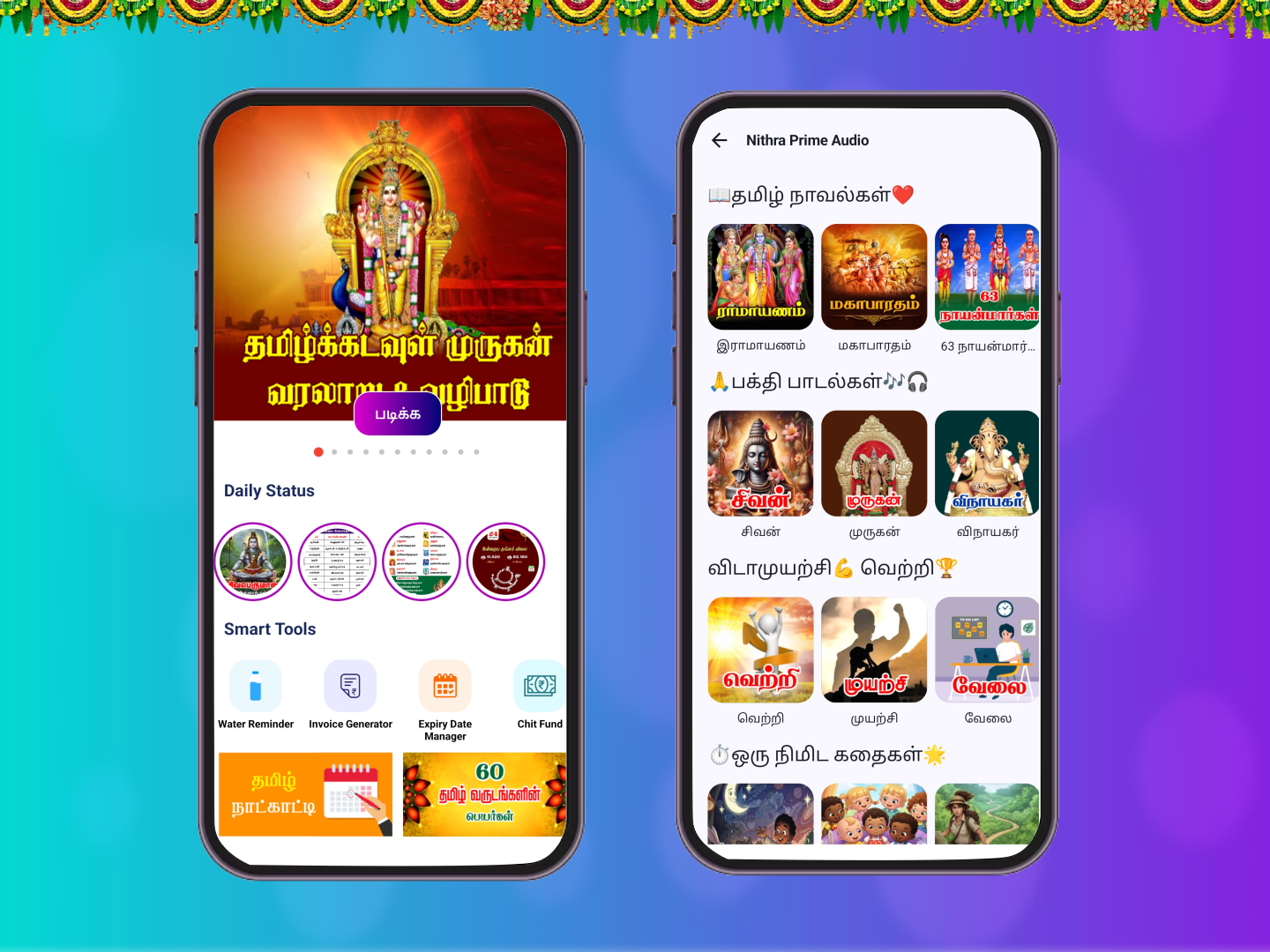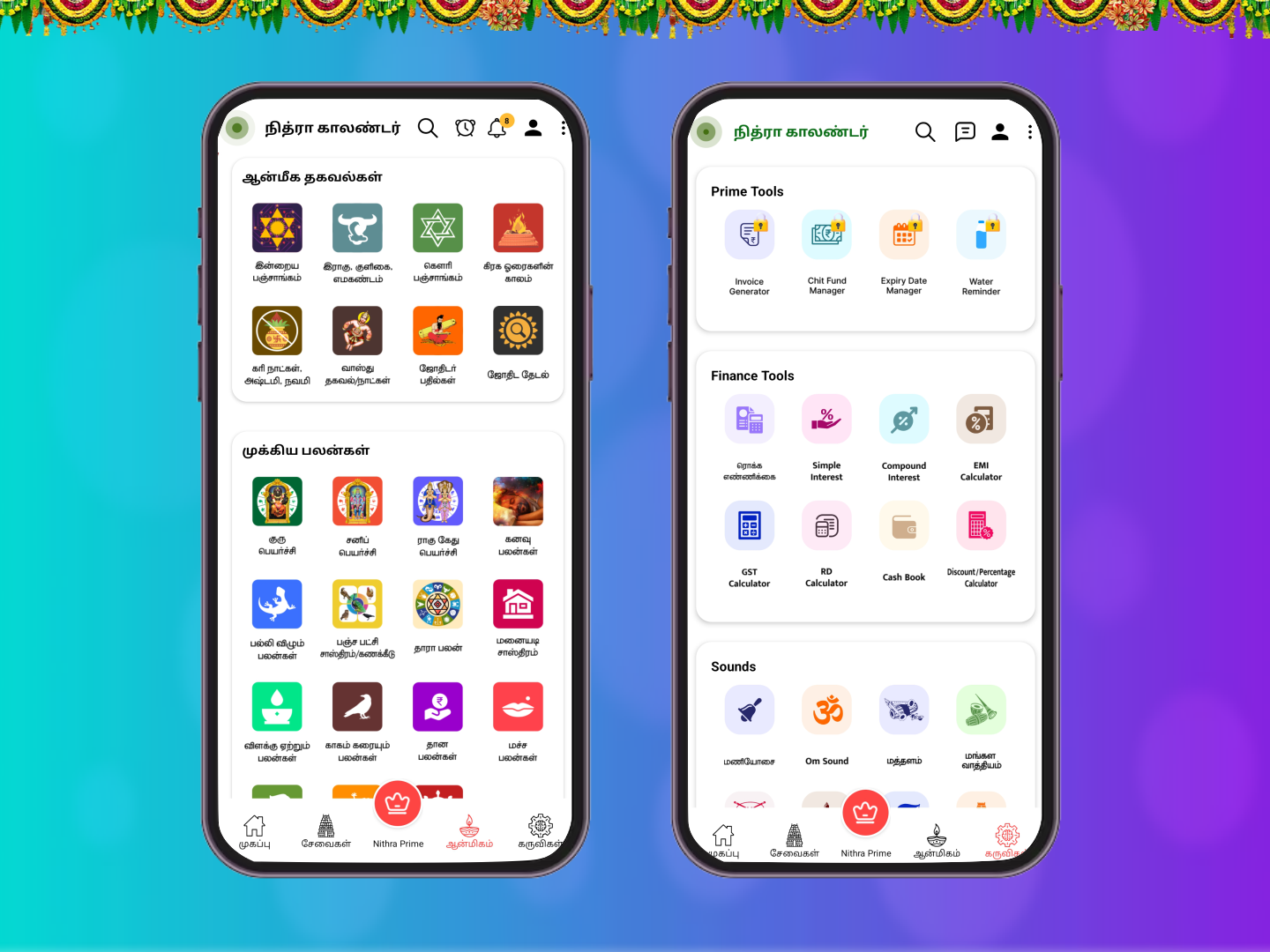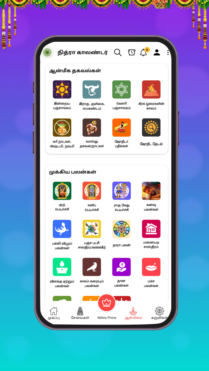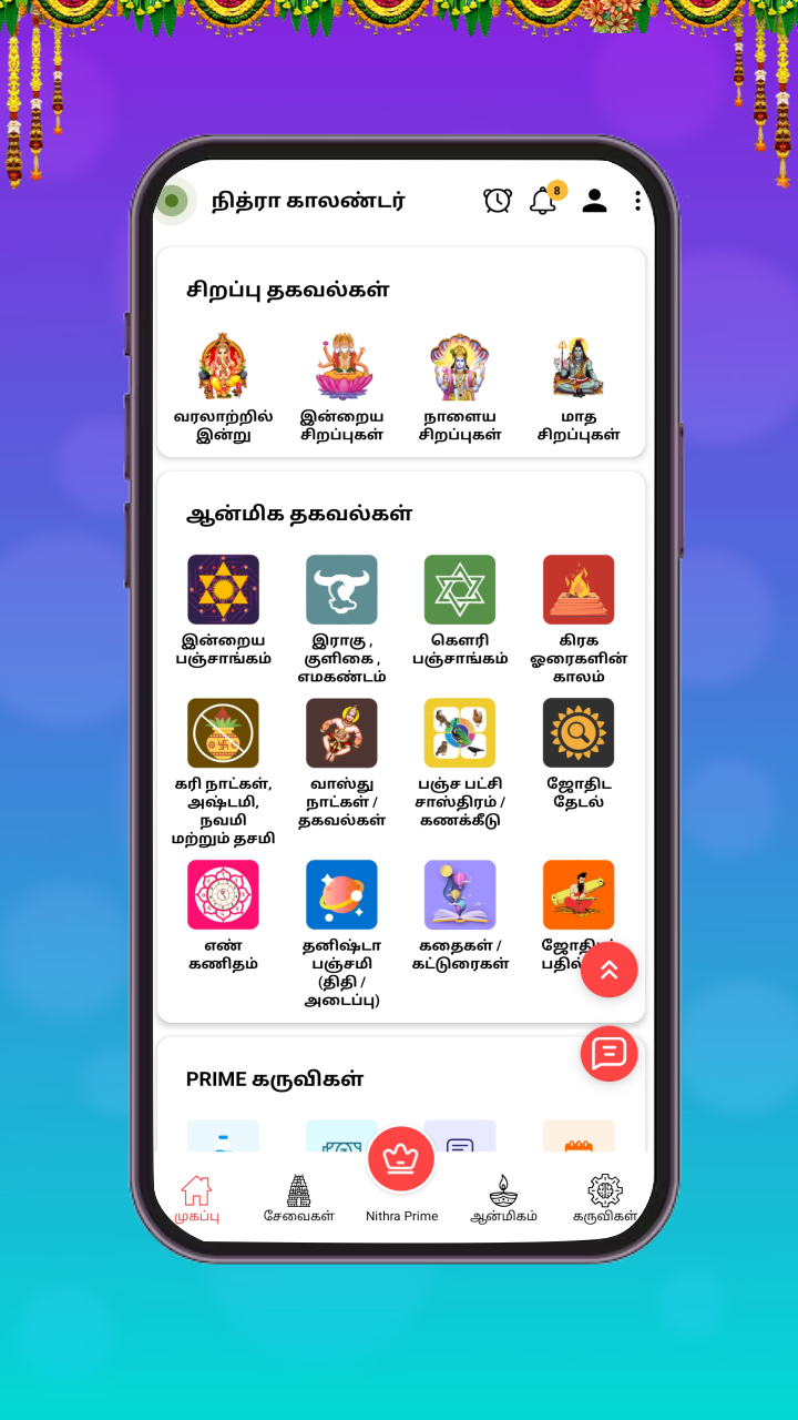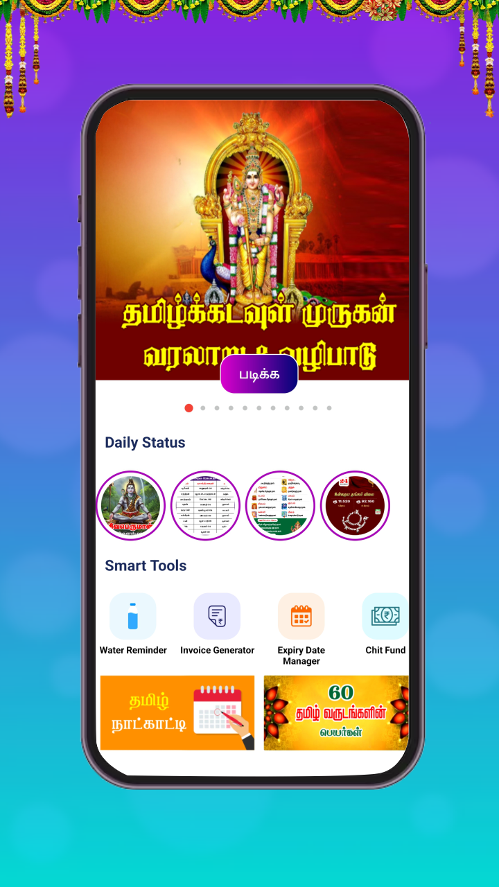Jothidar Pathilkal, Parikarankal, Thirumanaporutham (Marriage Matching), Kanavu Palankal, Macha Saasthiram, Palli vilum palankal, Manaiadi Sasthiram, Kiraka peyarchi palankal, Kakam karaiyum palankal, Ramayanam, Ponniyin Selvan, Mahabharatham, Thara palangal, Thirukkural, Baby Names in Tamil, Vaazhthukkal, Age Calculator, Age difference, BMI Calculator, Cash Tally, Market Rate, Guru Peyarchi Palangal 2026, Shop List maker, Jothida Kelvi Pathikal, IFSC Codes, Road Rules, Invoice Generator, Chit Fund Manager, Expiry Date Manager, Water Reminder, Moi Calculator, Thiti and Astor Calculators.
