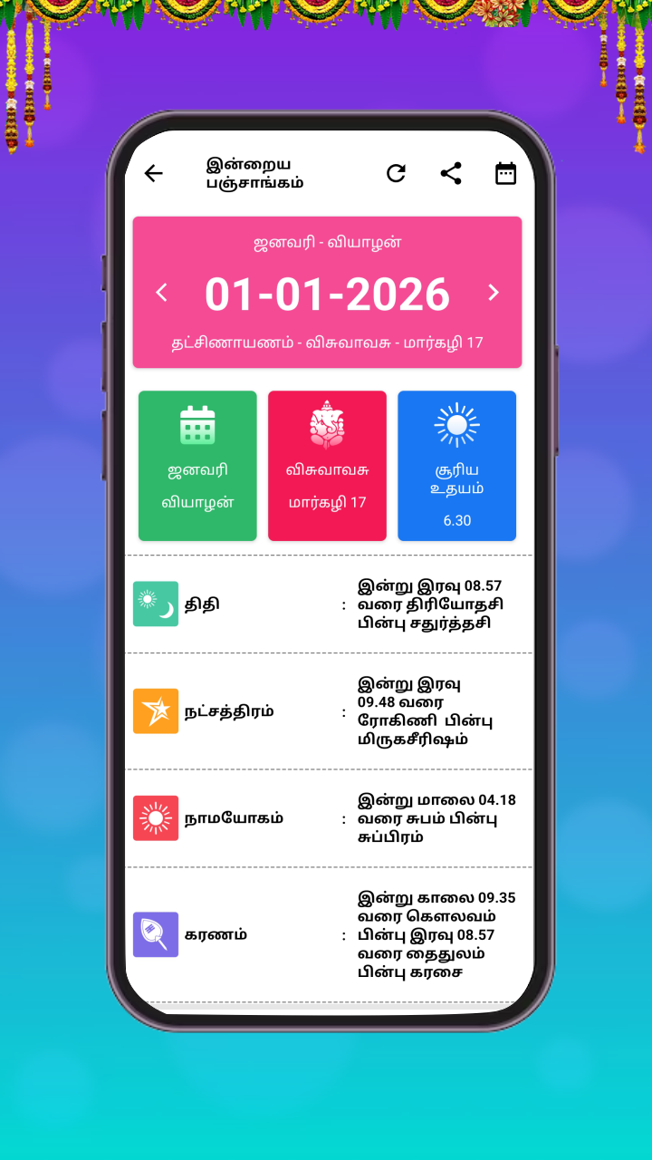 7. Displays the auspicious days, Rahukaalam, Yamakandam, Kulikai, and Rasipalan of the day with sharing option in Tamil Calendar Panchangam app