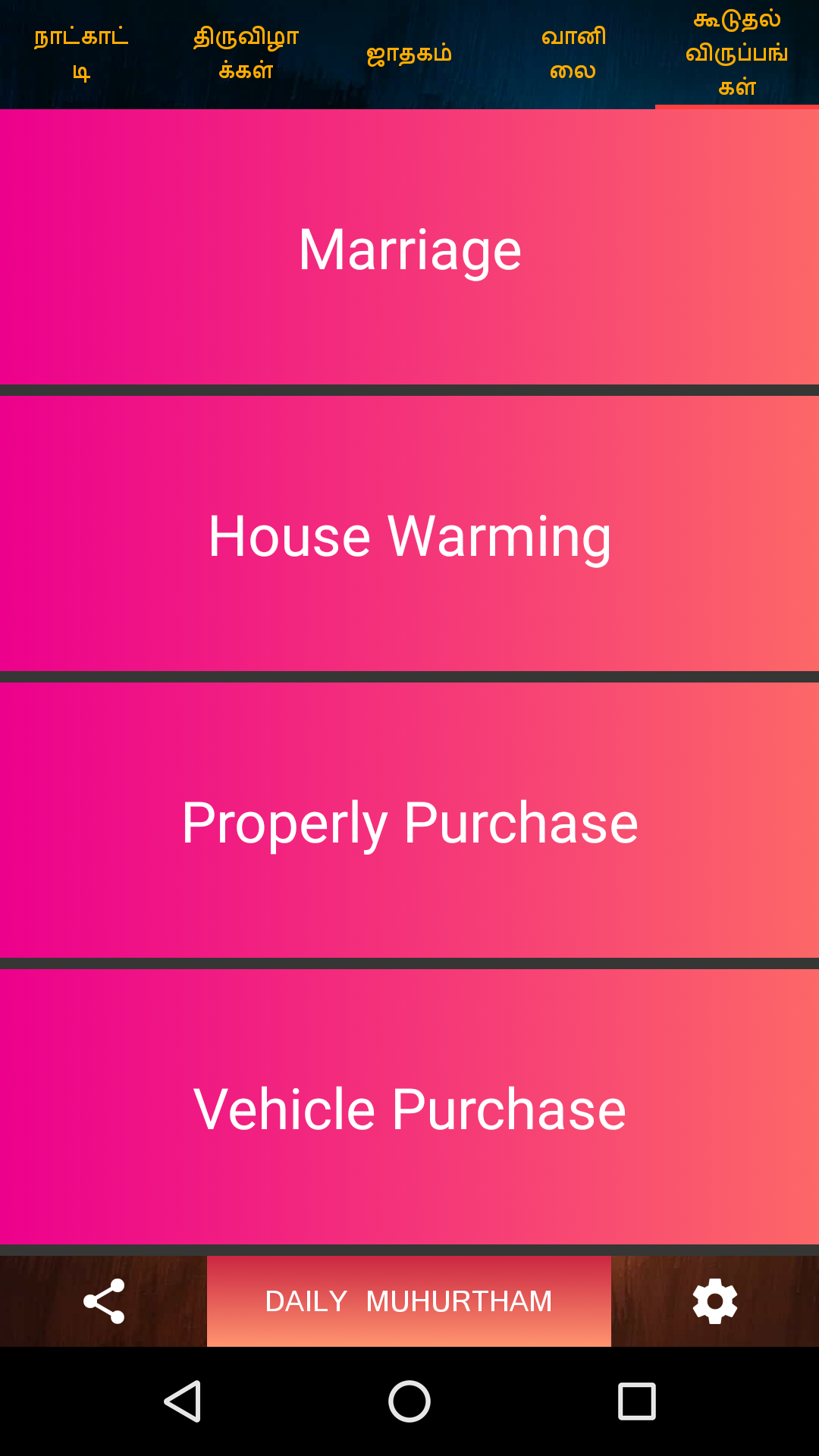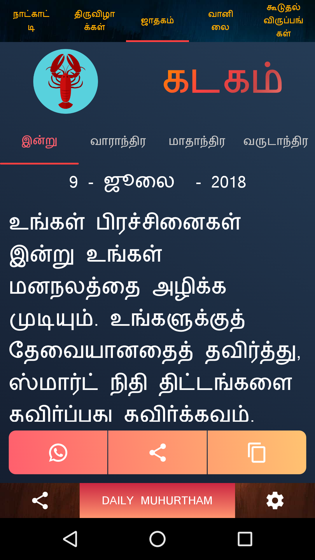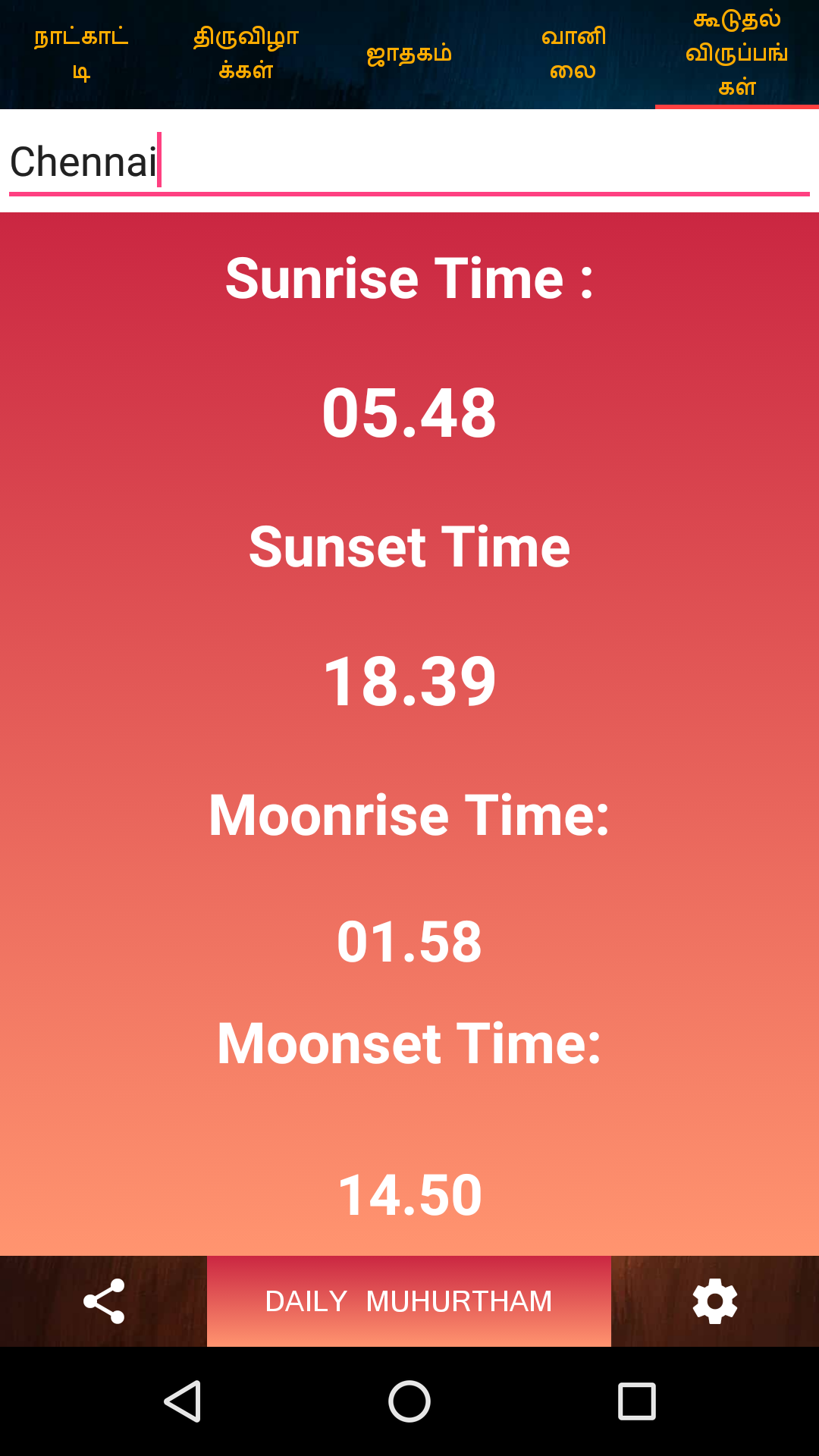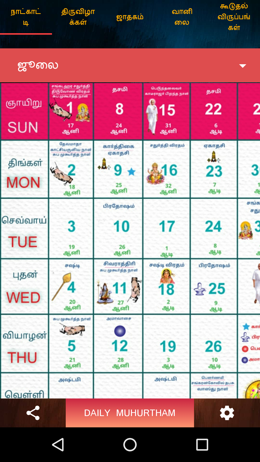 Tamil Calendar 2019 - Panchangam 2019 with All Festivals, Rasipalan, Sun/Moon Timings. Audio Rasipalan (Daily, Weekly, Monthly, Yearly). Aap apna Rasipalan Tamil me sun sakte ho. Weather Information Full Tamil Calendar Panchangam of the year 2019 with all the Tamil festivals, Tithi, Vaar, Paksha, Karan, yoga, rahukal, dur muhurat, hora, Nakshatra in Tamil. Daily Rasipalan, Weekly Rasipalan, Monthly Rasipalan, Yearly Rasipalan. Any Date Choghadiya. Day and Night Choghadiya. Any year, any month. s Sun/Moon Timings of different cities. Tamil Calendar with list of all festivals. Features : - Any year, Any Date calendar - Click Calendar - Tamil and English both Language Available - Muhurat and Festivals for all Years - Automatically selects current month. - You can view your today's Rasipalan, weekly Rasipalan, monthly Rasipalan and yearly Rasipalan. - You can check out timings of sun/moon. - Tamil calendar 2019 contains details of Tamil festivals, tithi, public holidays and other key events. - Tamil calendar contains Holidays list 2019 - The calendar will help you find when the next Ekadashi is, what the Paksha (Sud,Vad) on a particular day is, when the next Poonam is (Full Moon) or the next Amavasya is.
