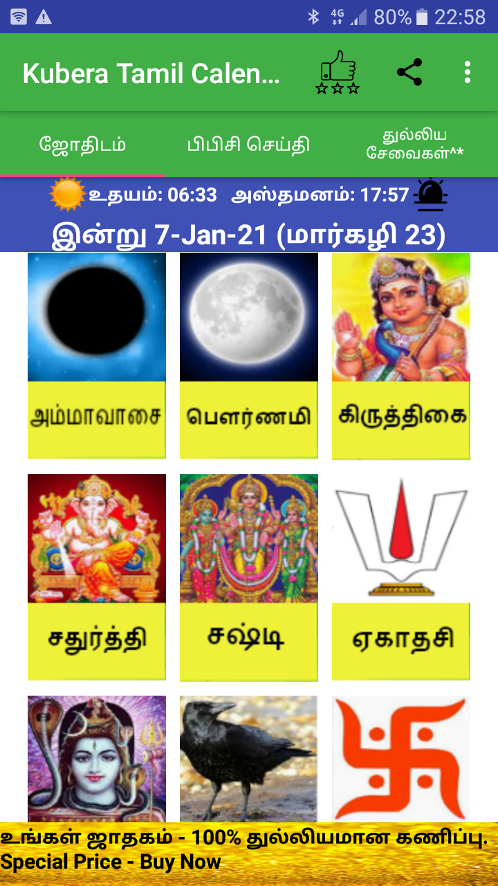 Tamil Calendar 2026 Kubera Tamil Calendar 2026 is a Tamil calendar app to check daily calendar, monthly calendar, rasi palan, jathagam and panchangam in tamil language. This app can work in offline mode and without internet access you can check the Tamil Calendar 2026 and 2025 details quickly and easily. Kubera Tamil Calendar team have taken extreme care in giving the best தமிழ் காலண்டர் 2026 features. Features of our Tamil Calendar: This is a free Tamil calendar software which has the following details: Daily Calendar: Every detailed information about the day is listed in this daily calendar in tamil 2026. Planning your day properly with our தமிழ் காலண்டர் இன்று is more important to acheive succcess. This Tamil calendar app with full details explains about the paricular day which will be very useful in making a good plan for the day. Dina calendar has the indraya nalla neram, natchathiram, rahu kalam, valarpirai, theipirai, melnooku naal, keel nooku naal, tithi. Also to plan the day properly (இன்றைய நாள் எப்படி) one word calendar rasi palan along with gowri nalla neram, chandrashtamam and yogam are specified in the tamil daily sheet. Our நாட்காட்டி is very carefully designed. Tamil Date: All tamil months like chithirai calendar, vaigasi with corresponding dates in tamil are given. Monthly Calendar: Tamil matham calendar has an overview of all the 12 months. This is a free tamil month calendar app. Tamil Panchangam - 100 year calendar tamil: Information about panchangam today, tomorrow or any day in 100 years of time is given in this 100 varuda calendar in tamil. தமிழ் காலண்டர் பஞ்சாங்கம் was checked by our ancestors to fix wedding dates, grahapravesam dates and much more. It is a beautiful calendar for year 2026. Rasi Palan Daily, Monthly, Weekly and Yearly horoscope can be checked instantly using this app. This Tamil Calendar in English will be useful to all tamilians throughout the world. Viratha Natkal: List of government holidays, bank holidays, festival days, hindu festival, christian festivals, muslim festivals are listed. Download this தமிழ் காலண்டர் and get updated everyday. The following list of viratha dhinankal such as: Ashtami Navami Calendar, Amavasai Pournami Calendar, Sivarathiri, Chathurthi, Kirthigai, Sashti, Ekadesi, Pradosham calculator and much more are available in this Tamil calendar 2026 with rasi app. Nalla Neram Tamil: Before starting any work checking for nalla neram calendar will bring in good results. Subha horai in tamil: Given for all the days of the week. Graha horai like guru horai, sukra horai calendar and all the good auspicious. Checking auspicious time or சுப ஹோரைகள் will make the work move on smoothly. Gowri Panchangam: Many astrology scholars use this கௌரி பஞ்சாங்கம் to make their predictions and calculations. This feature is available in our app. Subha Muhurtham 2026 tamil: list of sunday and valarpirai muhurtham can be used to check for good day and time for wedding. Gowri nalla neram is checked before the start of any work. சுபமுகுர்த்த தினங்கள் 2026 are listed . Tamil Jathagam by date of birth and time: This app has Computer Jathagam by date of birth and time for free along with காலண்டர் details. Jathagam can be predicted easily with this app. This is a 2026 horoscope app. Thirumana Porutham Tamil: It is very essential to check Jathaga Porutham for marriage to lead a happy married life. Horoscope Matching analyses compatiablity between the girl and boy. Kanavu Palangal, Palli vilum palangal, kai regai josiyam, Macha Sastram and many other basic palangal are detailed. Vasthu Sastram, numerology, Yoga, Manayadi Sastram Tamil, pambu panchangam are given in this app. Kubera Tamil Calendar has all the best to make 2026 a good time and lucky year. Install this useful Tamil calendar download for free. Tamil Nadu Public Holidays and tamil festivals are added.